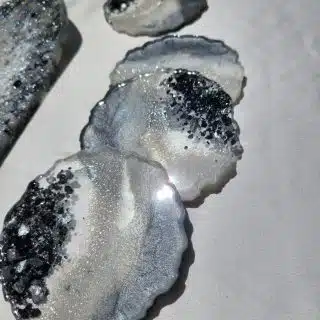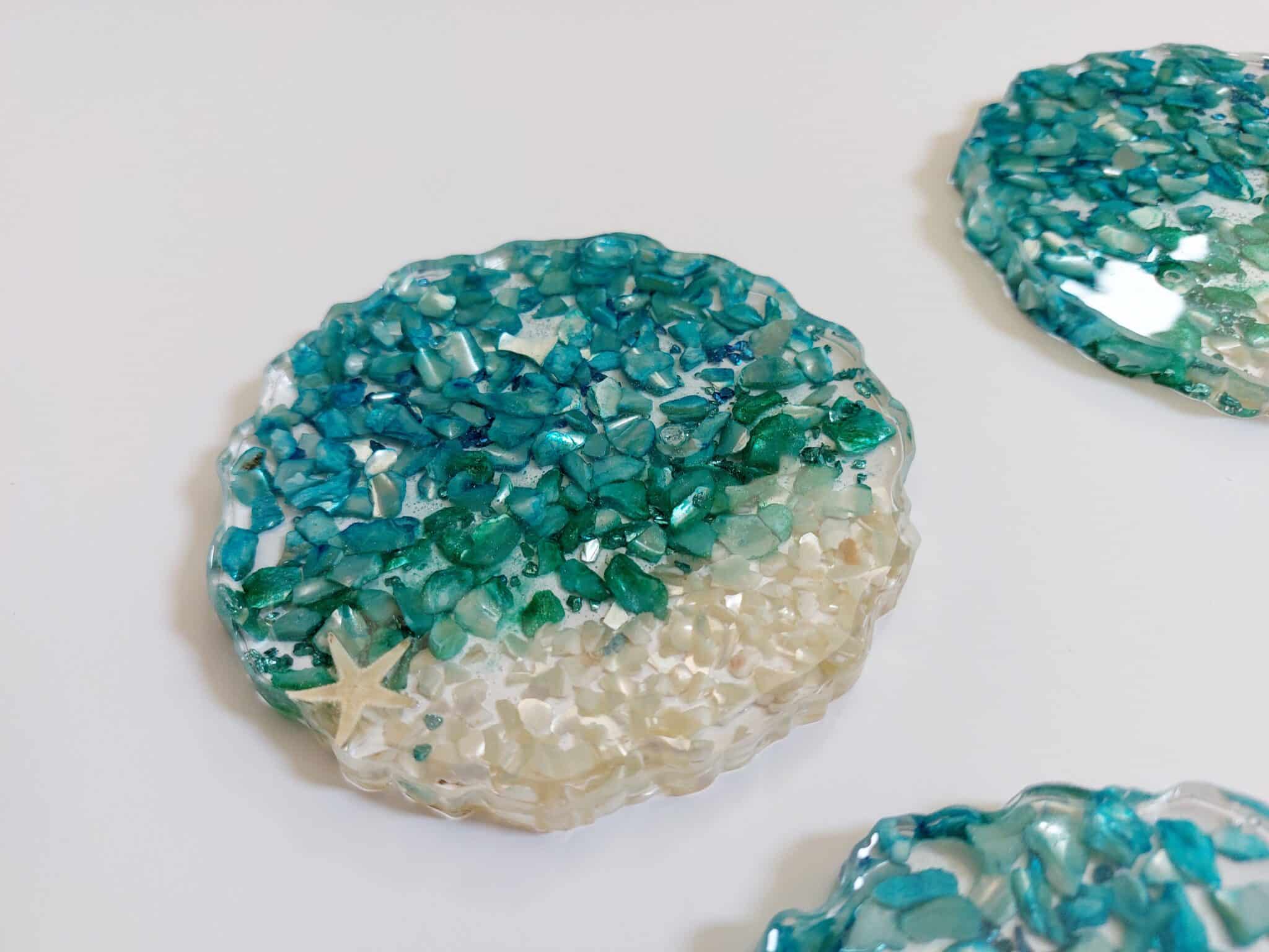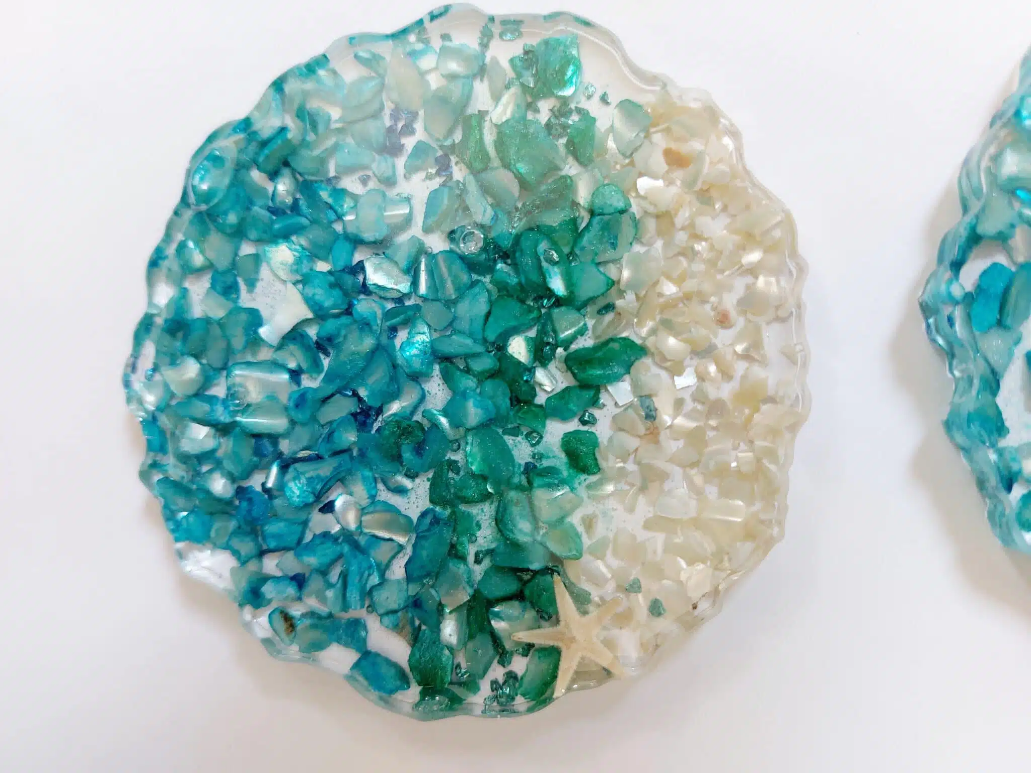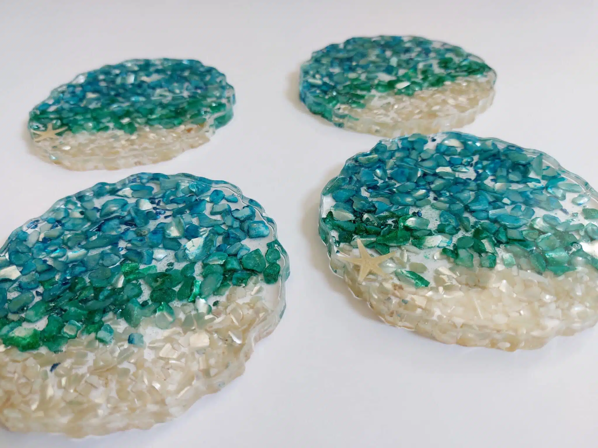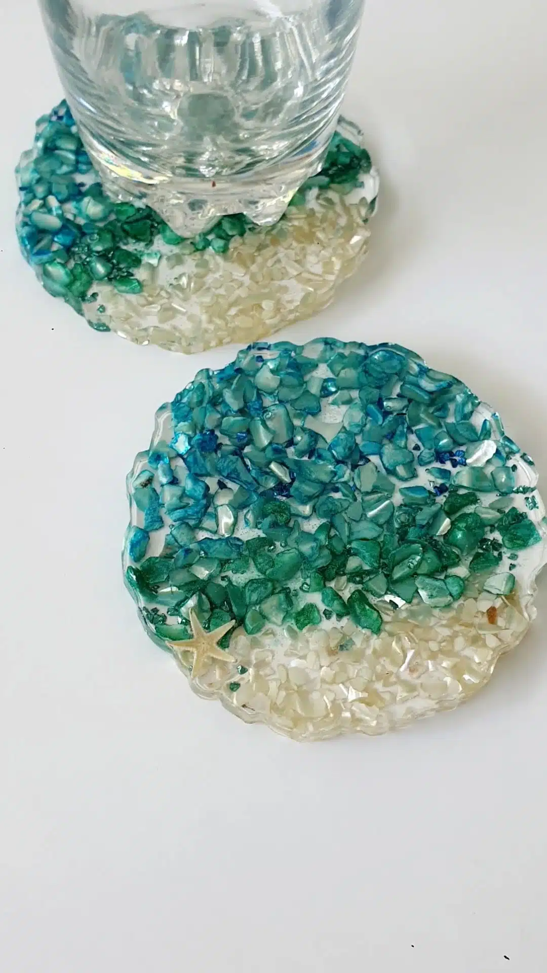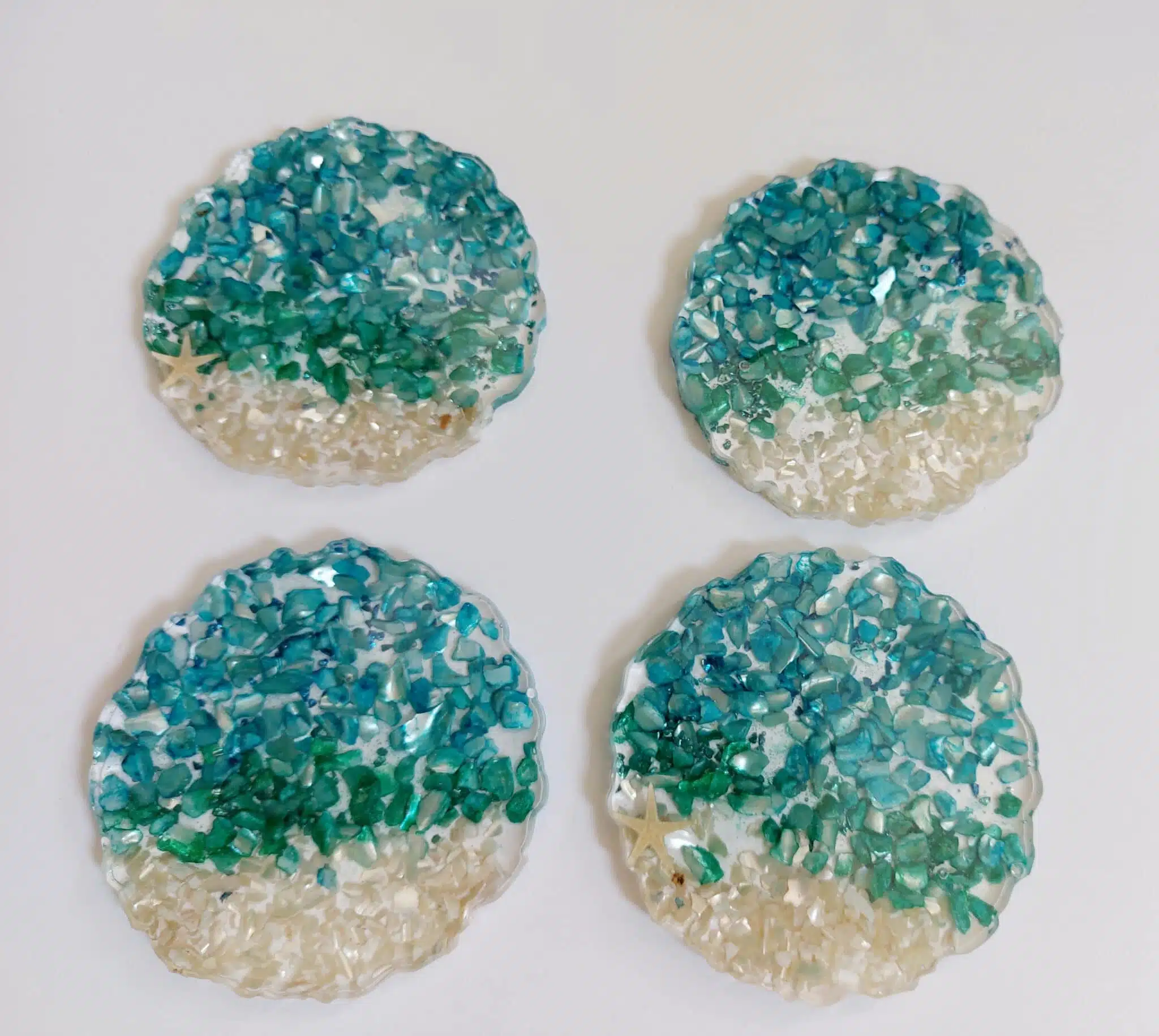 100% handmade coaster set of 4 pieces with holder from resin ans seashells ..that could be used to serve hot and cold drinks or simply a piece of art to decorate your table or wall, round freeform shape, approximately 10 cm. Handmade using epoxy resin that is food safe.