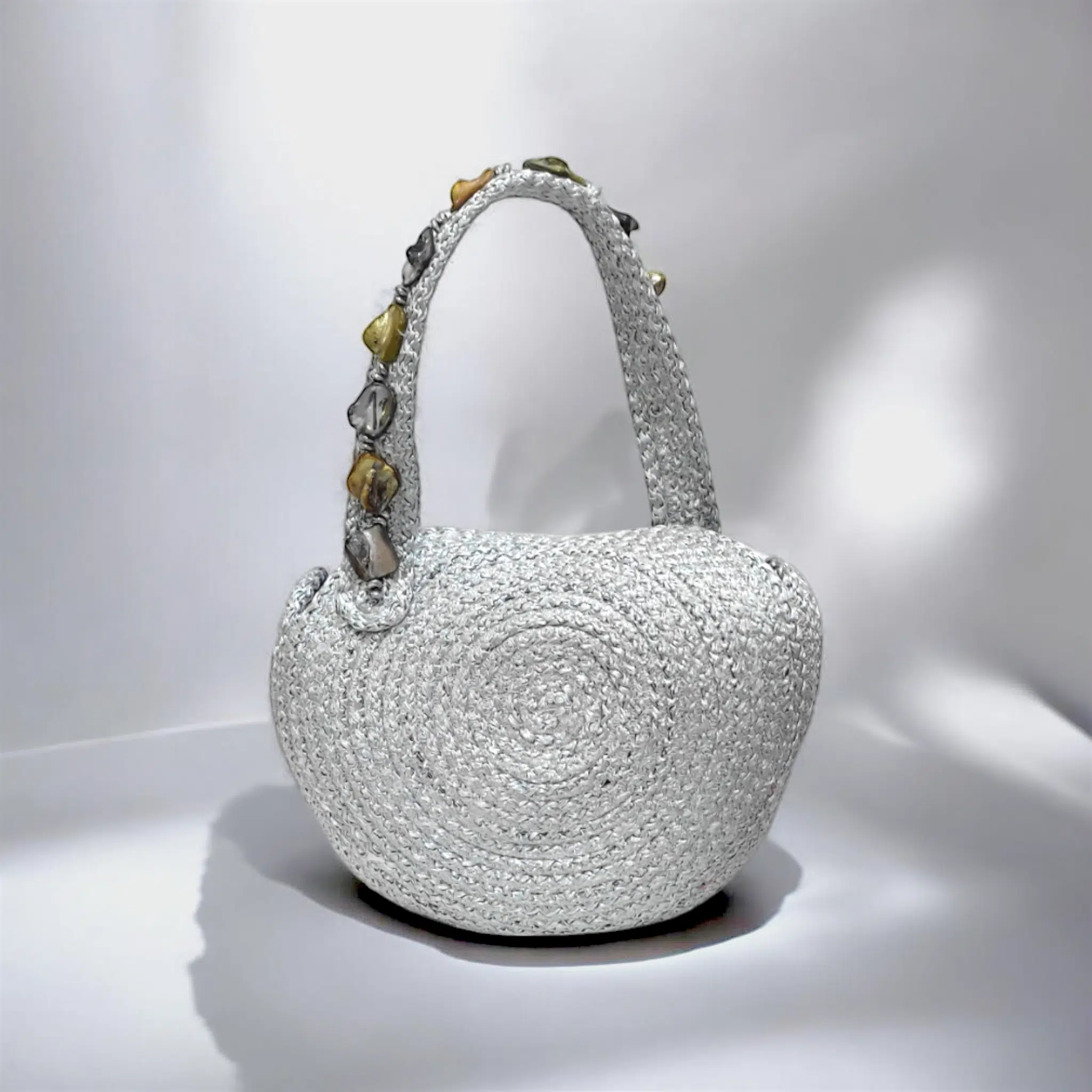a masterpiece of elegance and sustainability. Handwoven with luxurious silk yarn and accented with natural elements, this bag is a true celebration of artisanal craftsmanship and timeless style. Perfect for those who value beauty with a purpose.
