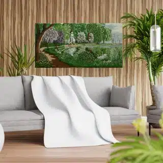 This stunning needlepoint artwork captures the beauty of a bluebird perched among white blossoms, surrounded by lush green foliage. The intricate stitching and vibrant color palette bring the bird to life, highlighting its delicate details and natural elegance. The harmonious blend of blues, browns, and greens creates a tranquil and inviting atmosphere, making this piece a perfect addition to any nature-inspired décor.