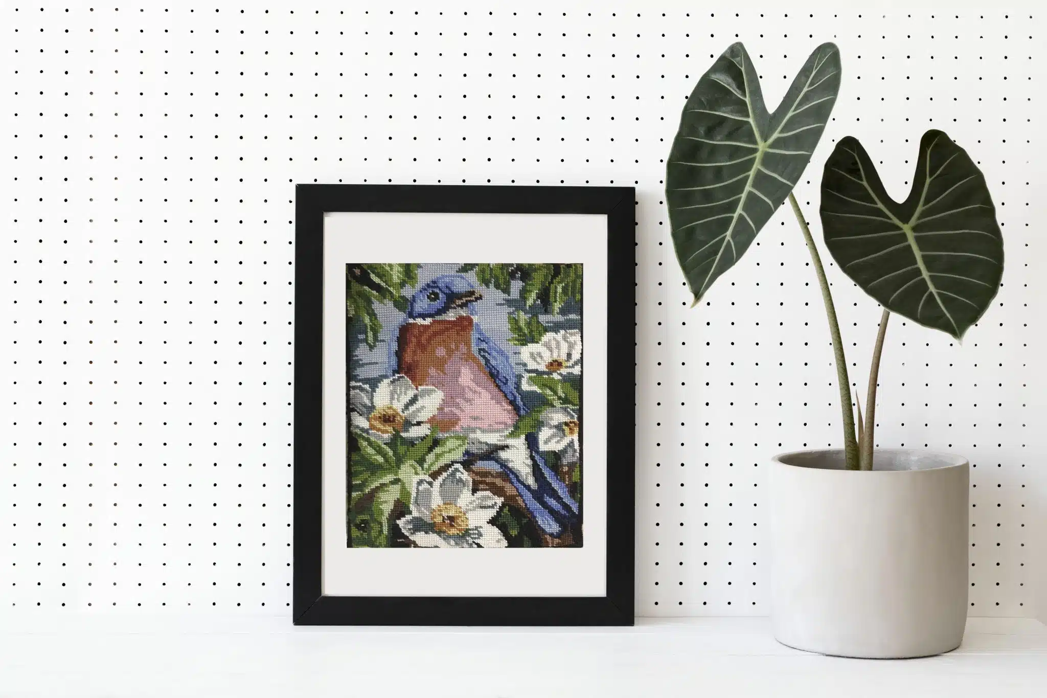 This stunning needlepoint artwork captures the beauty of a bluebird perched among white blossoms, surrounded by lush green foliage. The intricate stitching and vibrant color palette bring the bird to life, highlighting its delicate details and natural elegance. The harmonious blend of blues, browns, and greens creates a tranquil and inviting atmosphere, making this piece a perfect addition to any nature-inspired décor.