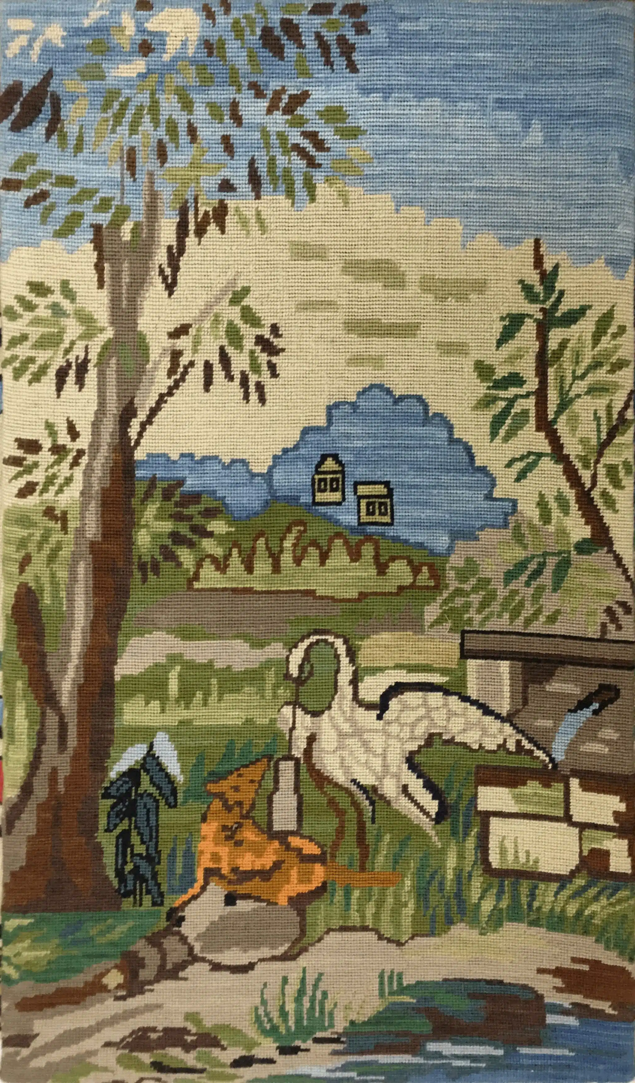 This needlepoint tapestry captures a serene countryside setting featuring a heron, a golden dog resting on a rock, lush trees, and a calm river. In the background, quaint houses sit amidst rolling hills, all framed by a vibrant blue sky. The detailed composition evokes peace and harmony with nature.