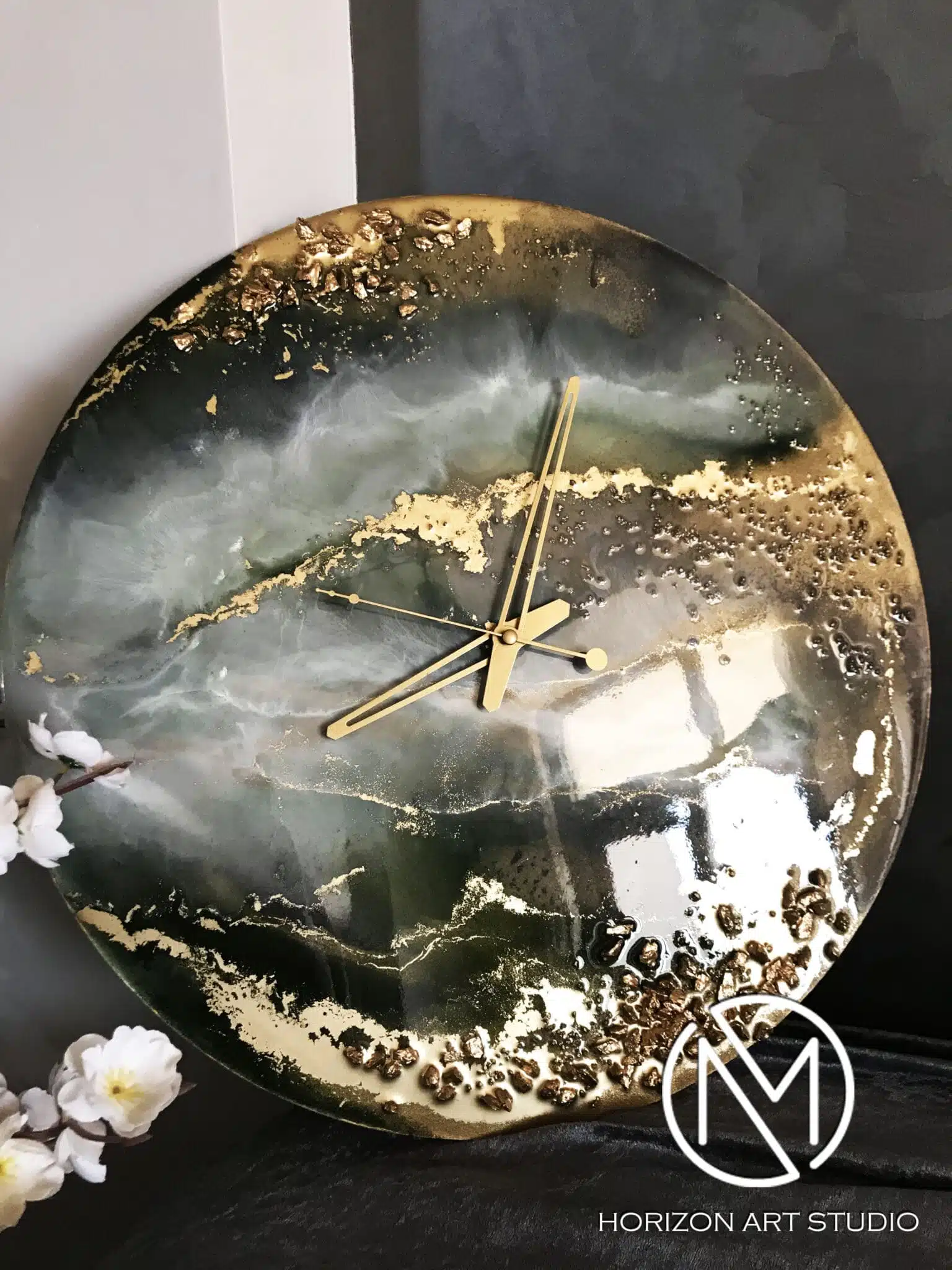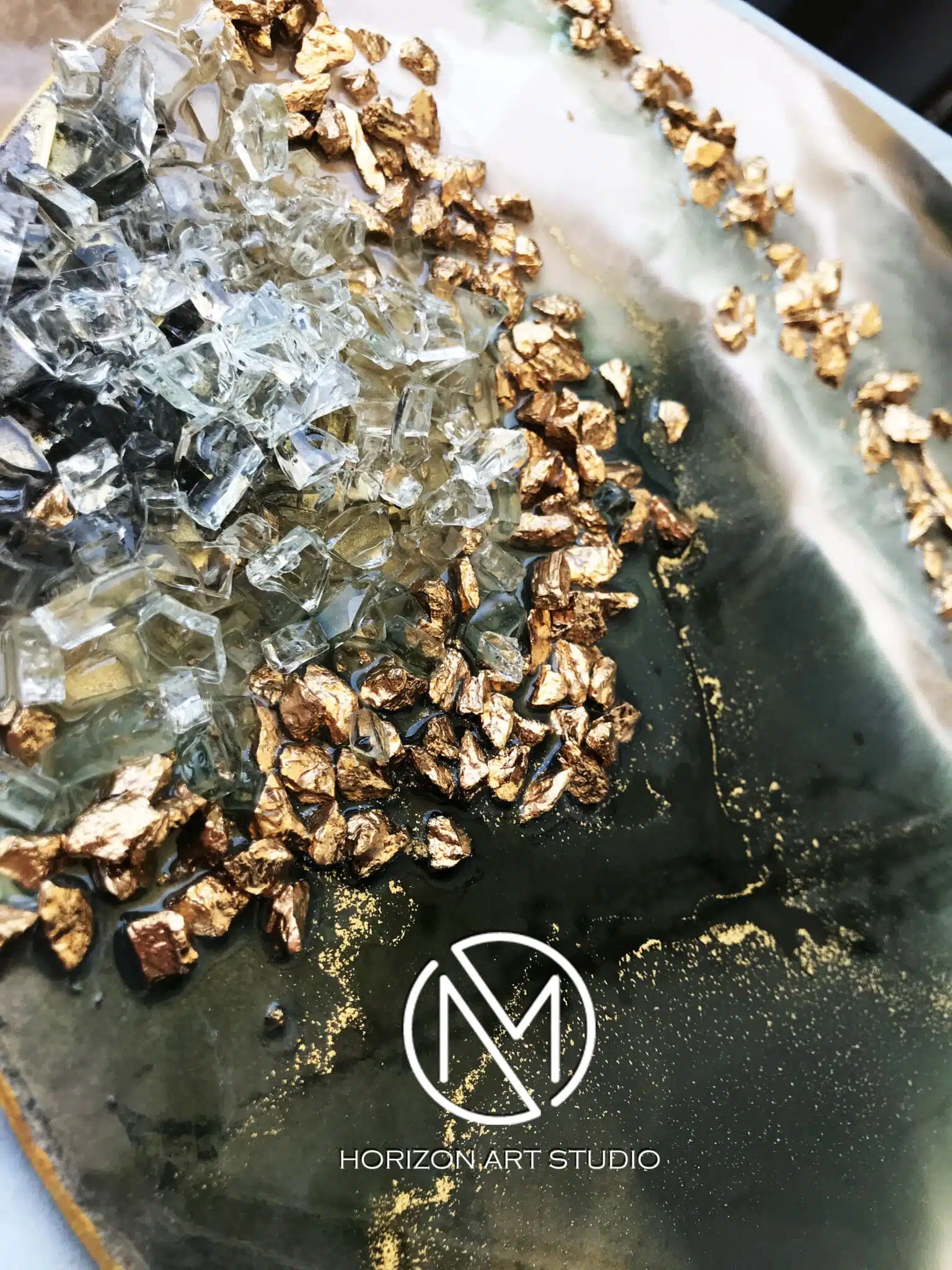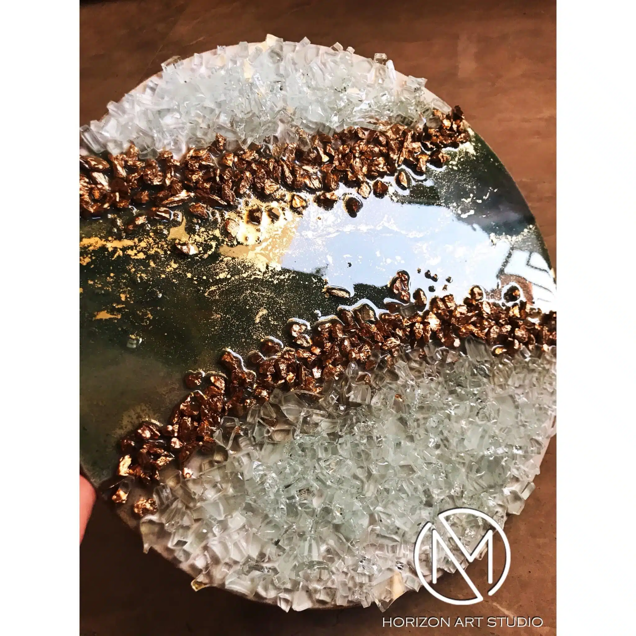 • Shiny Luxurious Resin surface on wood mixed with stones and crystals