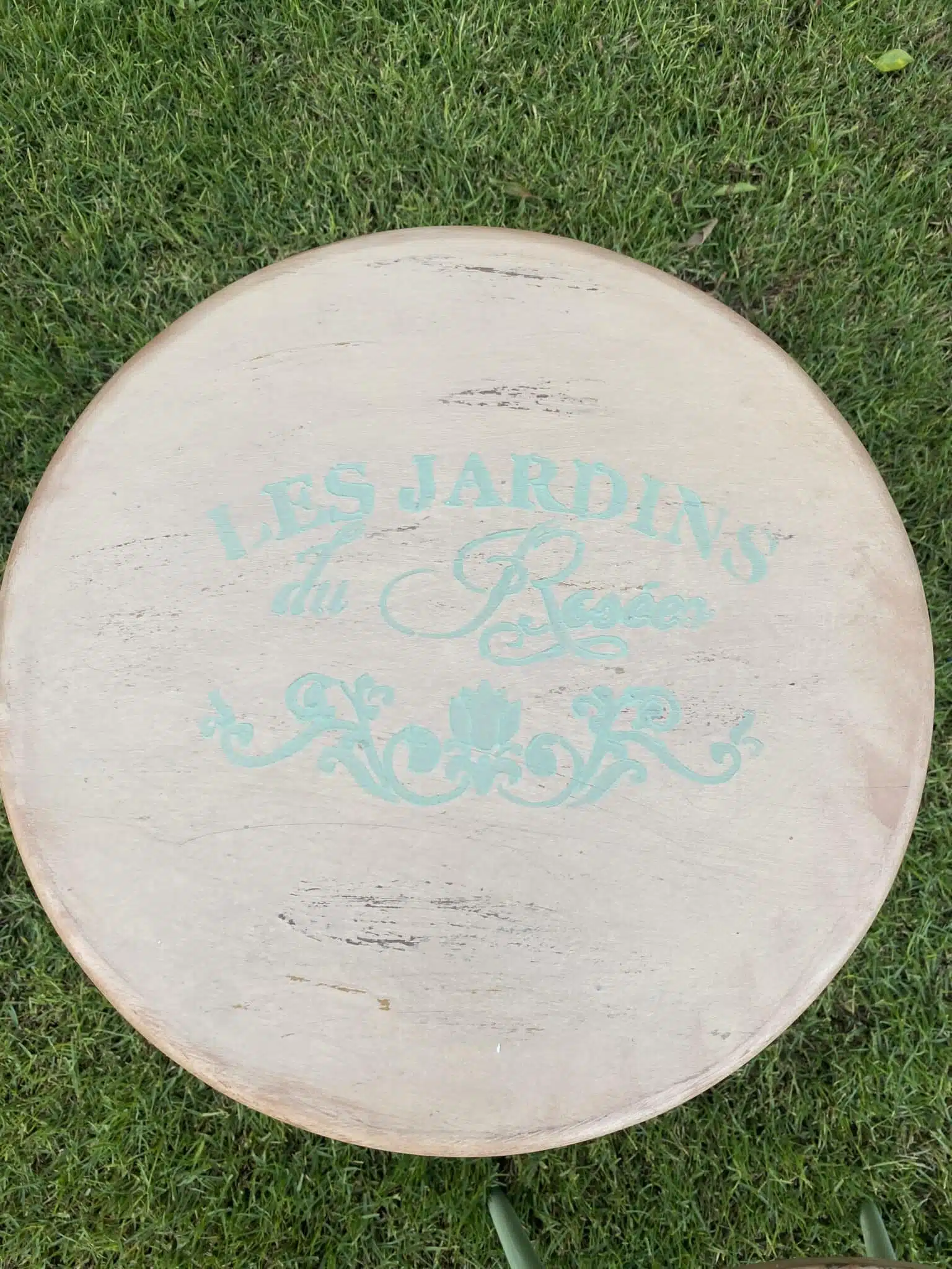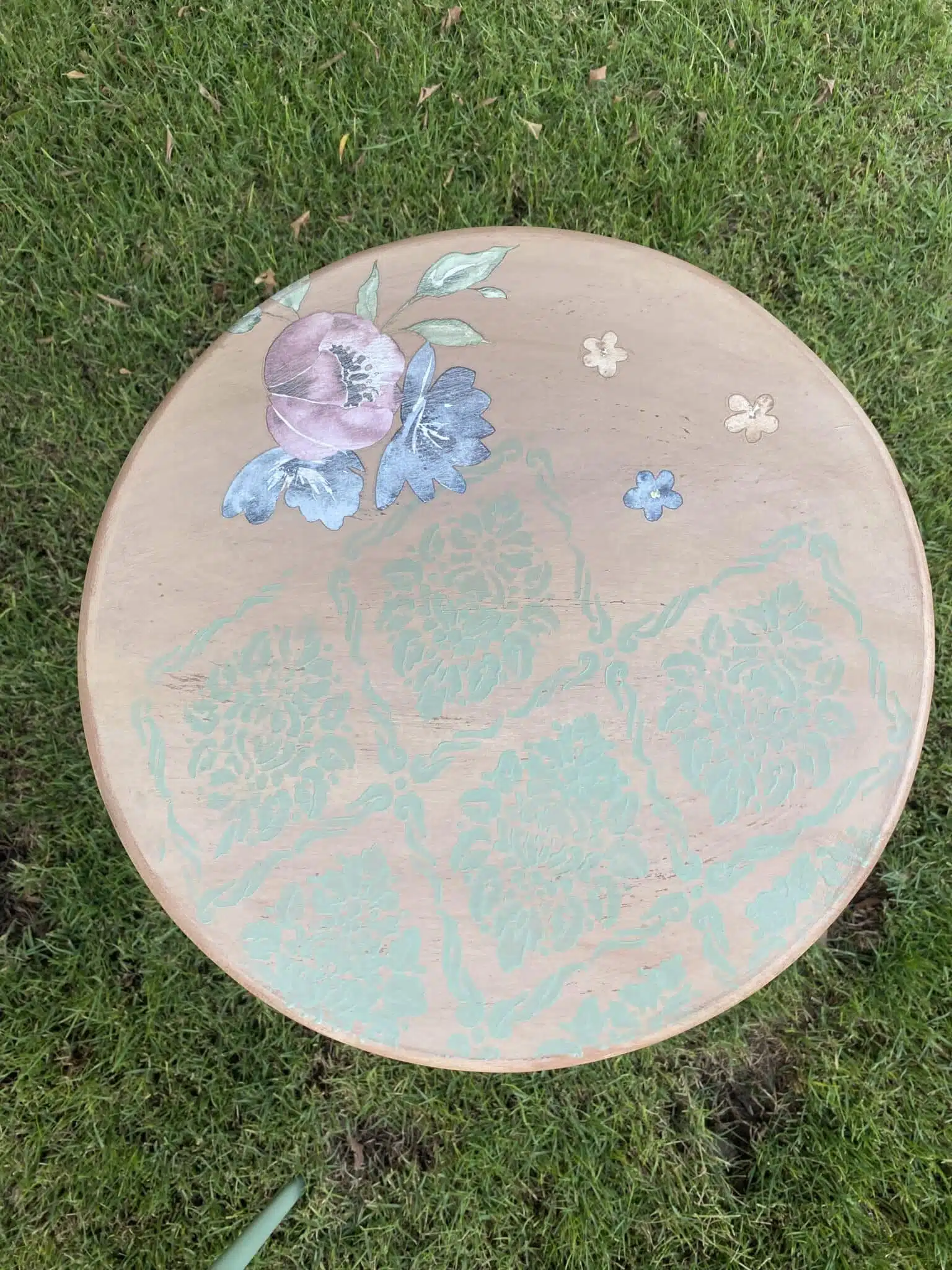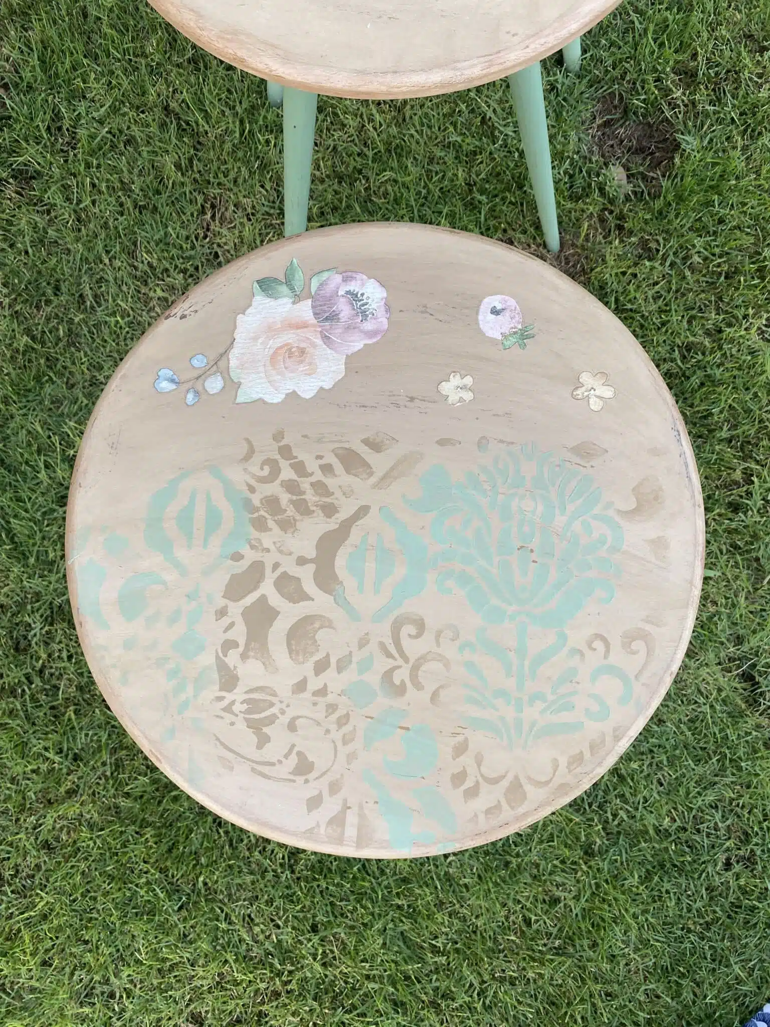 Wooden set of round side tables vintage mint x beige with flower transfer