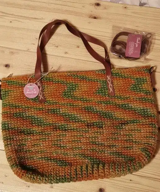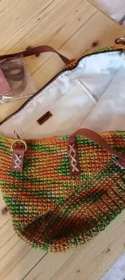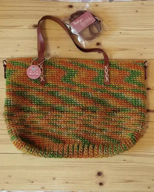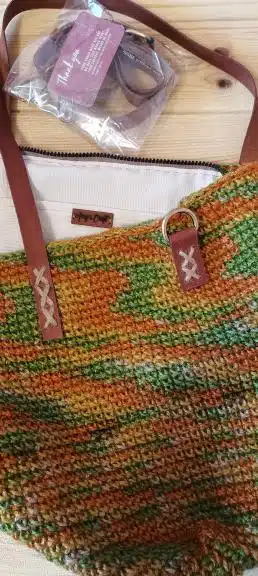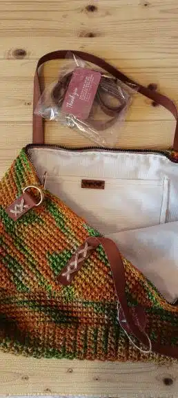 large colorful handmade jute bag with natural leather holder