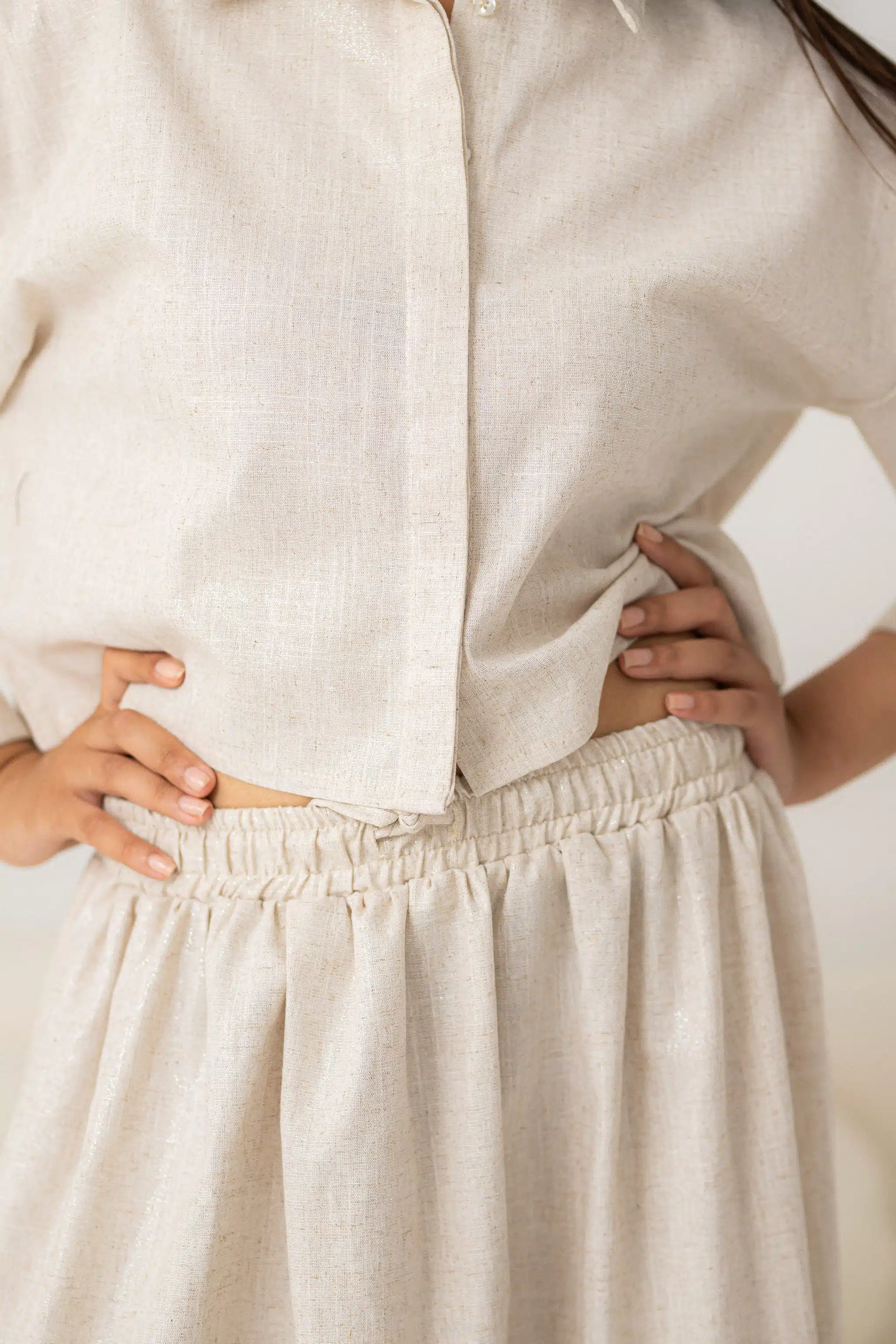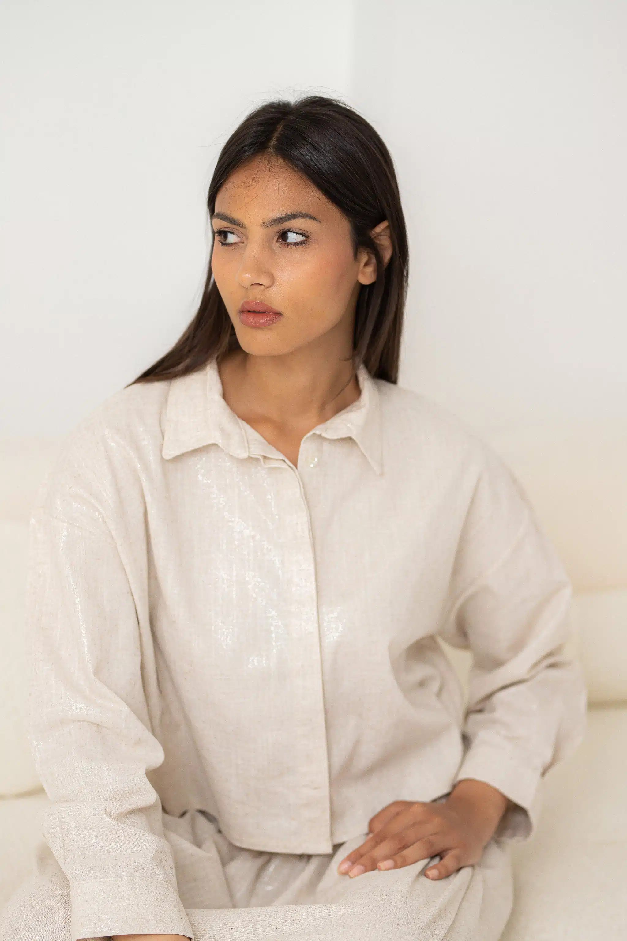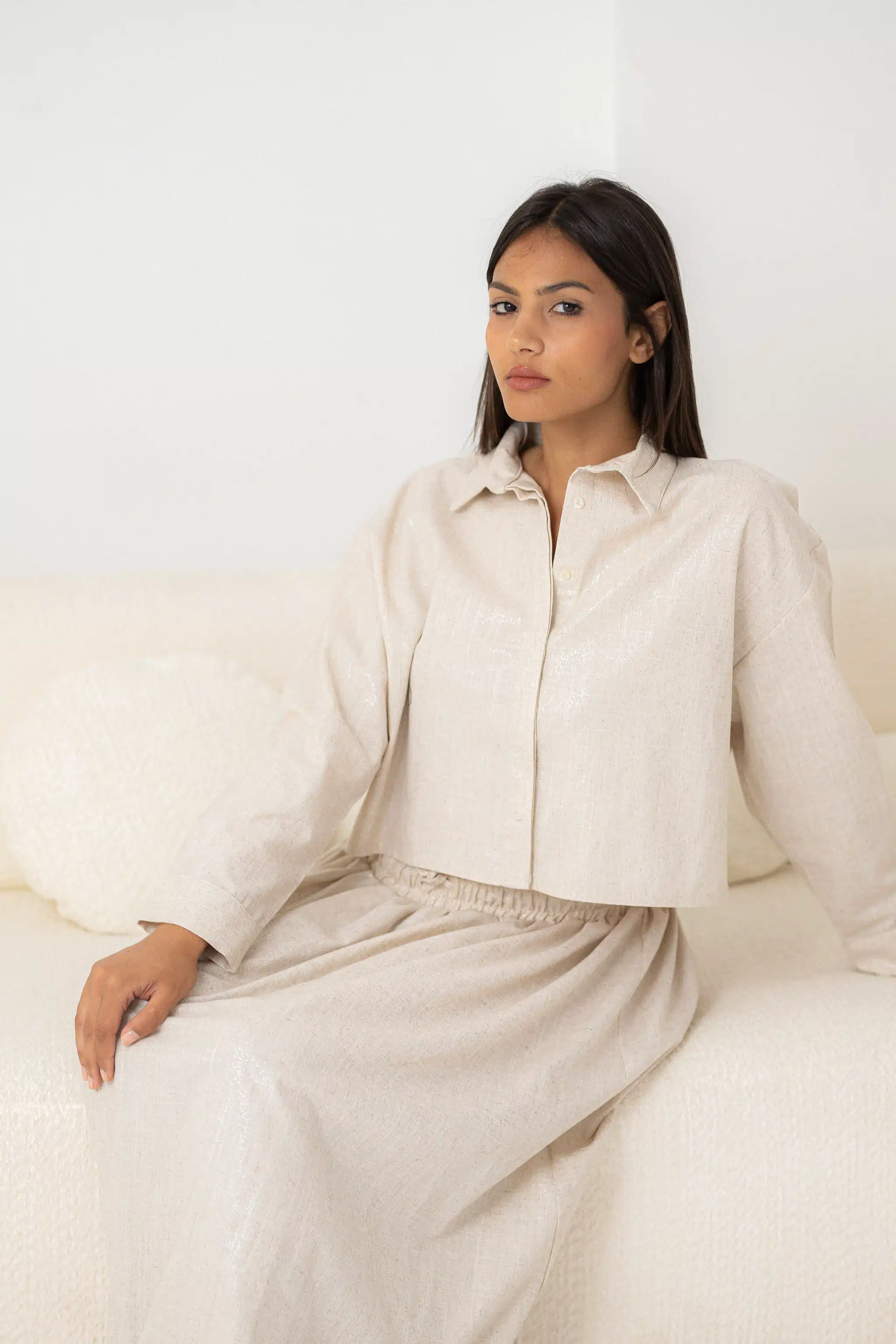 Shinny Gold and Silver beige Pure Linen Crop Shirt