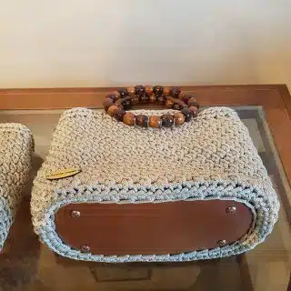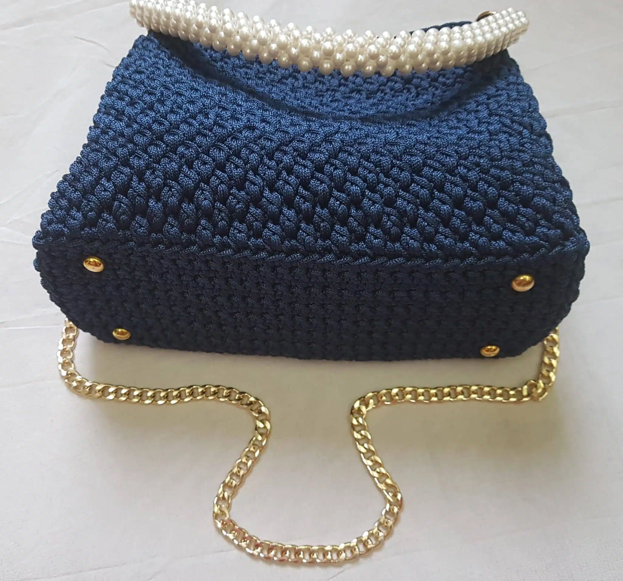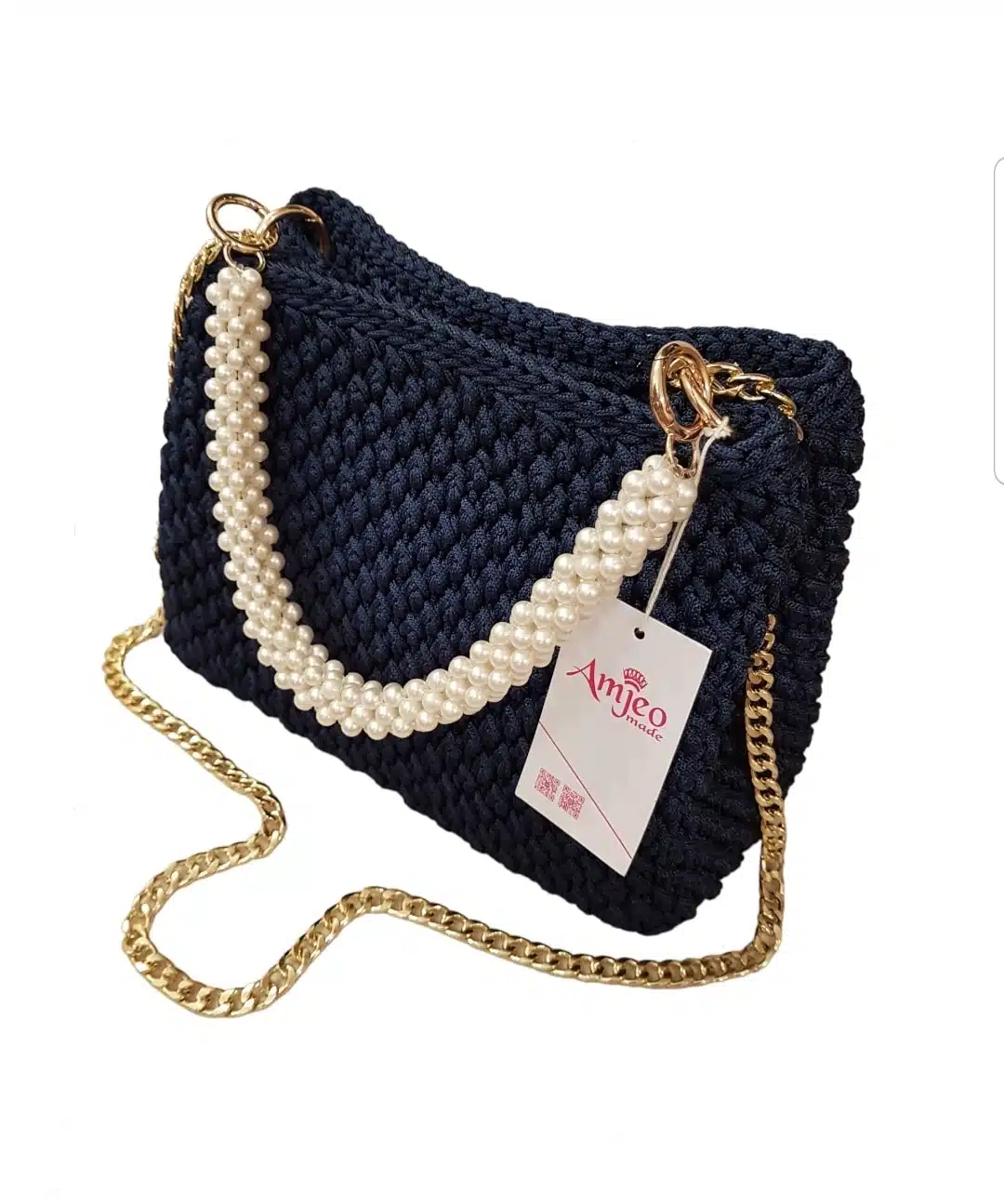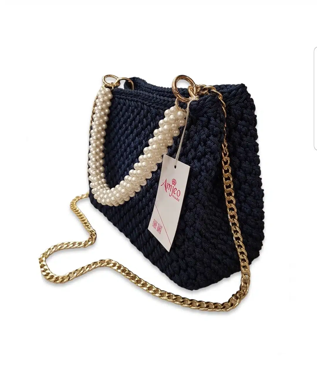 With white pearl hand, 1 meter gold chain, small pocket inside and closed with a leather magnet.