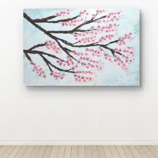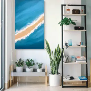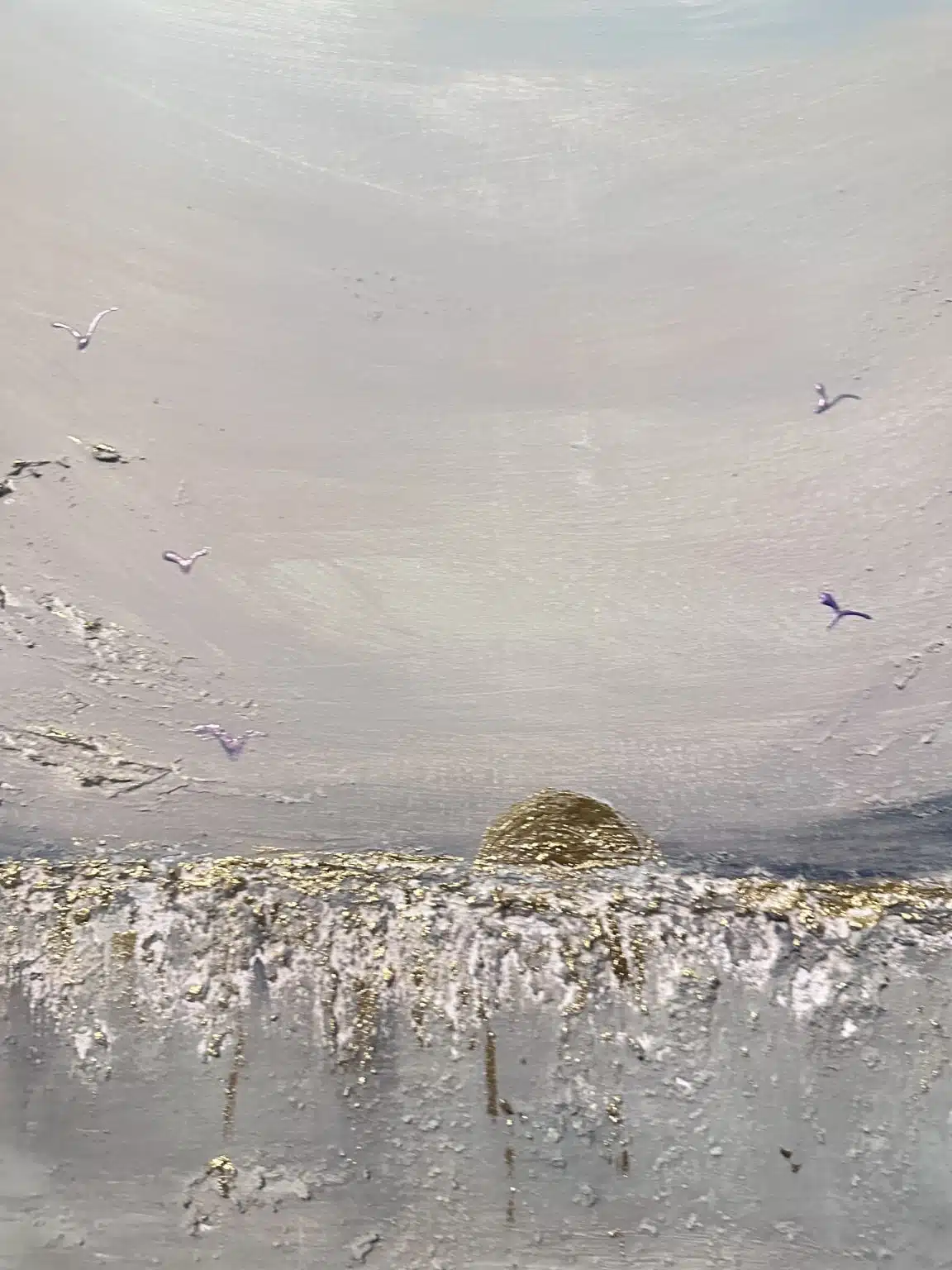 This painting features a soft palette of blues and grey with a touch of texture brushstrokes to give it sense of depth and movement.