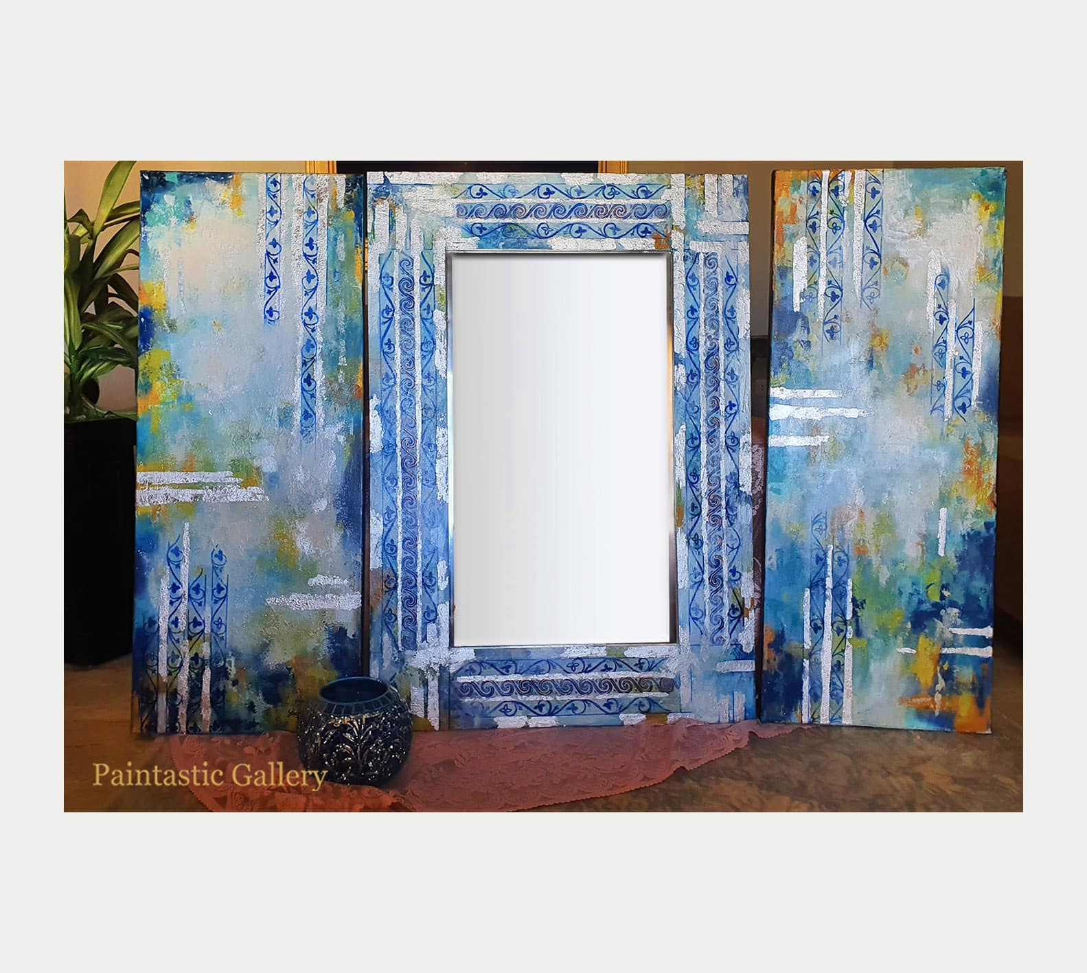 Mirror material: A glass mirror with a natural wooden frame handpainted with acrylics.