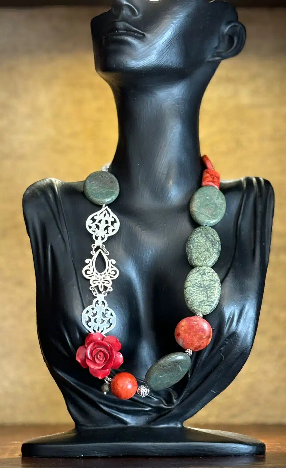 Hand made Semiprecious stones and sterling silver necklace (coral &green Jade)