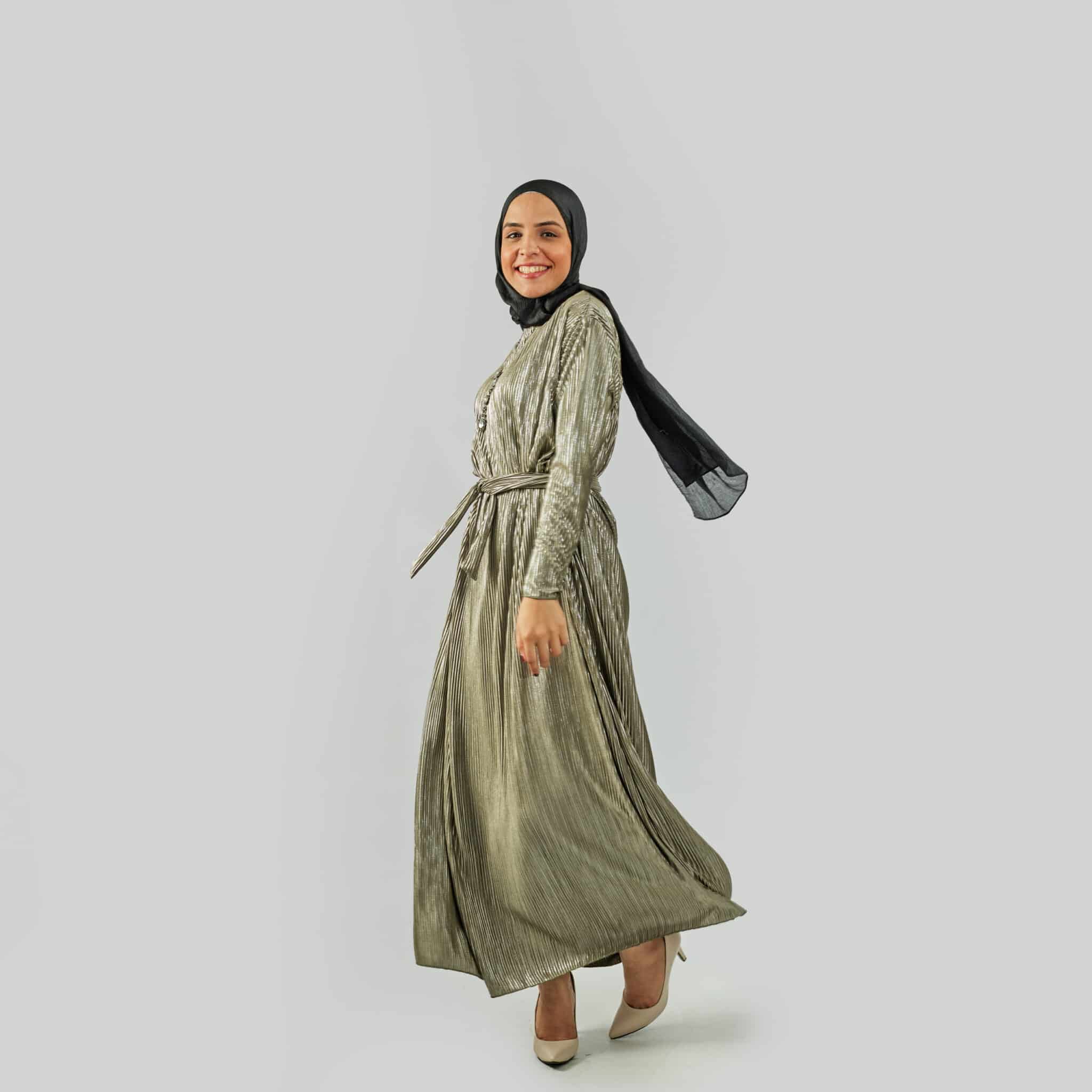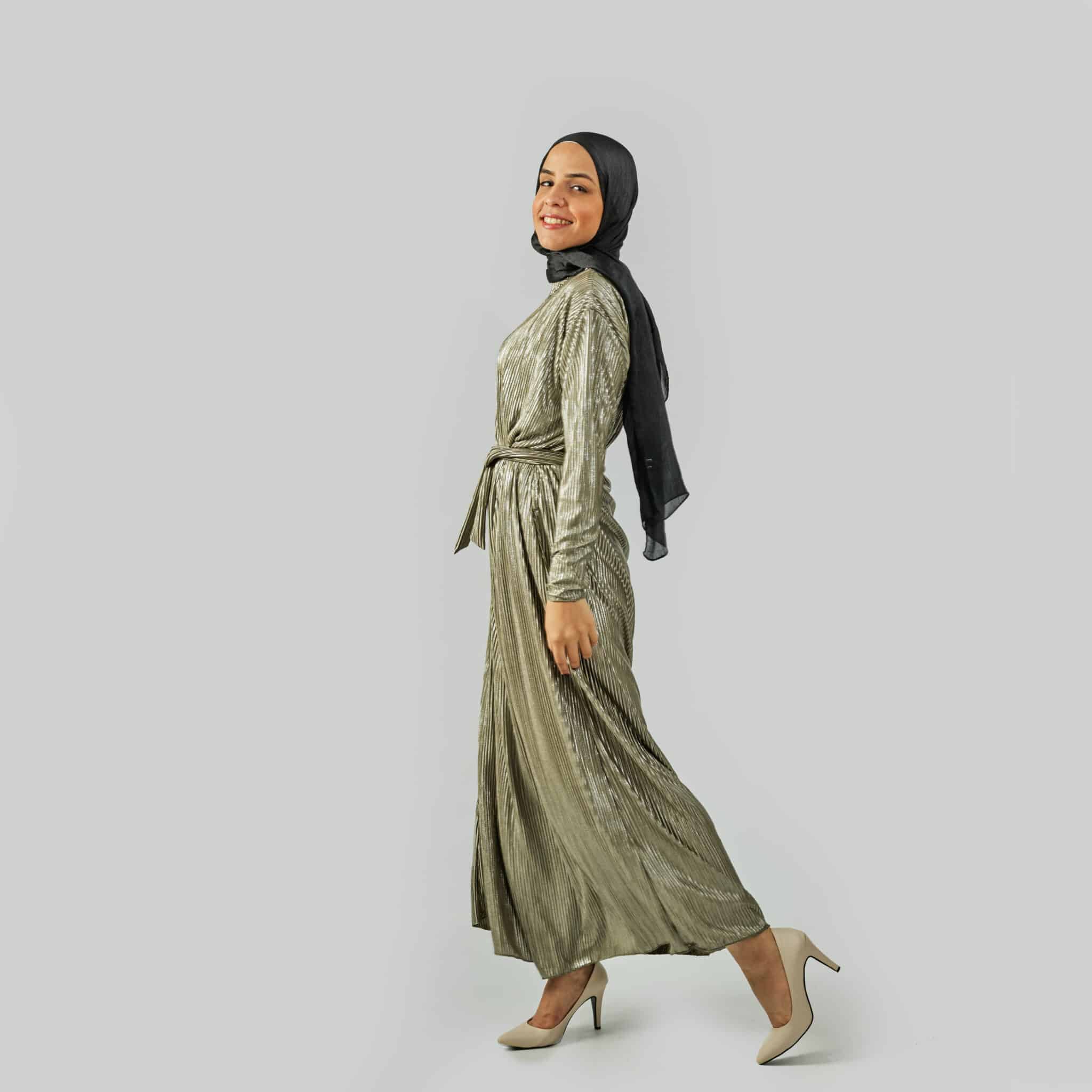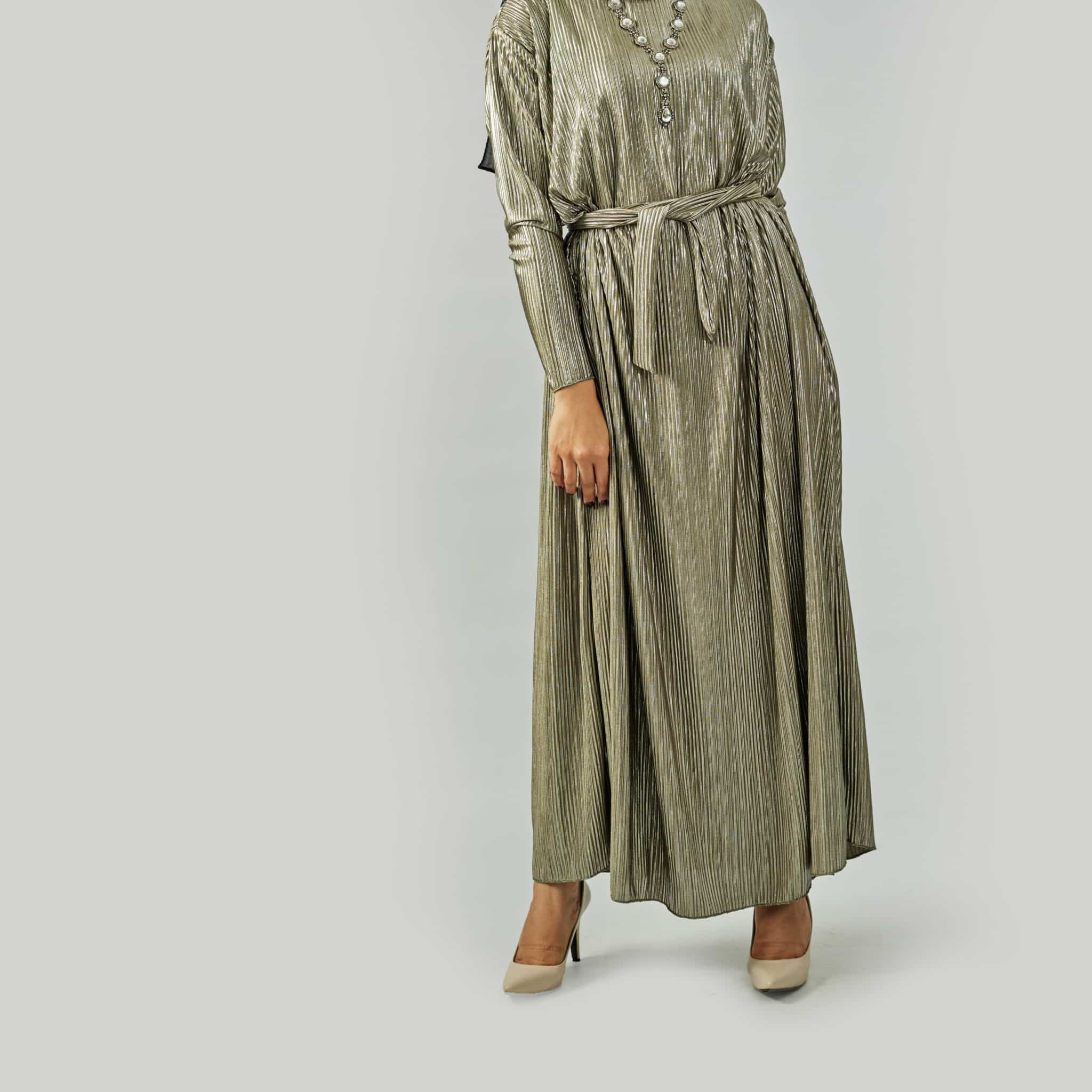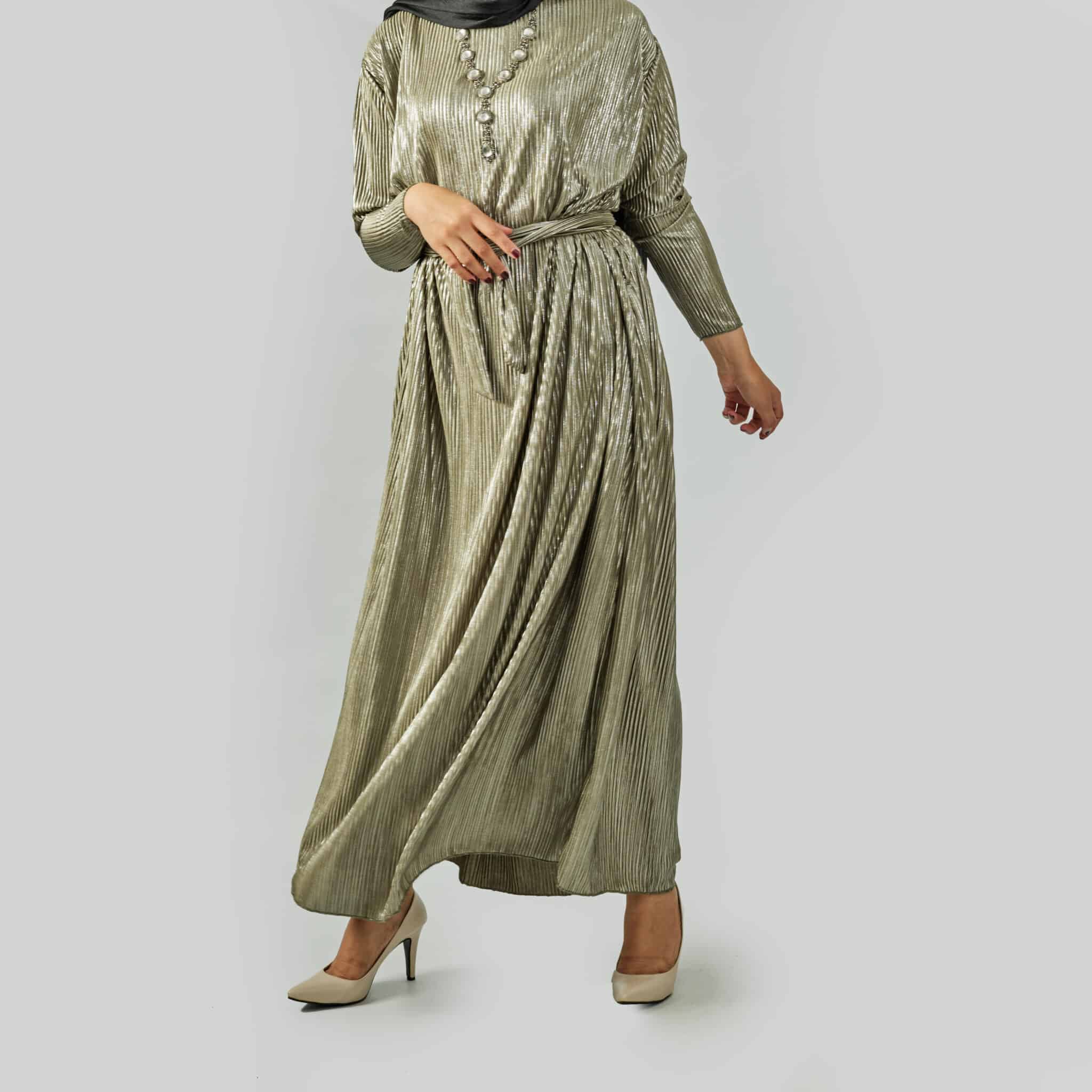 Silver pleated evening dress.