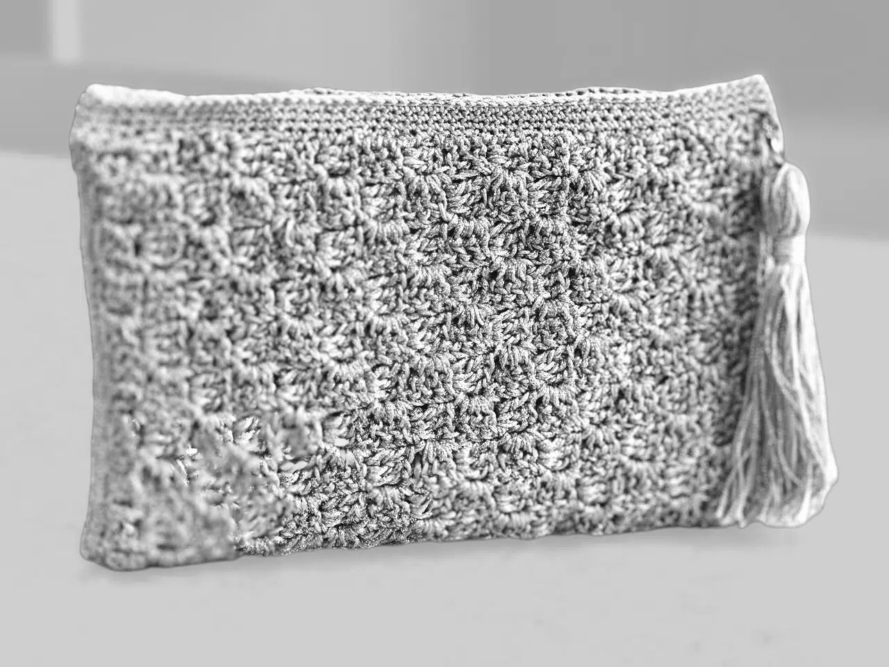 Silver soiree crochet clutch knitted with two types of silver yarn to give a lovely glittery look