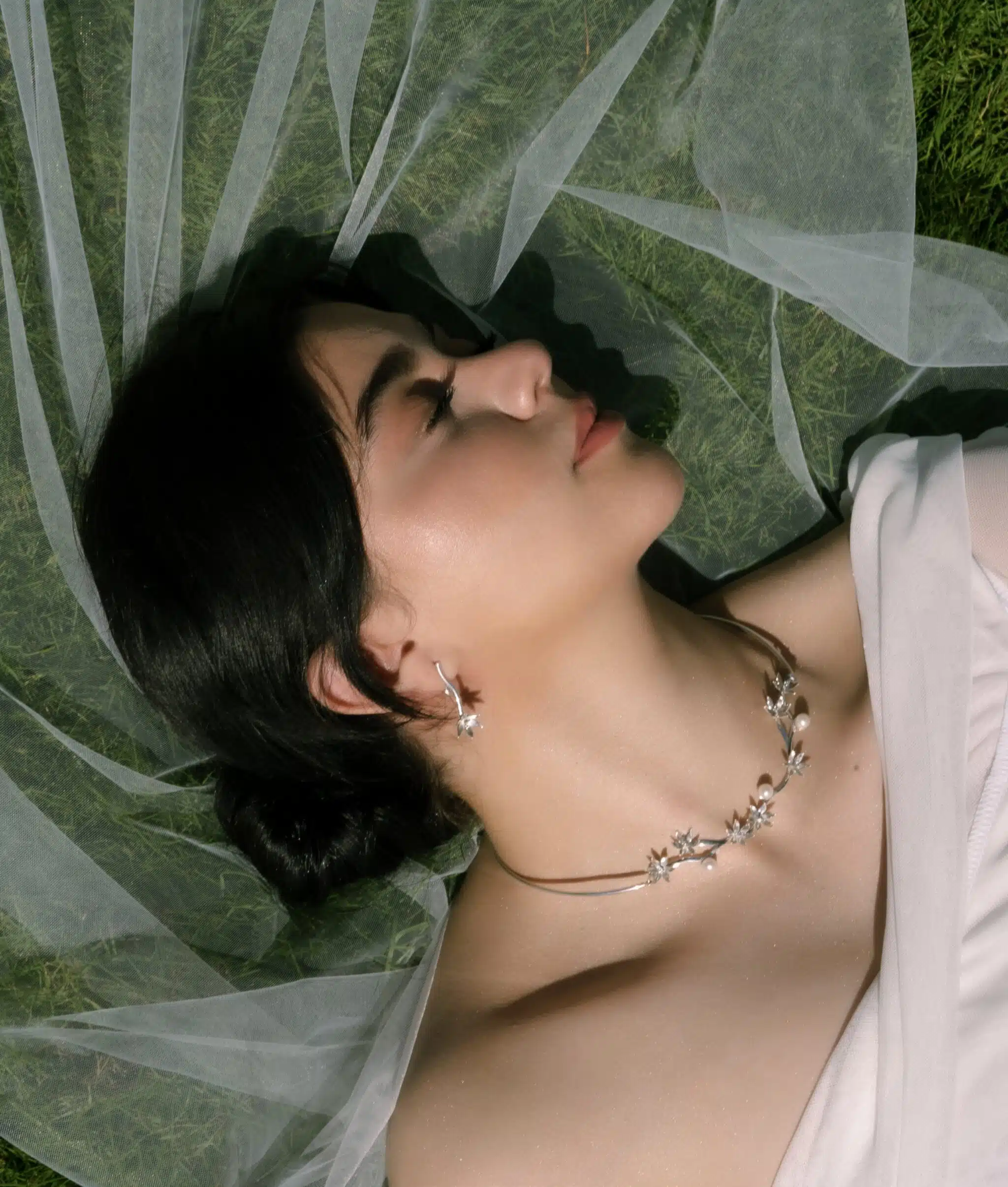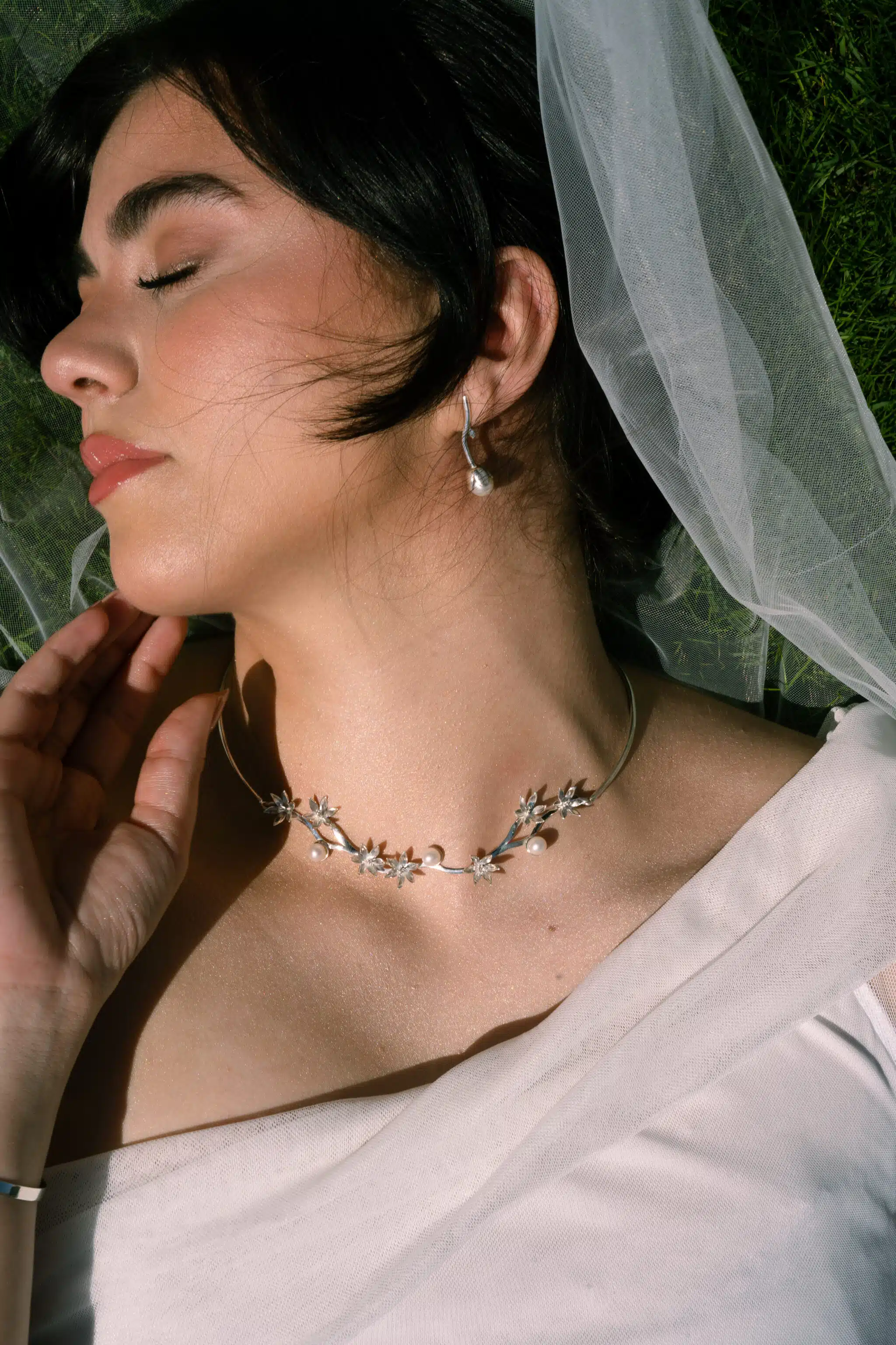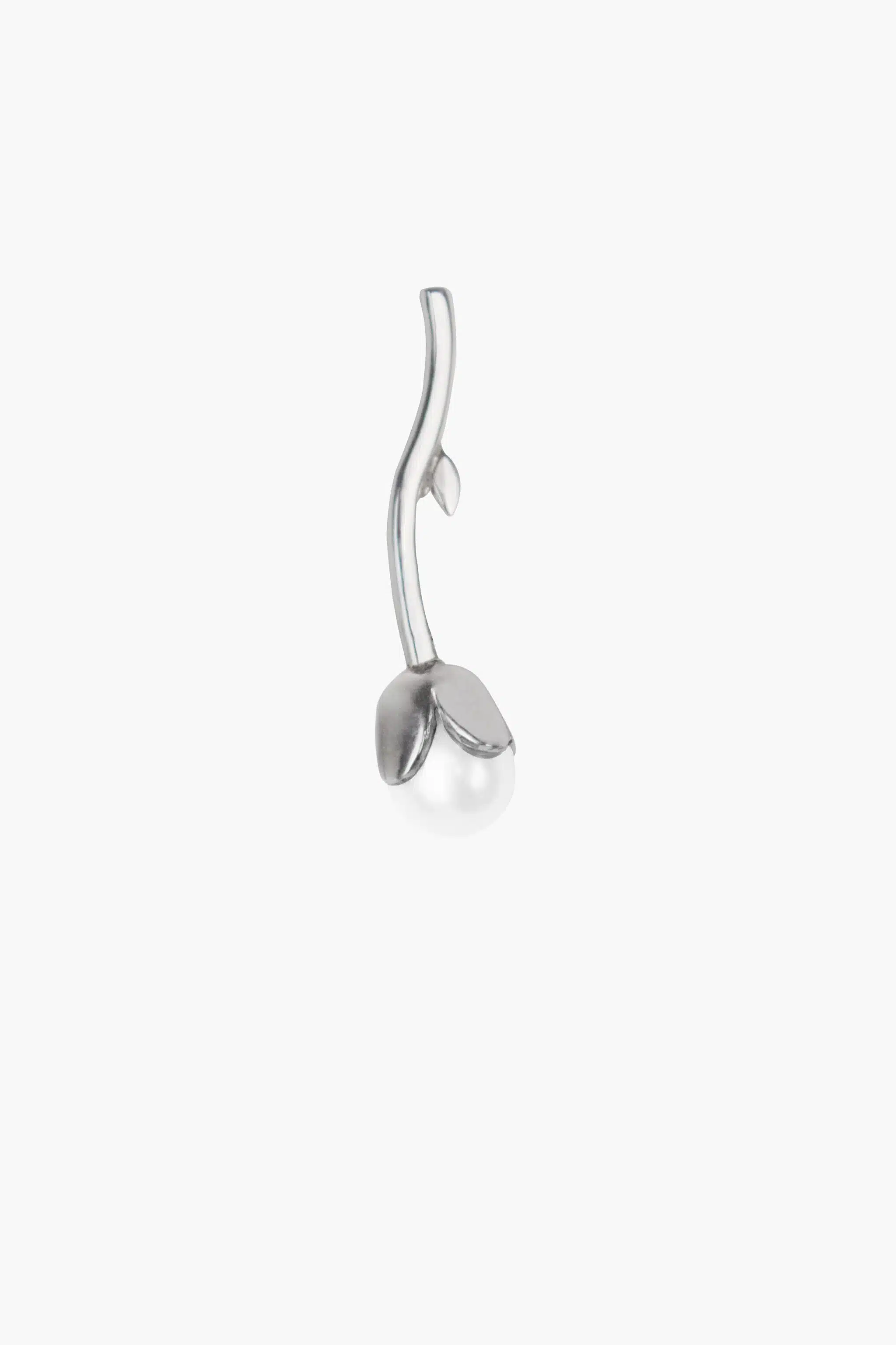 Sterling silver drop earrings featuring a single blossoming lily and a bell-shaped floral form accented with a freshwater pearl. Light and graceful, they echo the collection’s floral theme with a modern twist. Mismatch for a unique playful look or match the same shape for a more classic look.