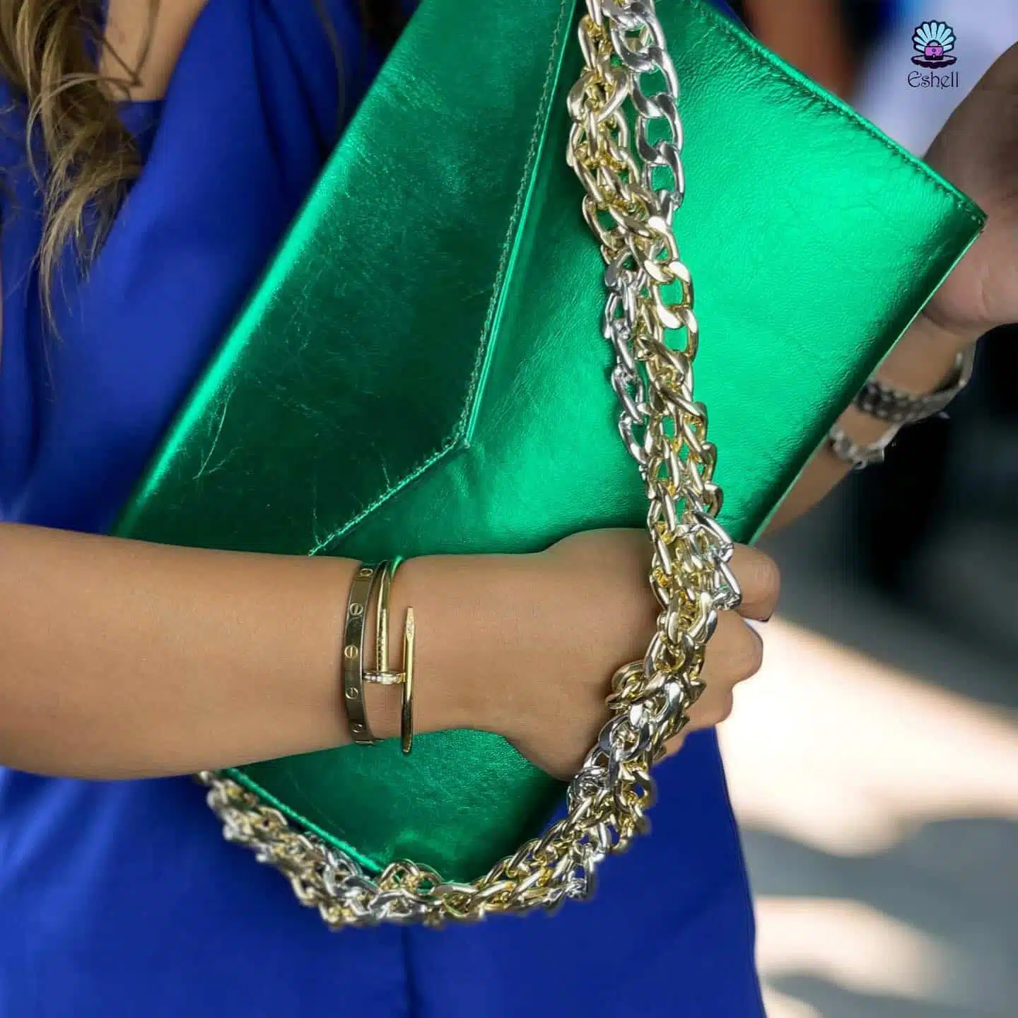 Crafted from high quality leather. Equipped with a gold and silver chain strap, this accessory can be worn as a shoulder or carried by hand as clutch.
