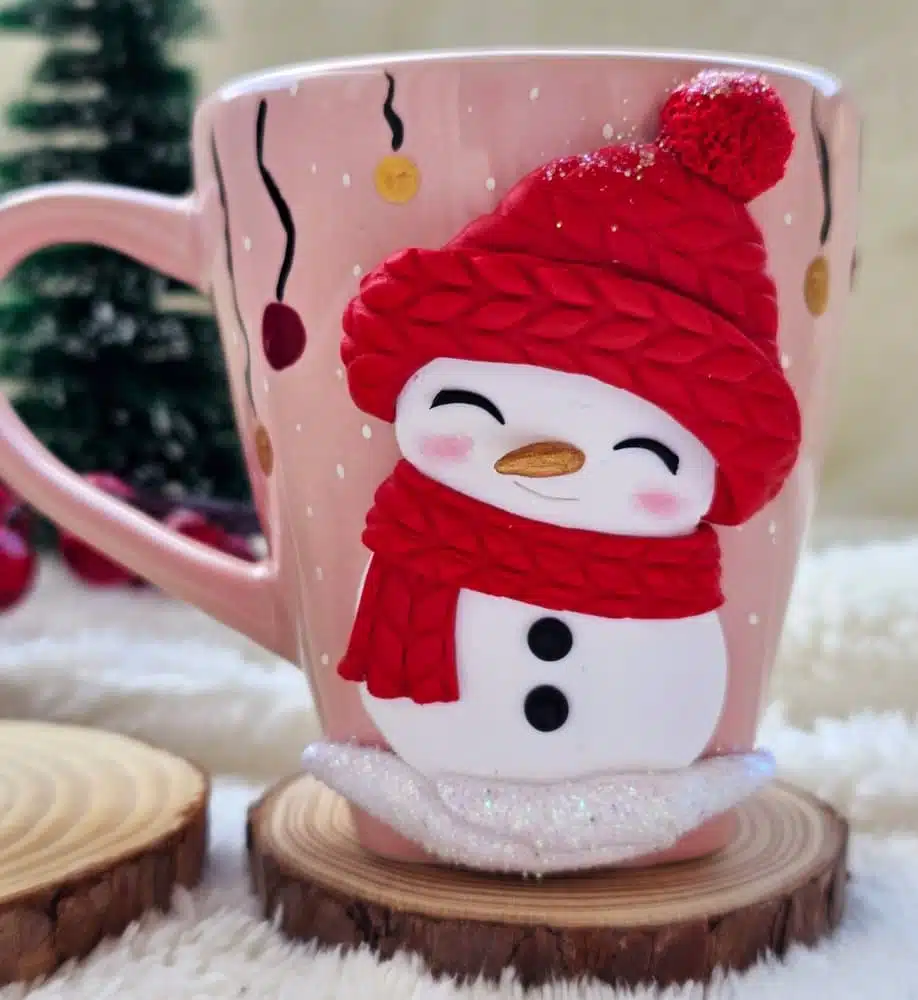Pink porcelain mug with a design made of polymerclay in a shape of cute snow man with a glittery touch