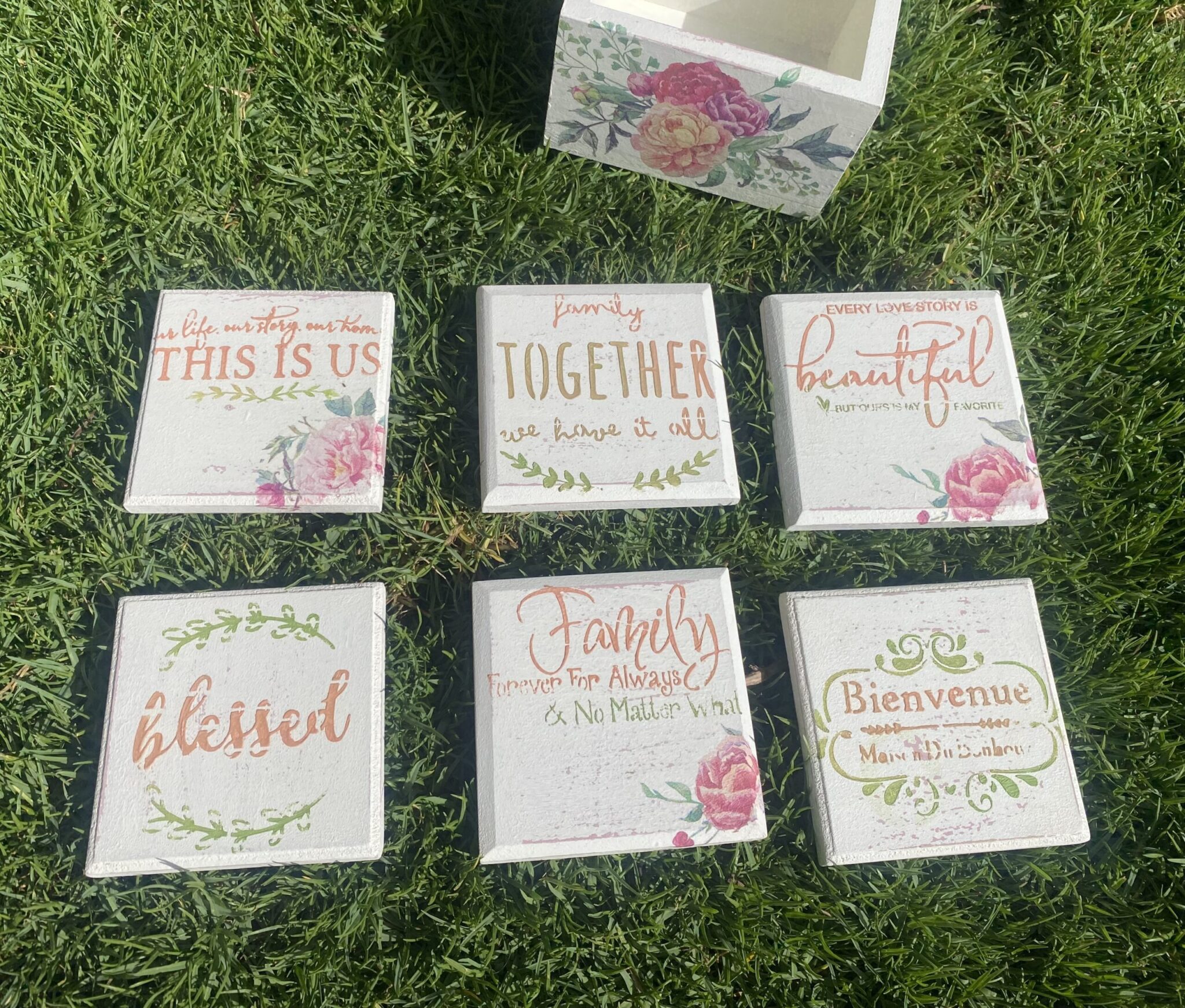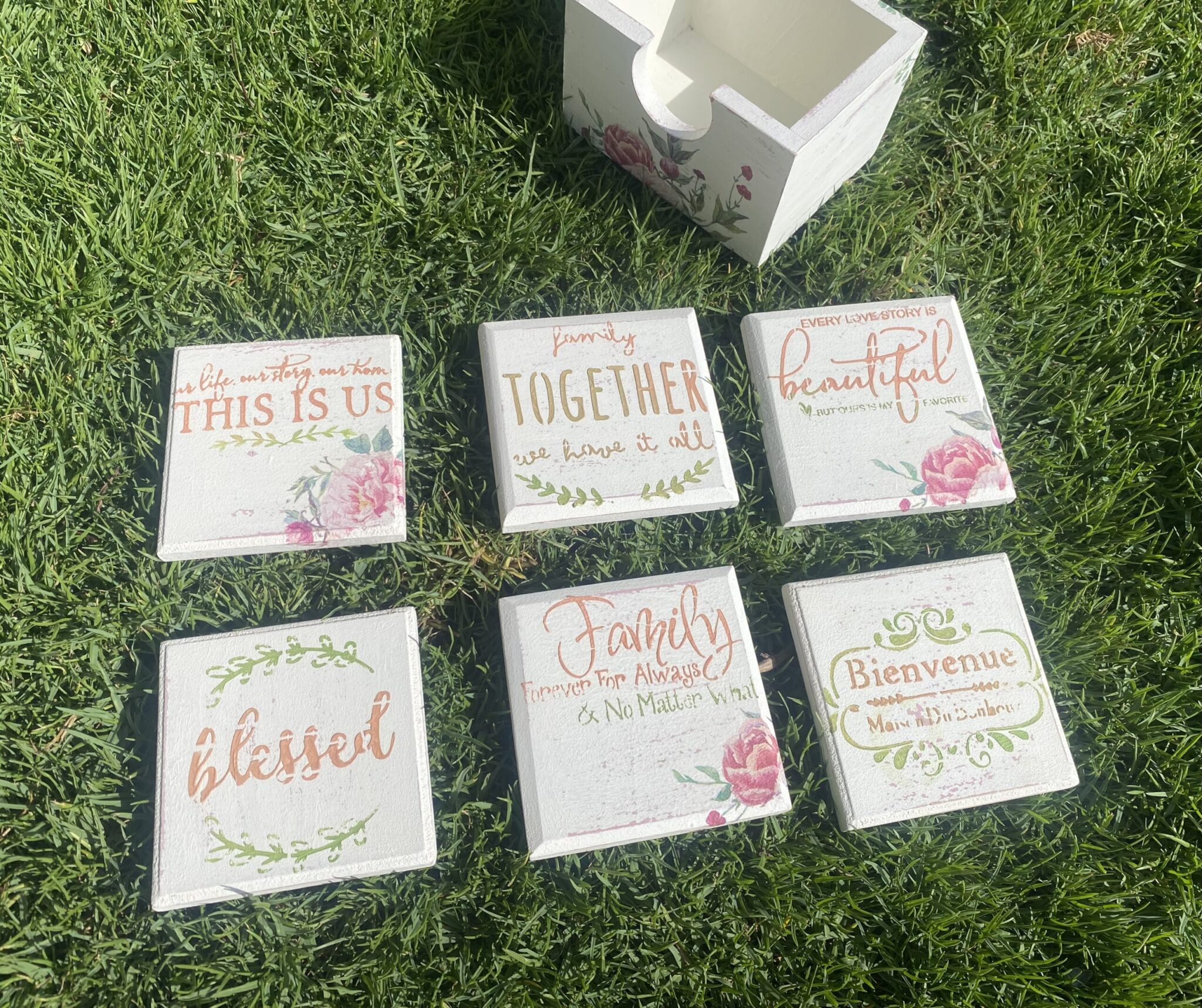 Wooden coasters with fleuri design with family quotes