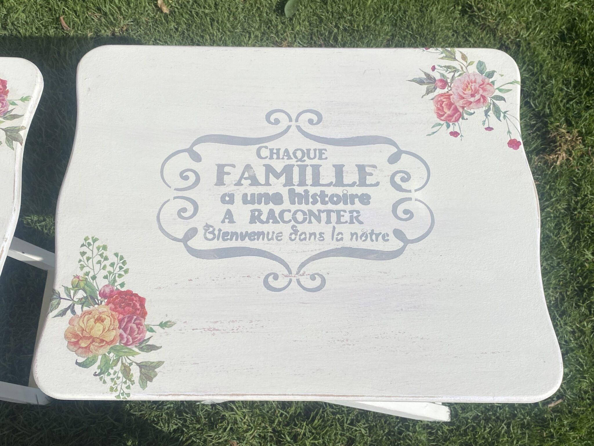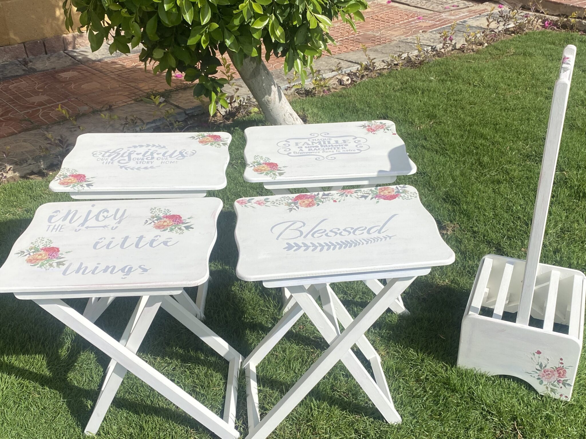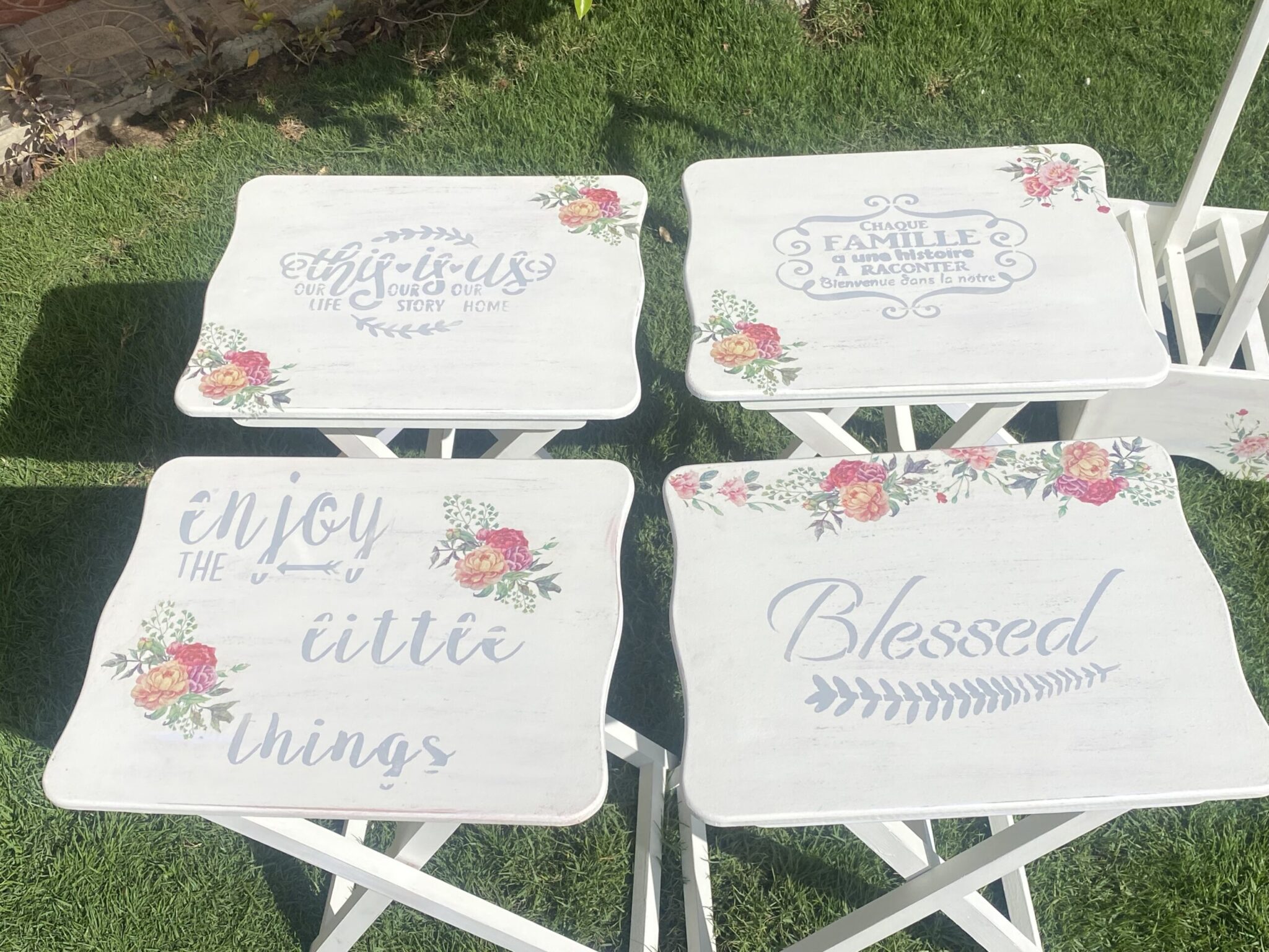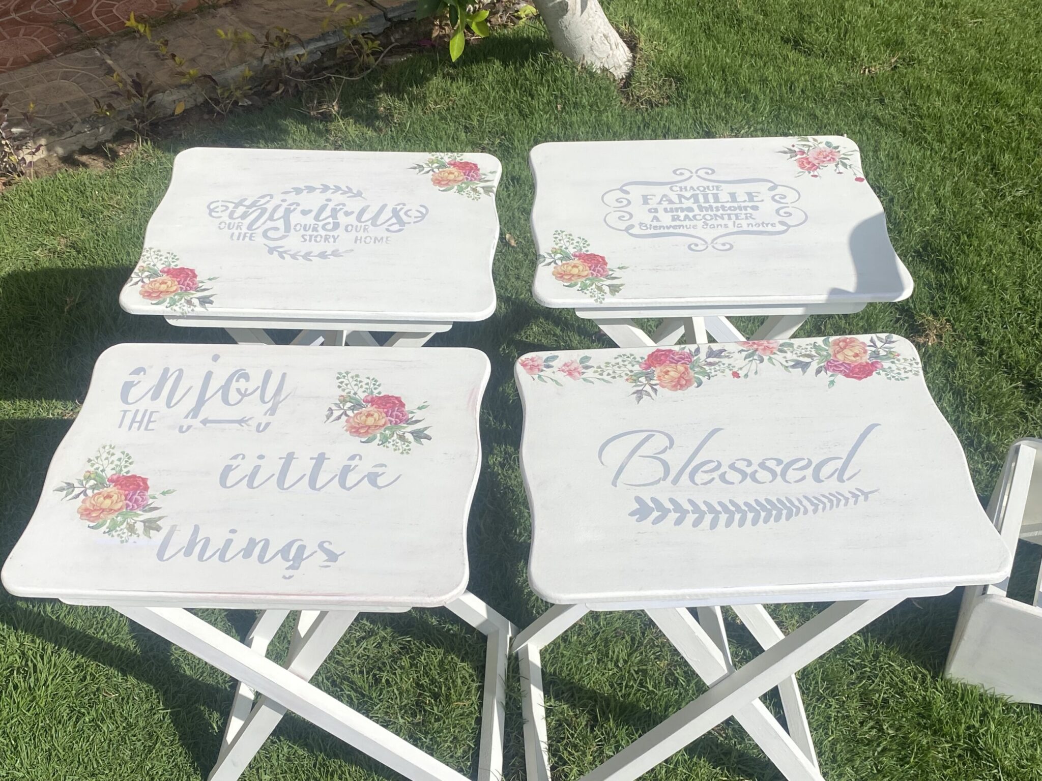 Wooden set of 4 foldable tables with spring flowers design and family quotes