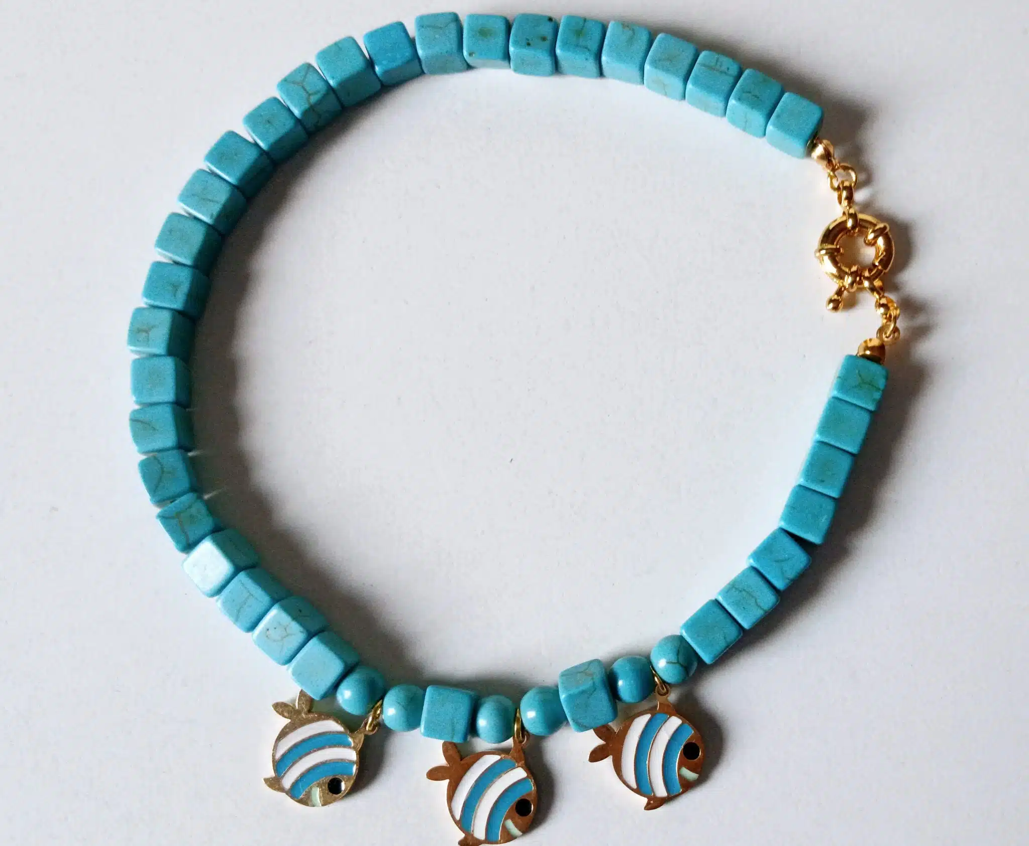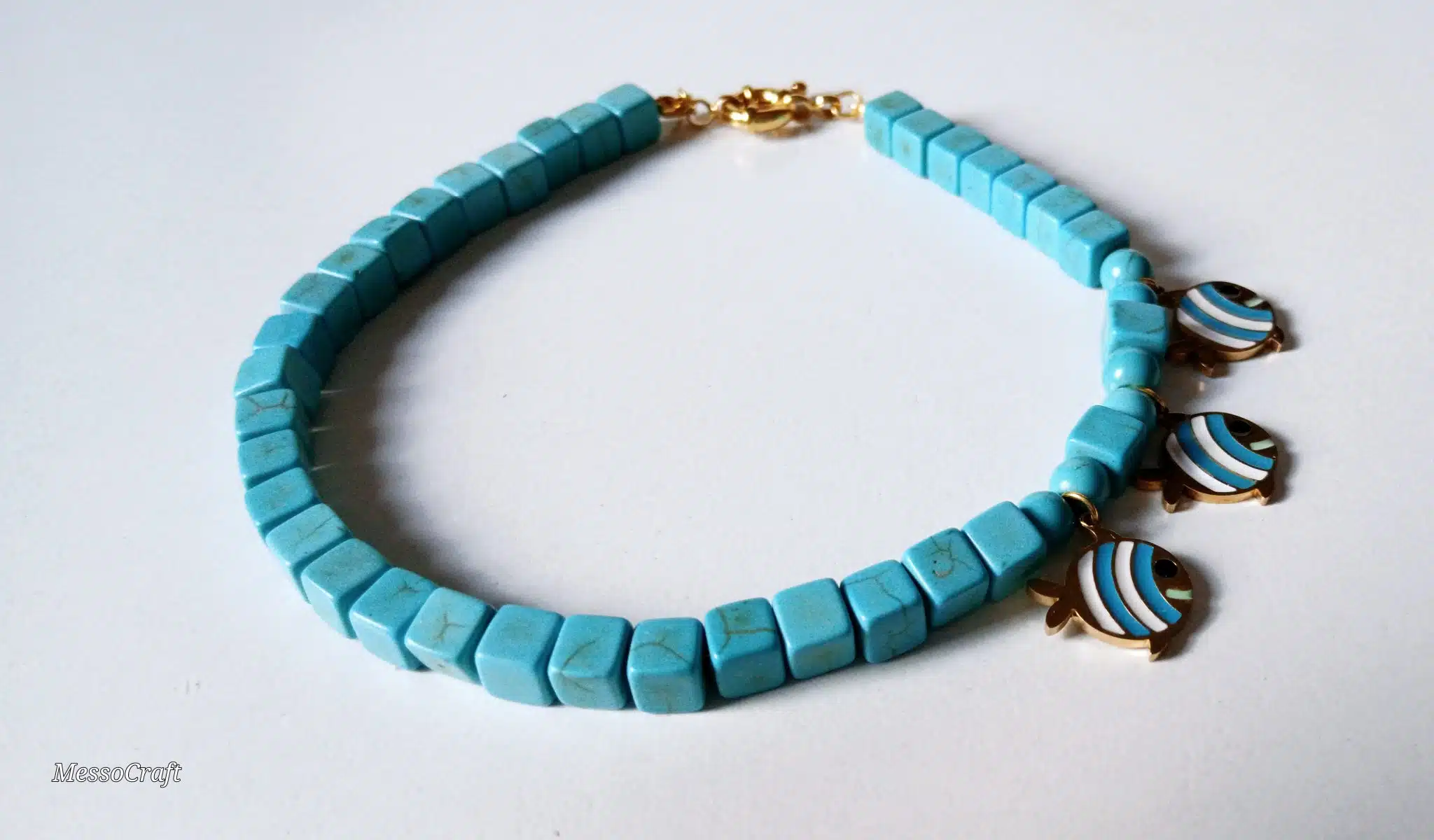 Anklet made of square turquoise stones with three unique hamsa pendants