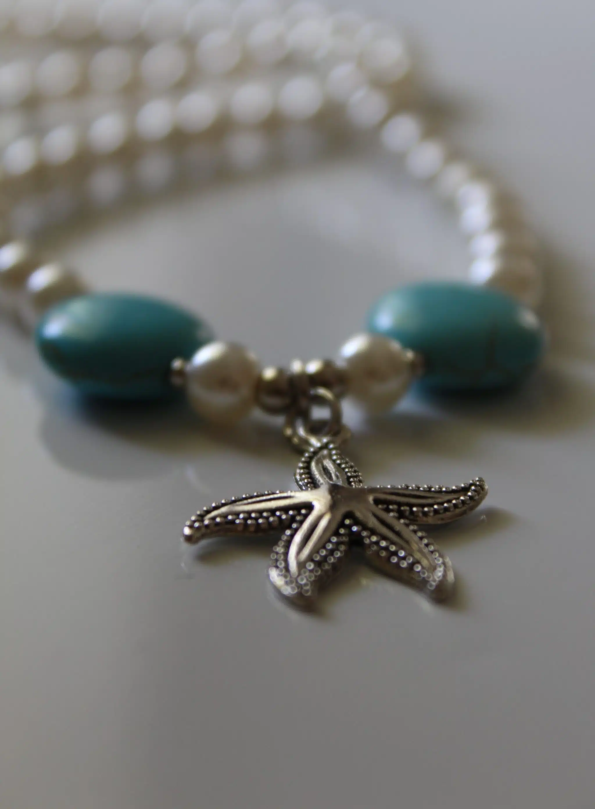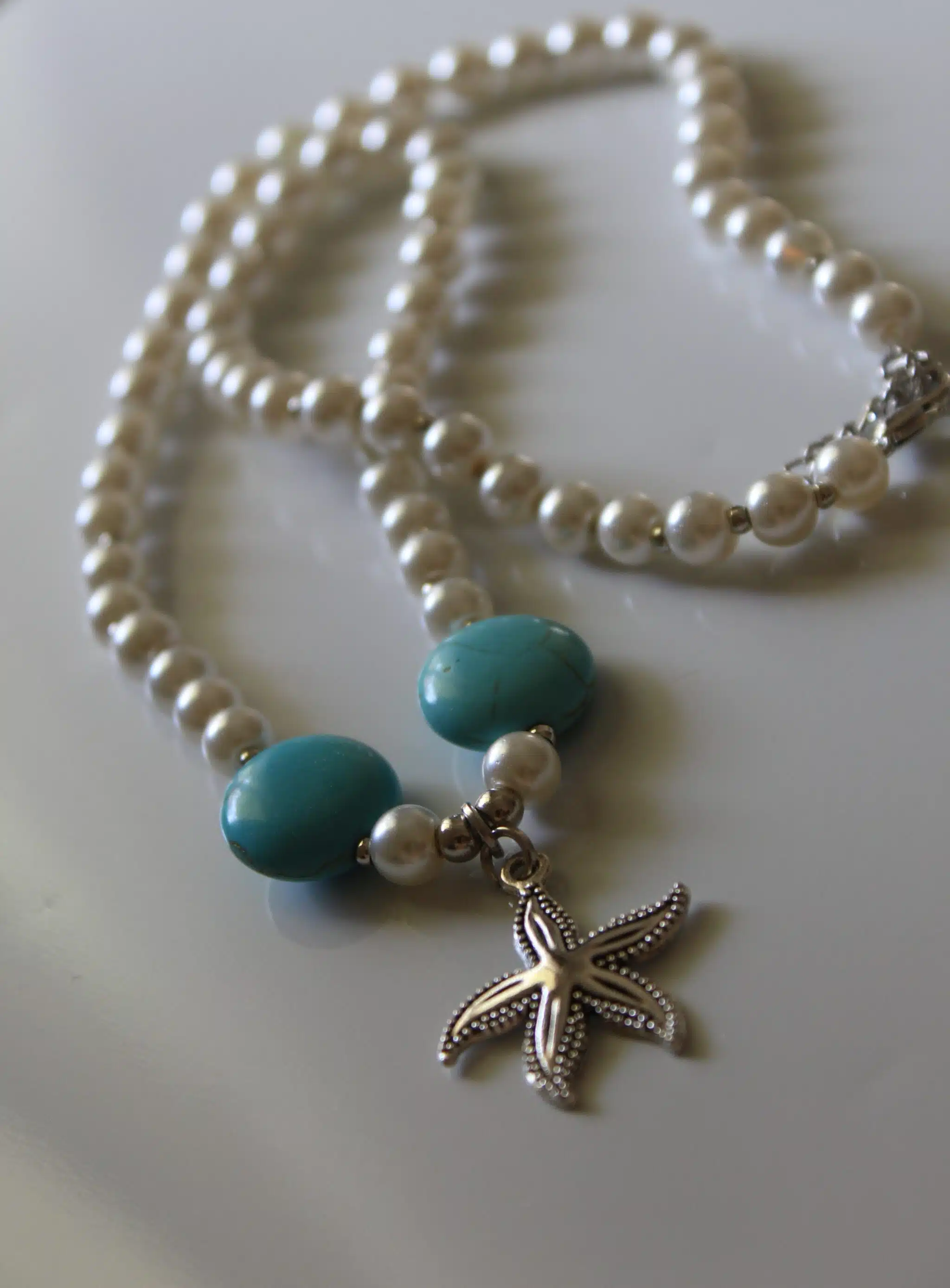 Pearl beads mixed with silver starfish and Turquoise beads.
