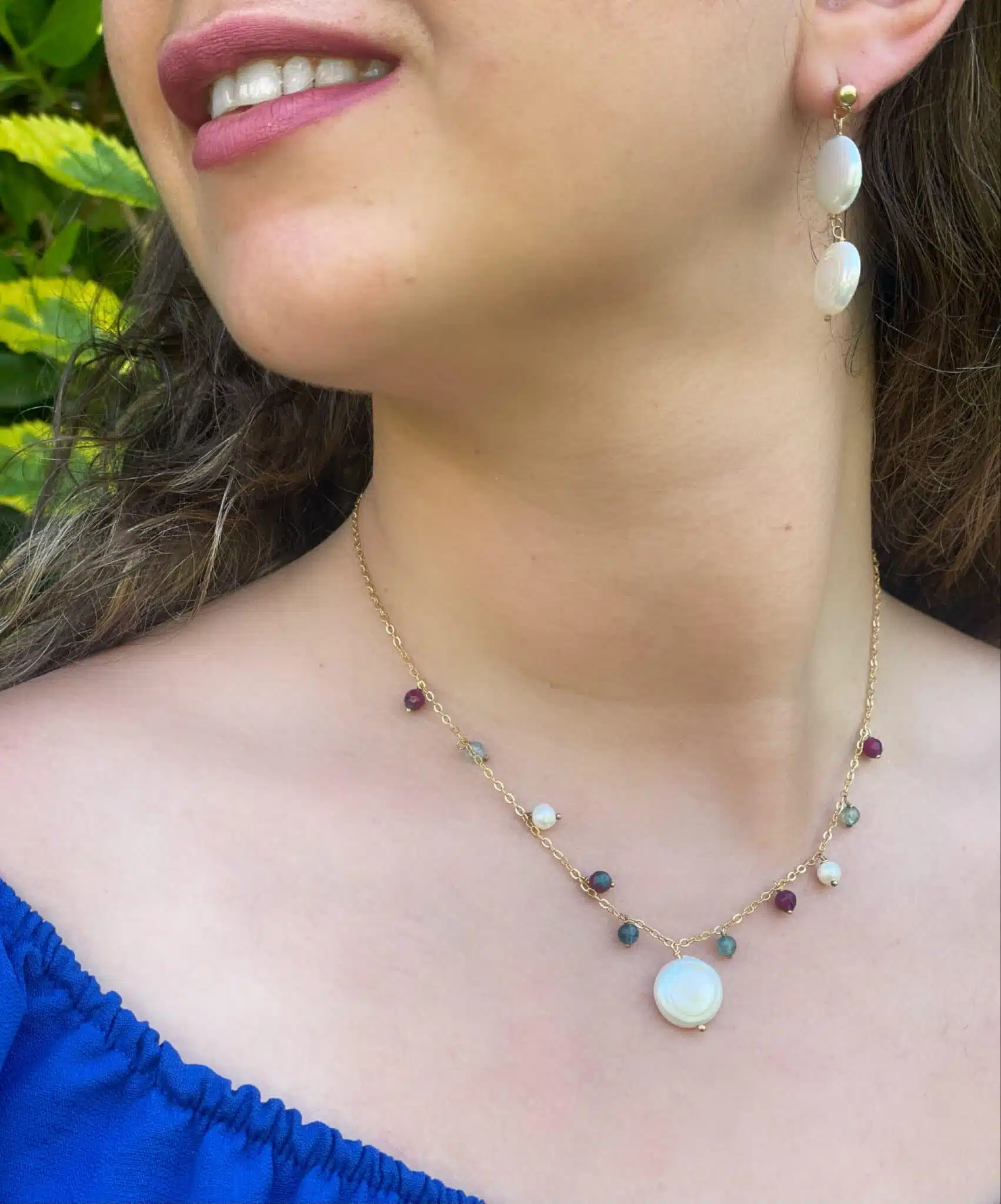 Pure 925 silver platted in 18k gold with a blend of natural pearls and stones necklace.