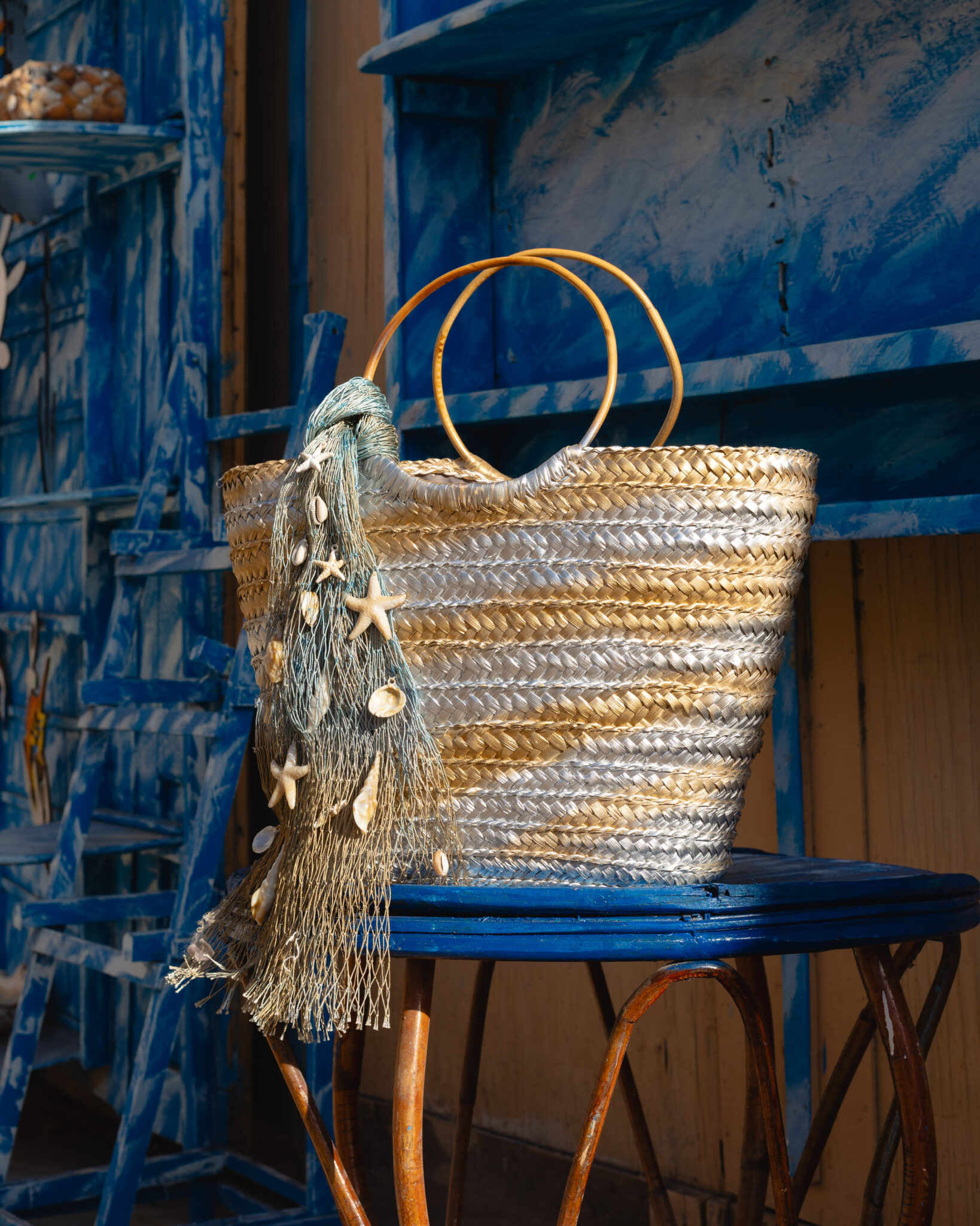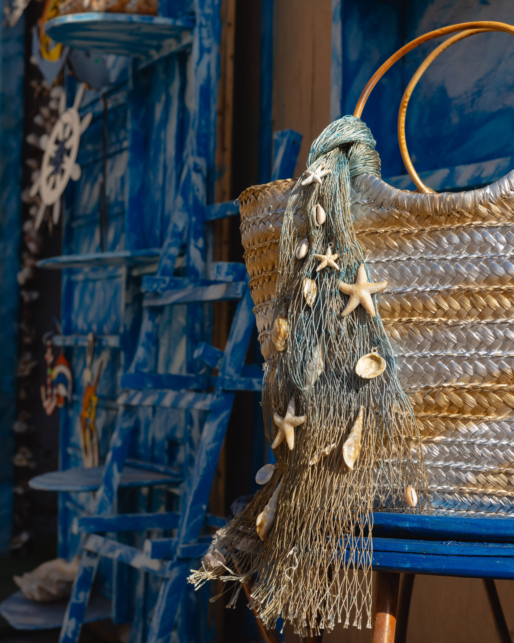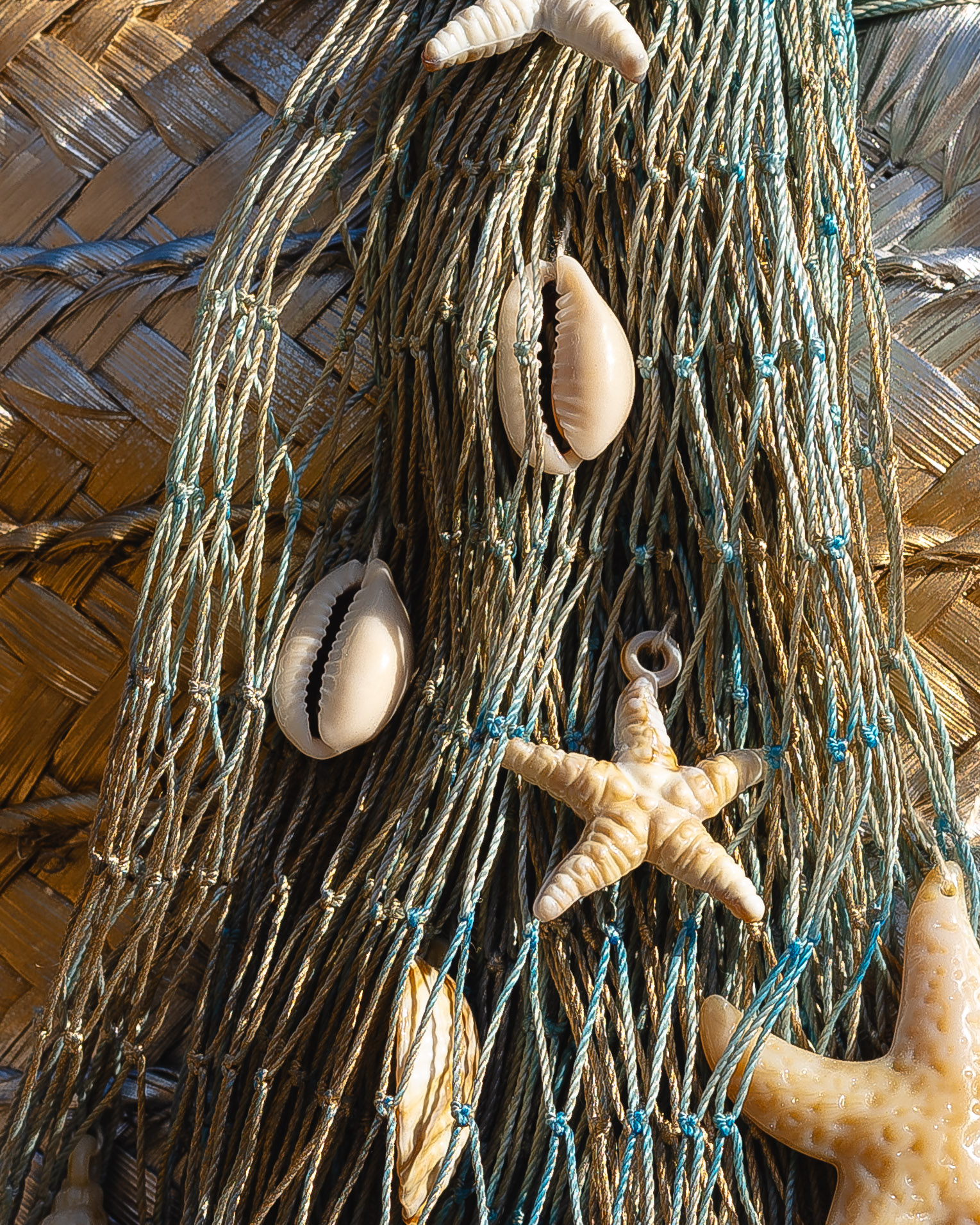 Decorated with seashells & starfish on a fisherman’s net