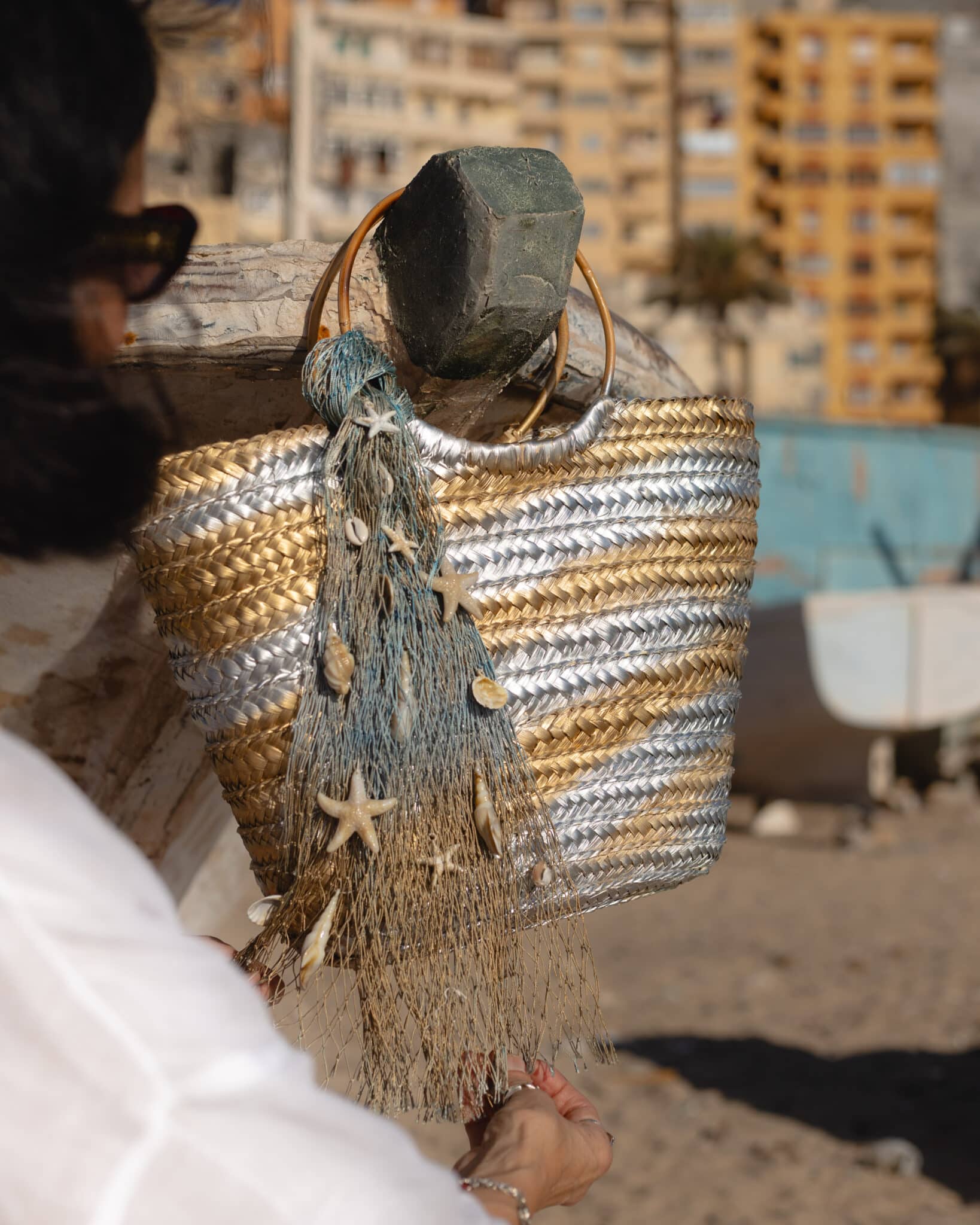 This eye-catching woven straw bag in silver and gold is the perfect accessory for your beach days!