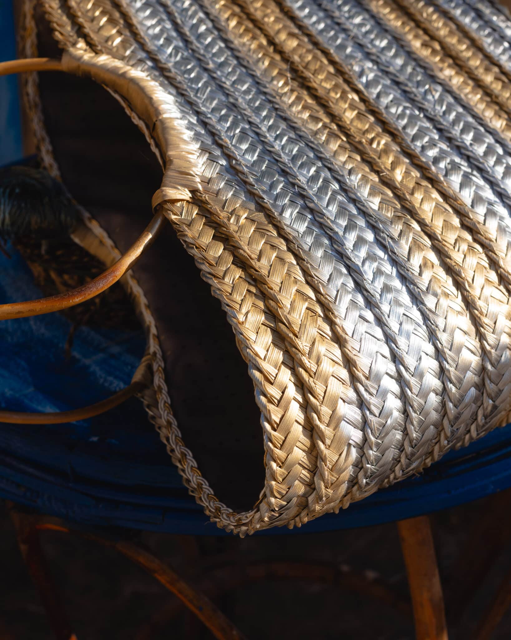 This eye-catching woven straw bag in silver and gold is the perfect accessory for your beach days!