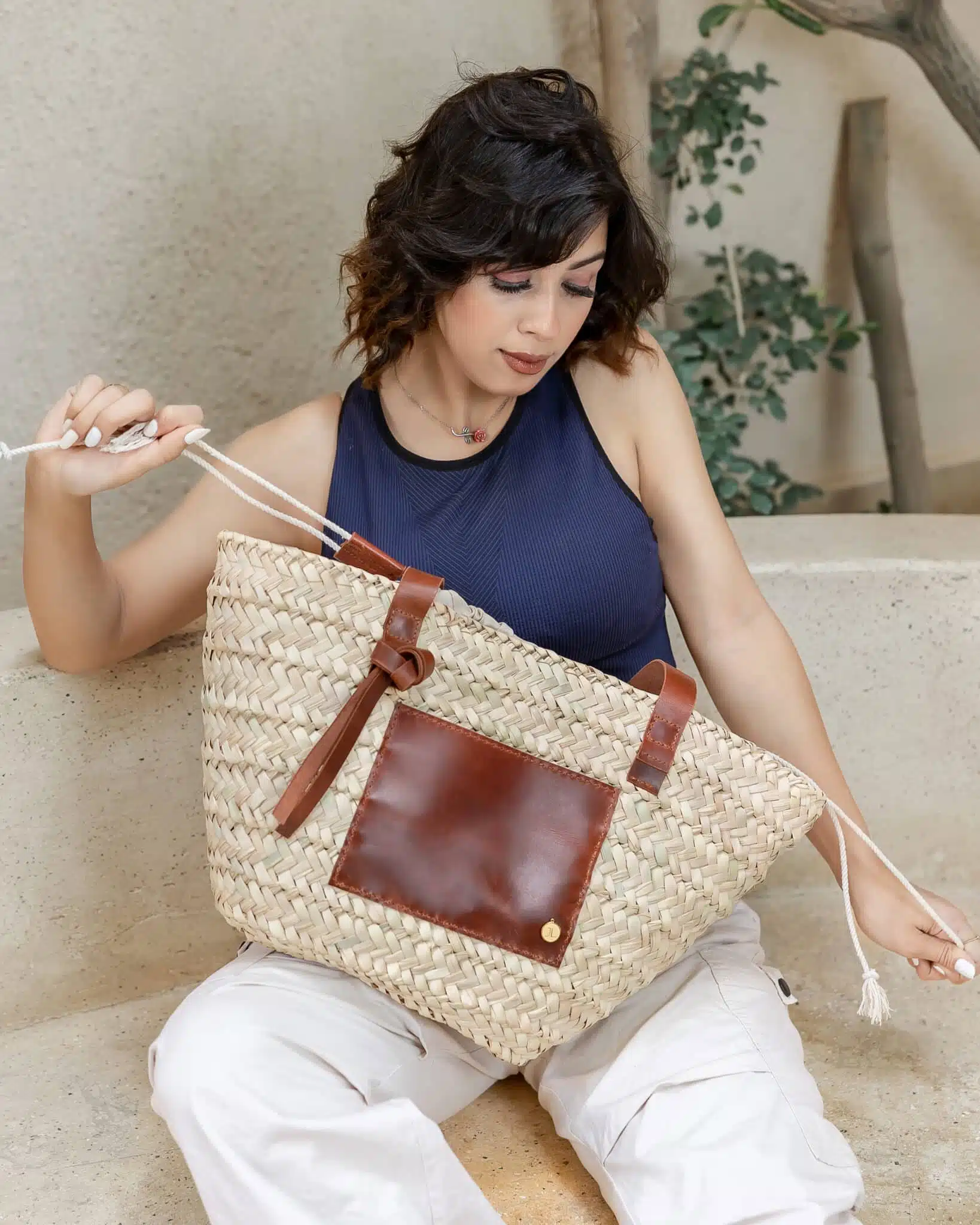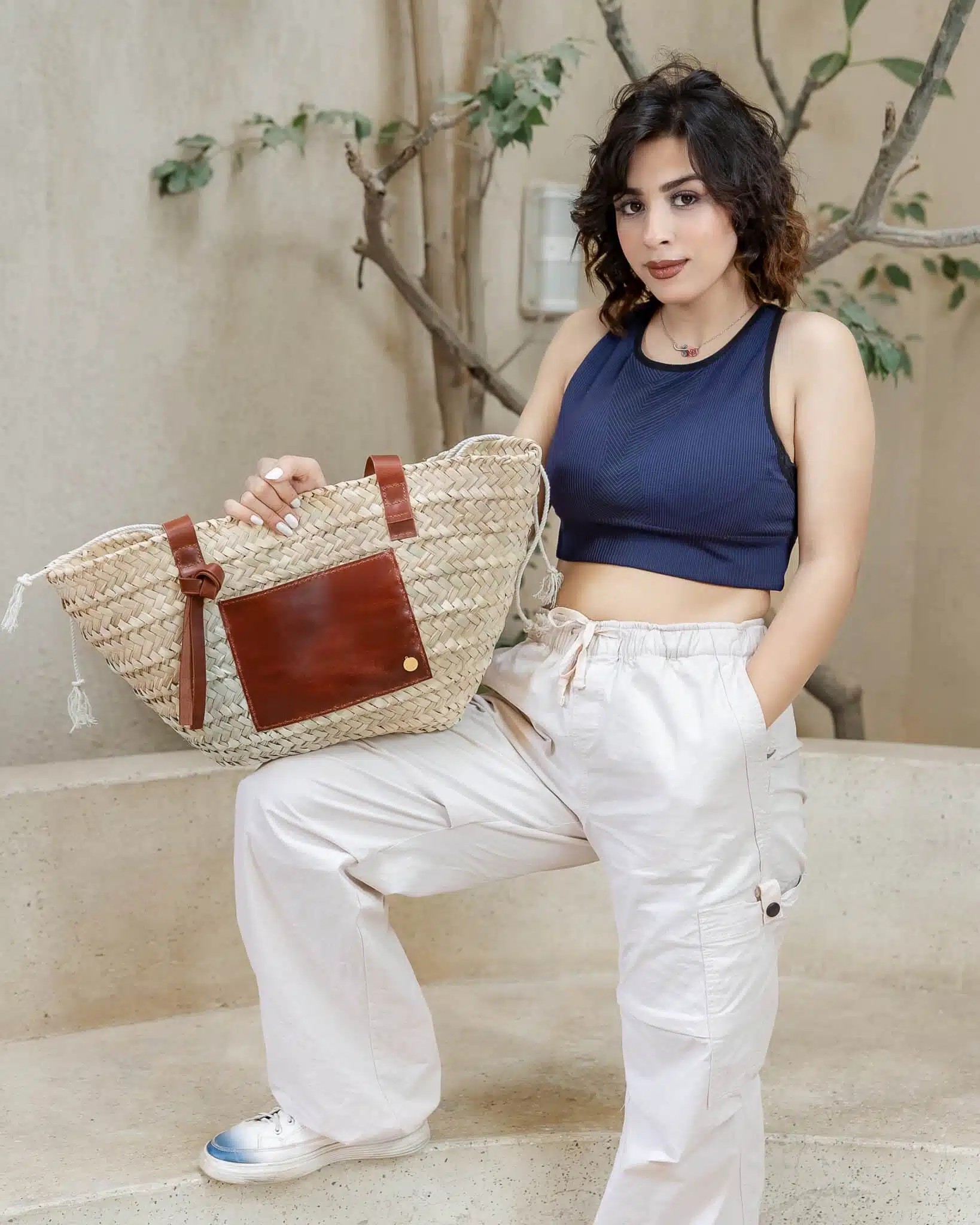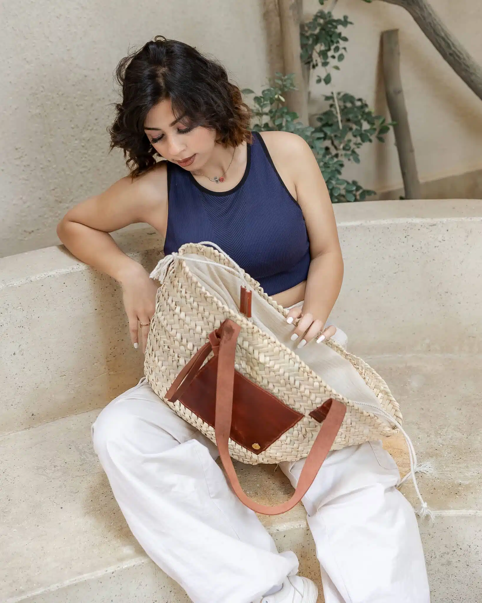 Material: Natural Straw and inner linen lining with genuine leather straps and outer / inner pockets