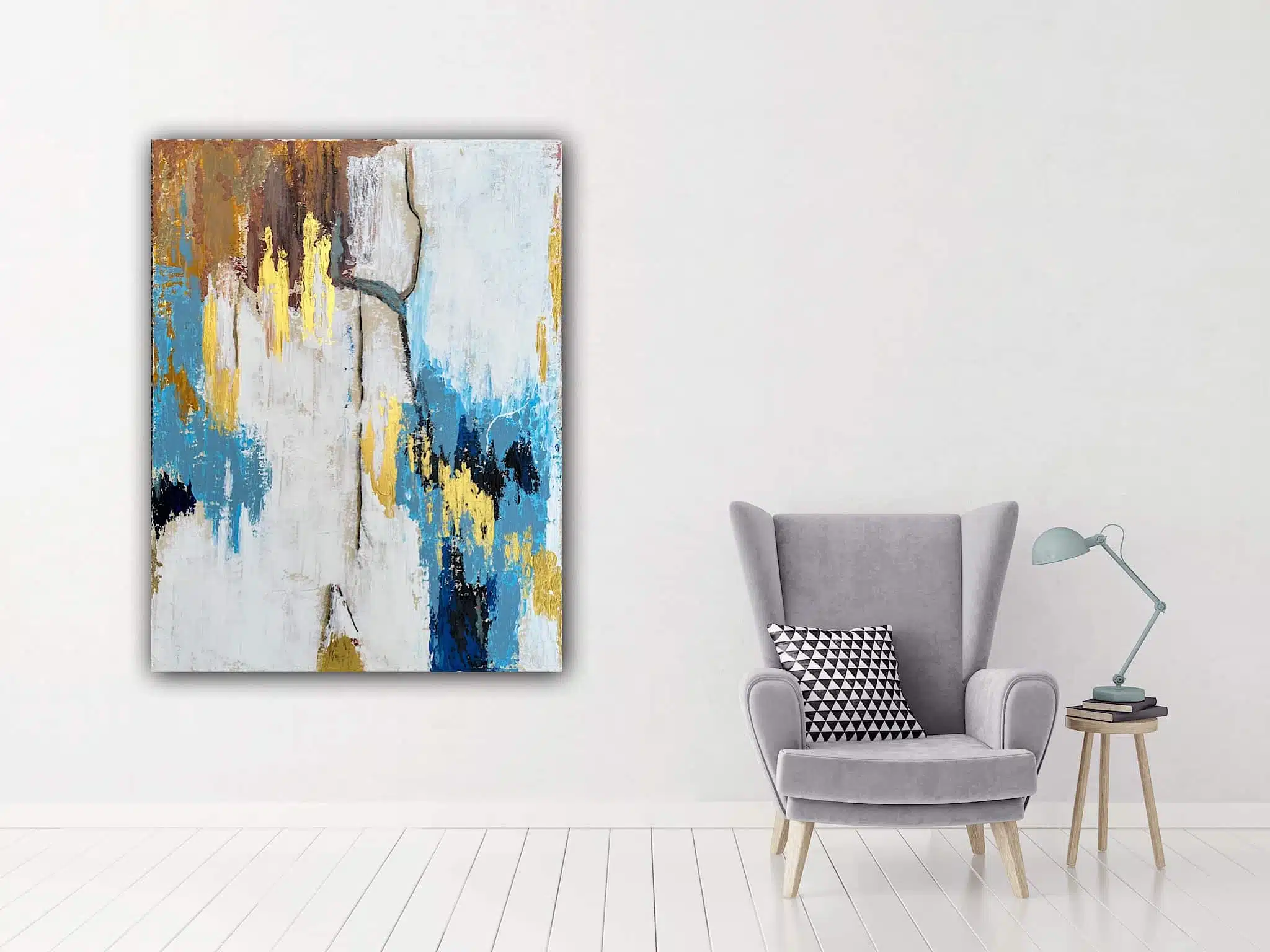 Acrylic painting on canvas, with gold leaf details.