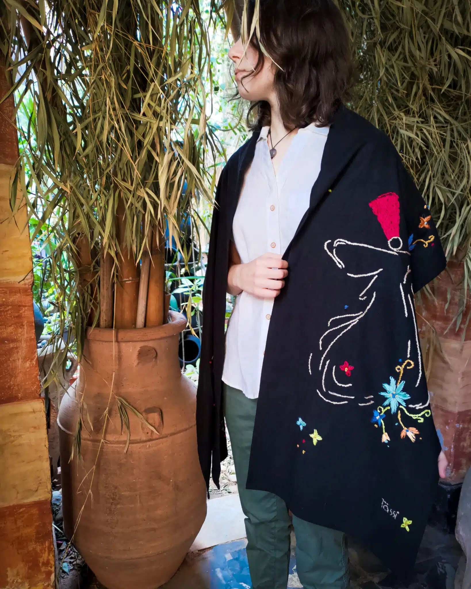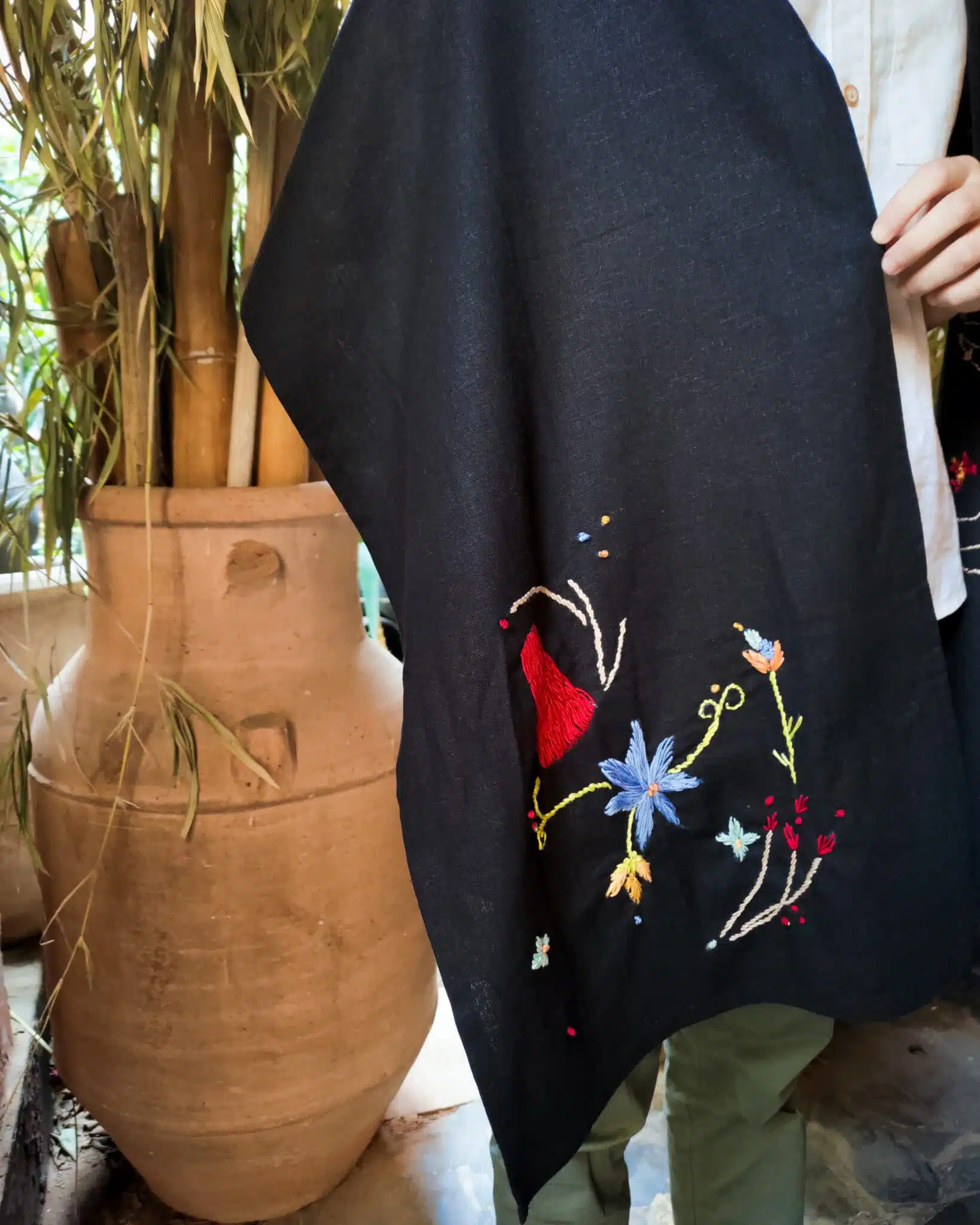 Black soft linen shawl handmade embroidered with Derwish motif.