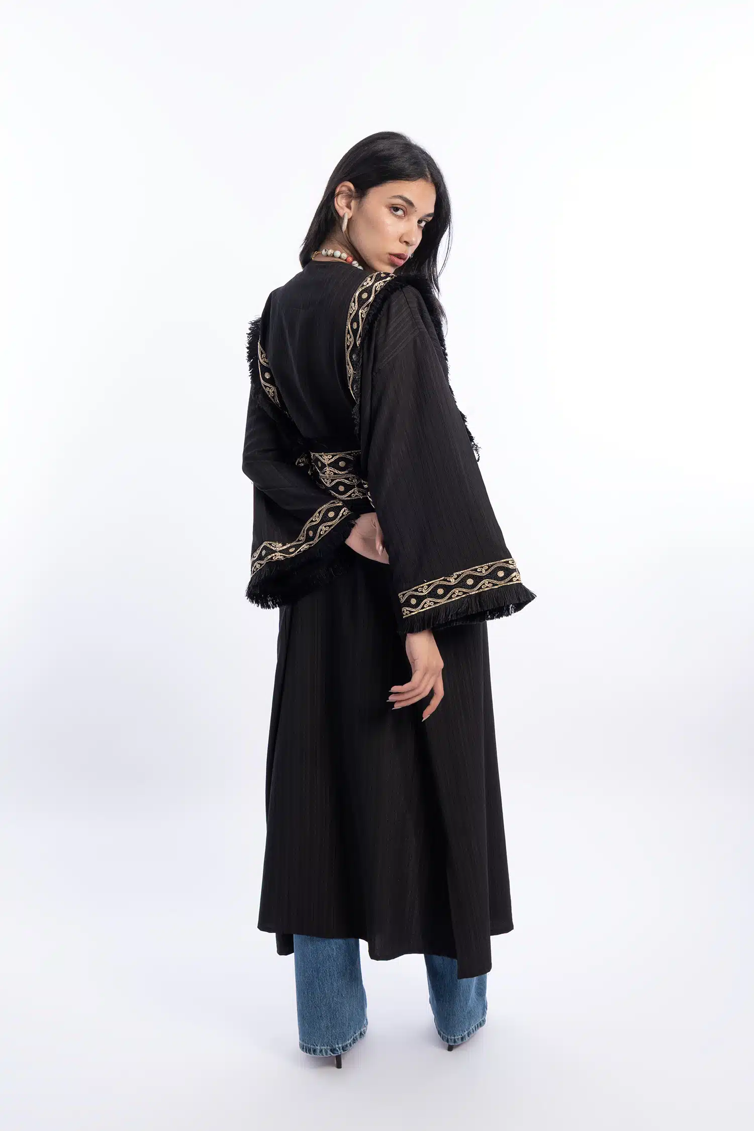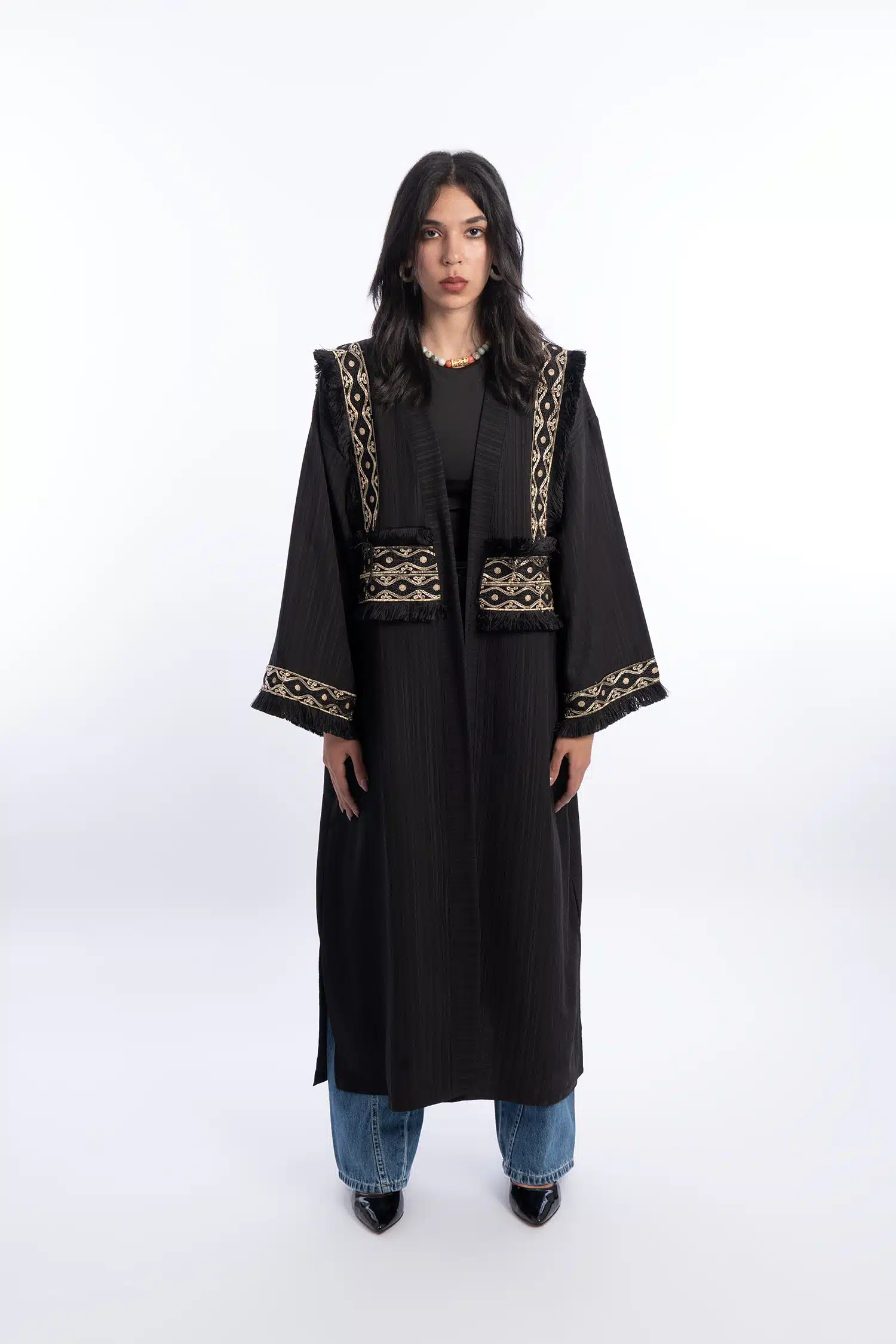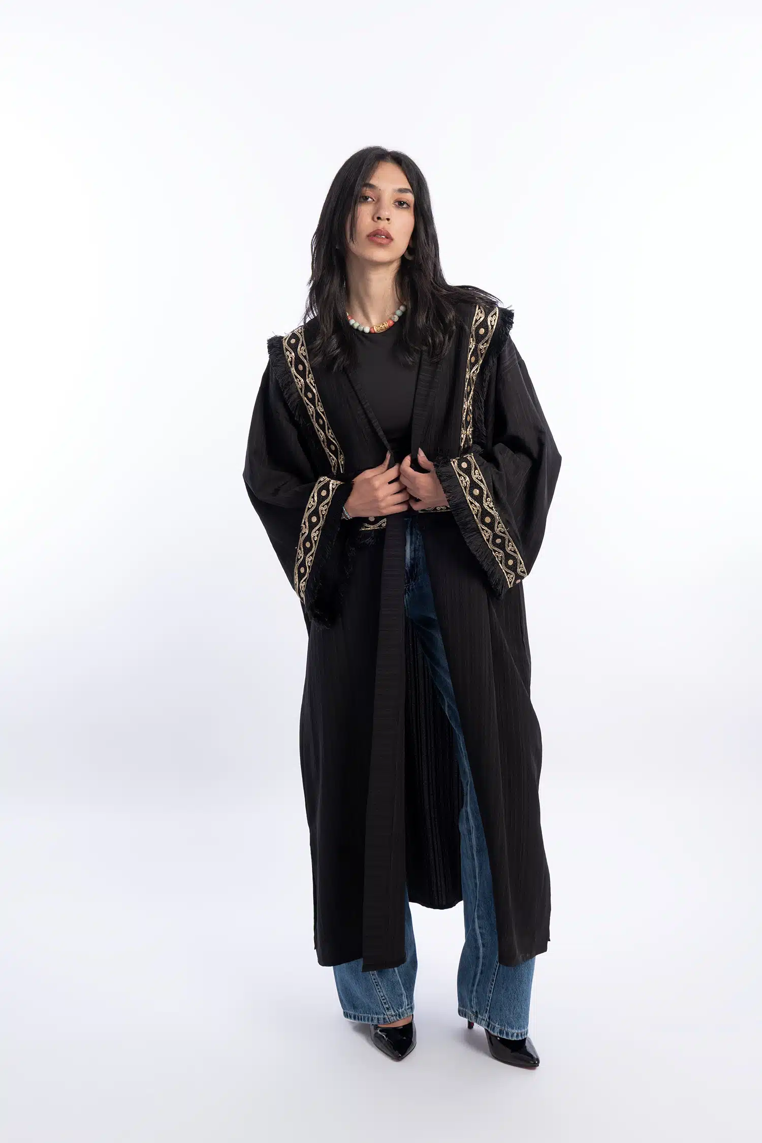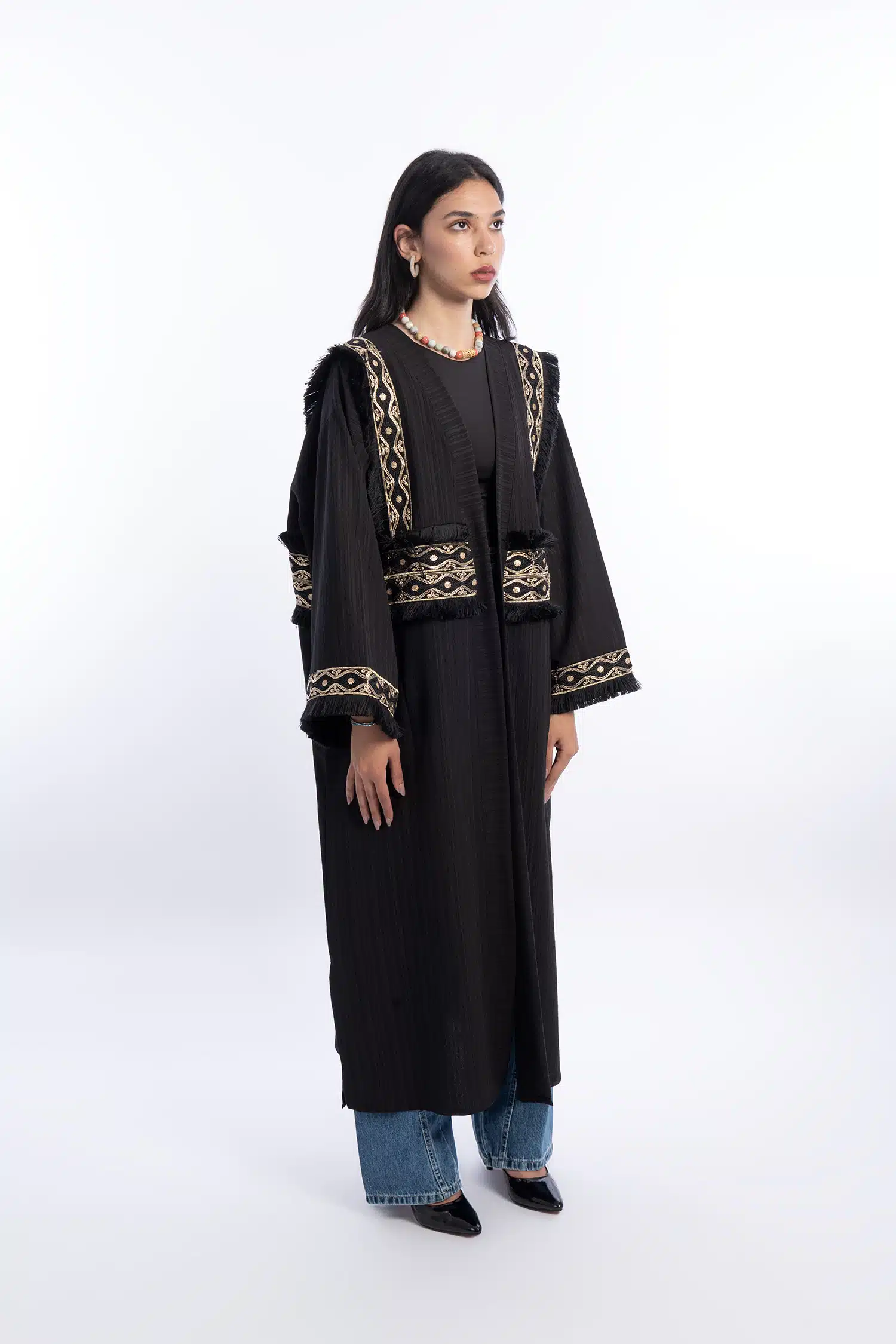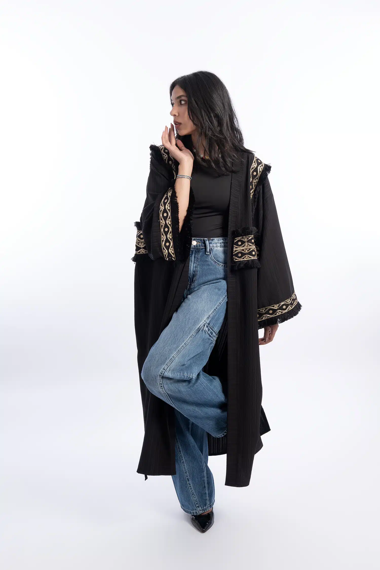 Black abaya with gold Indian accessories