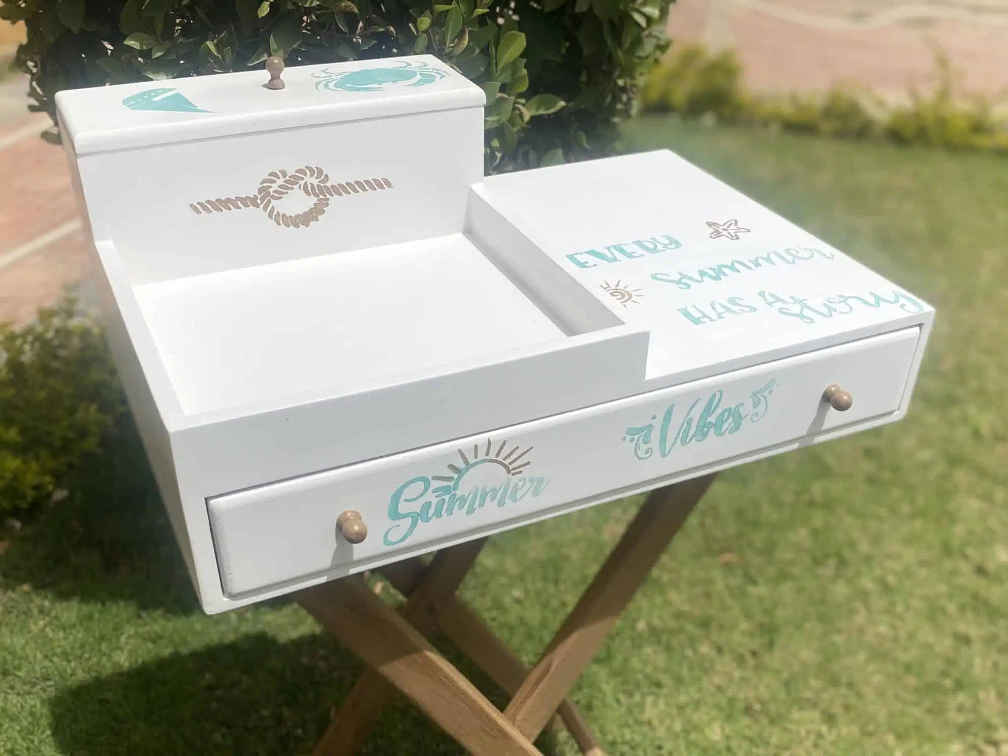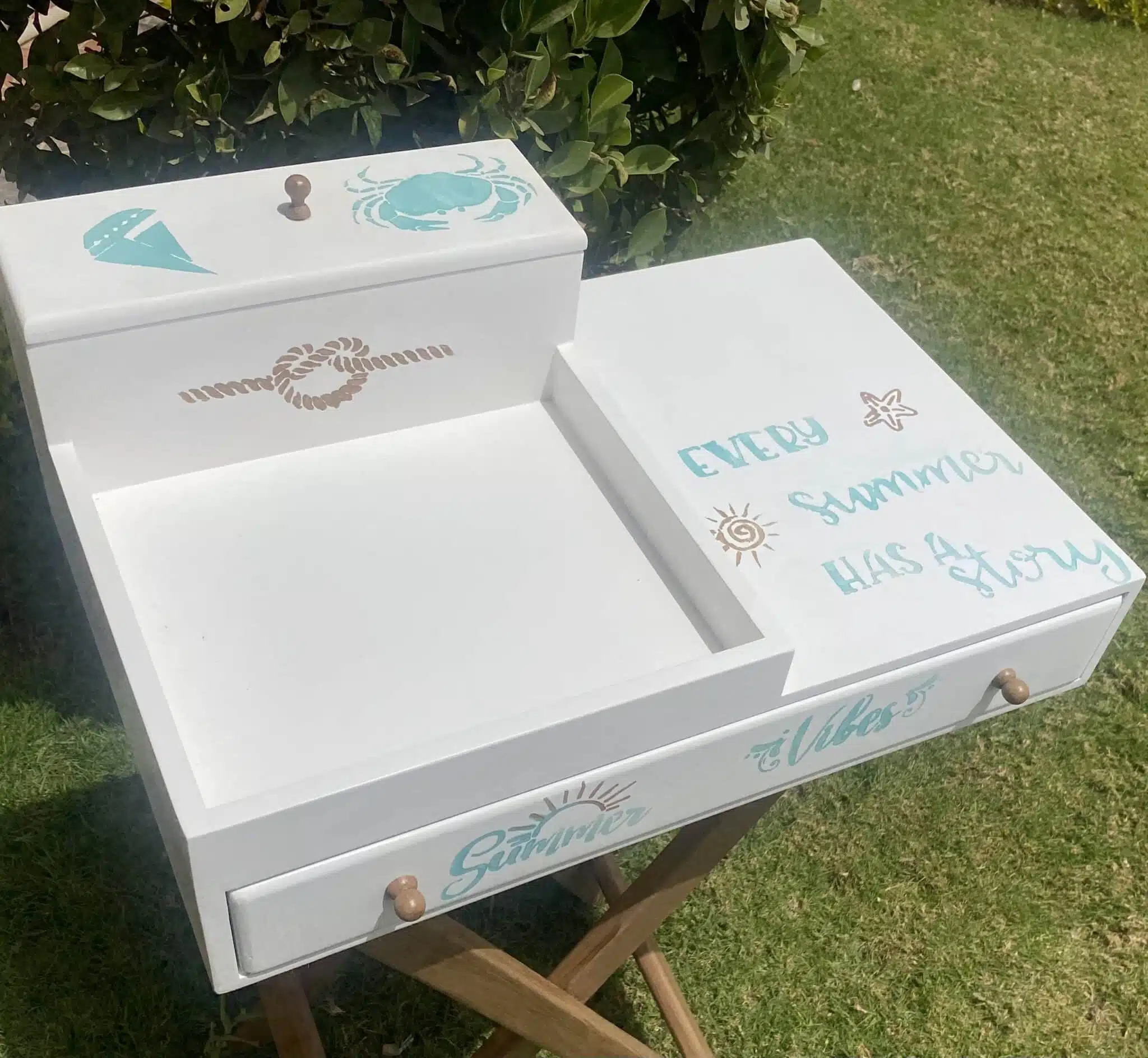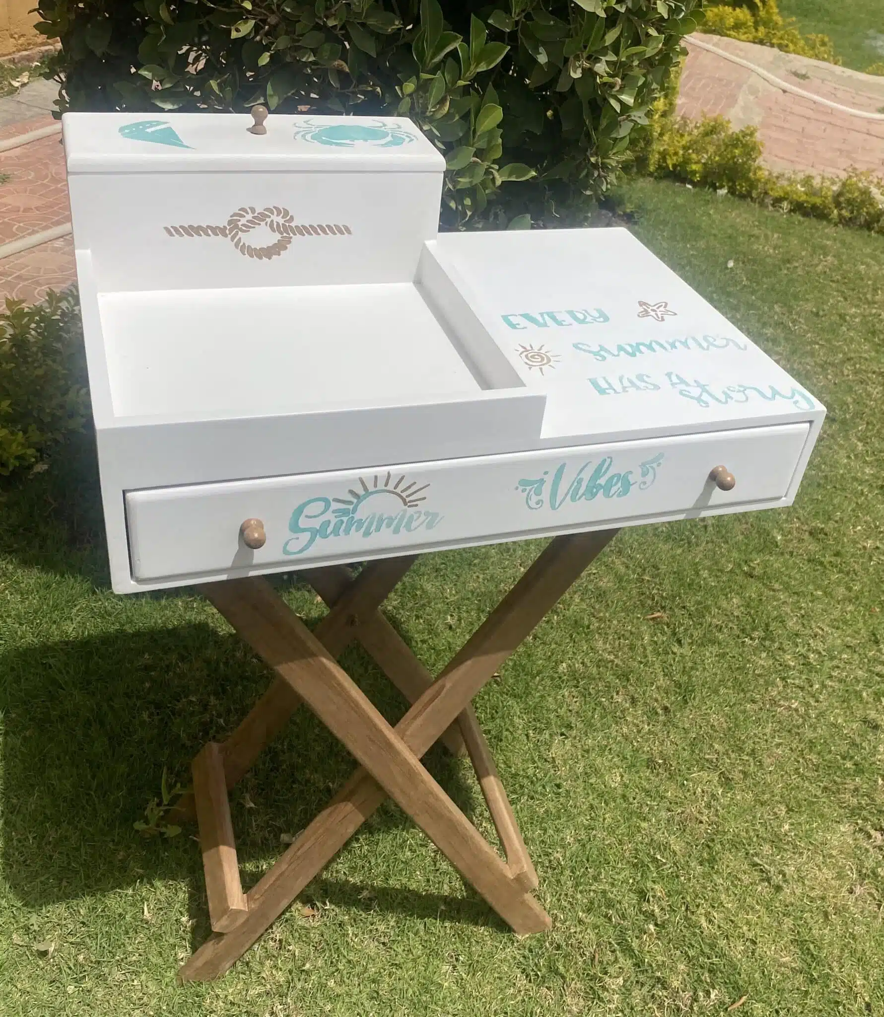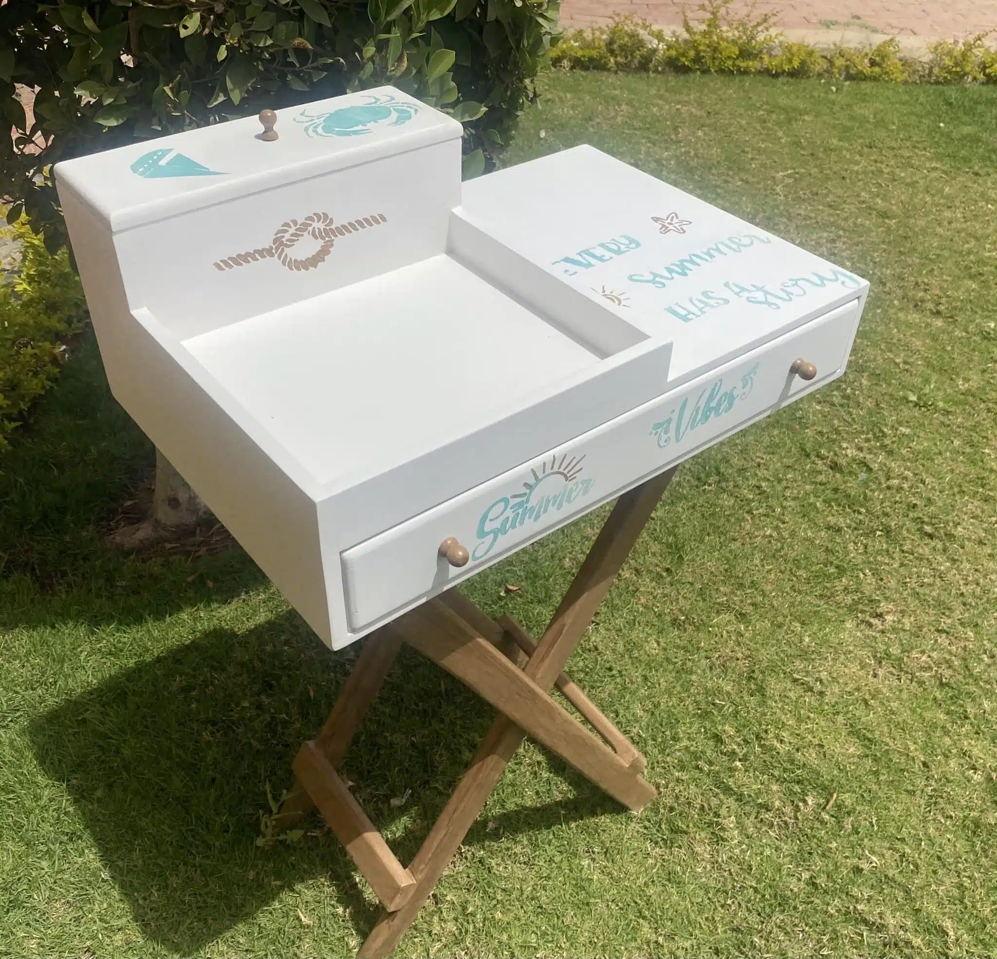 Wooden coffee table with foldable cross legs in summer theme
