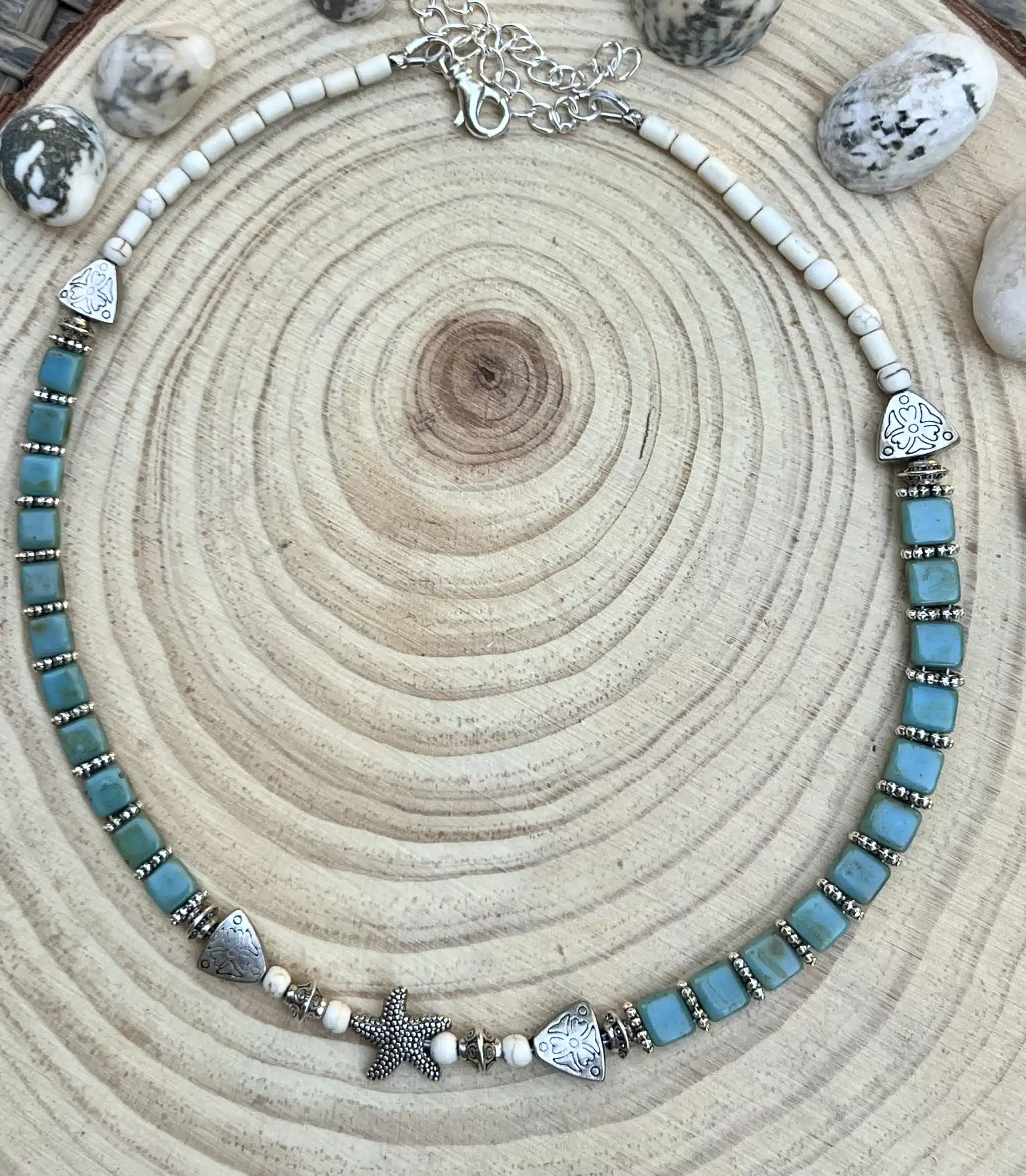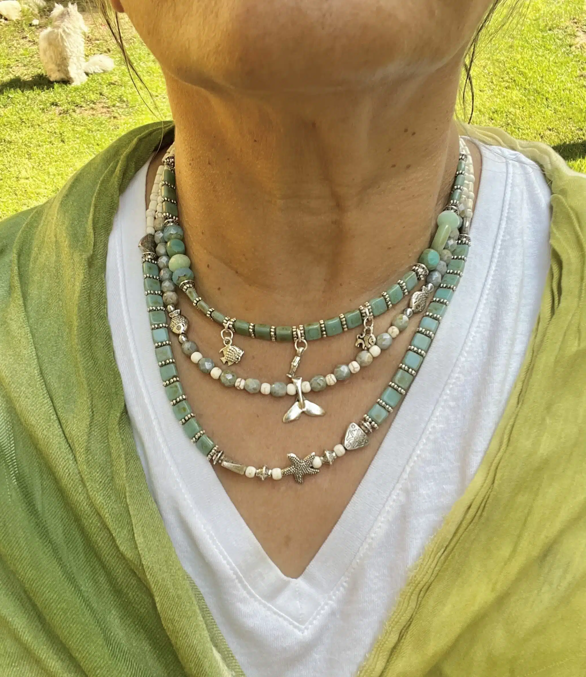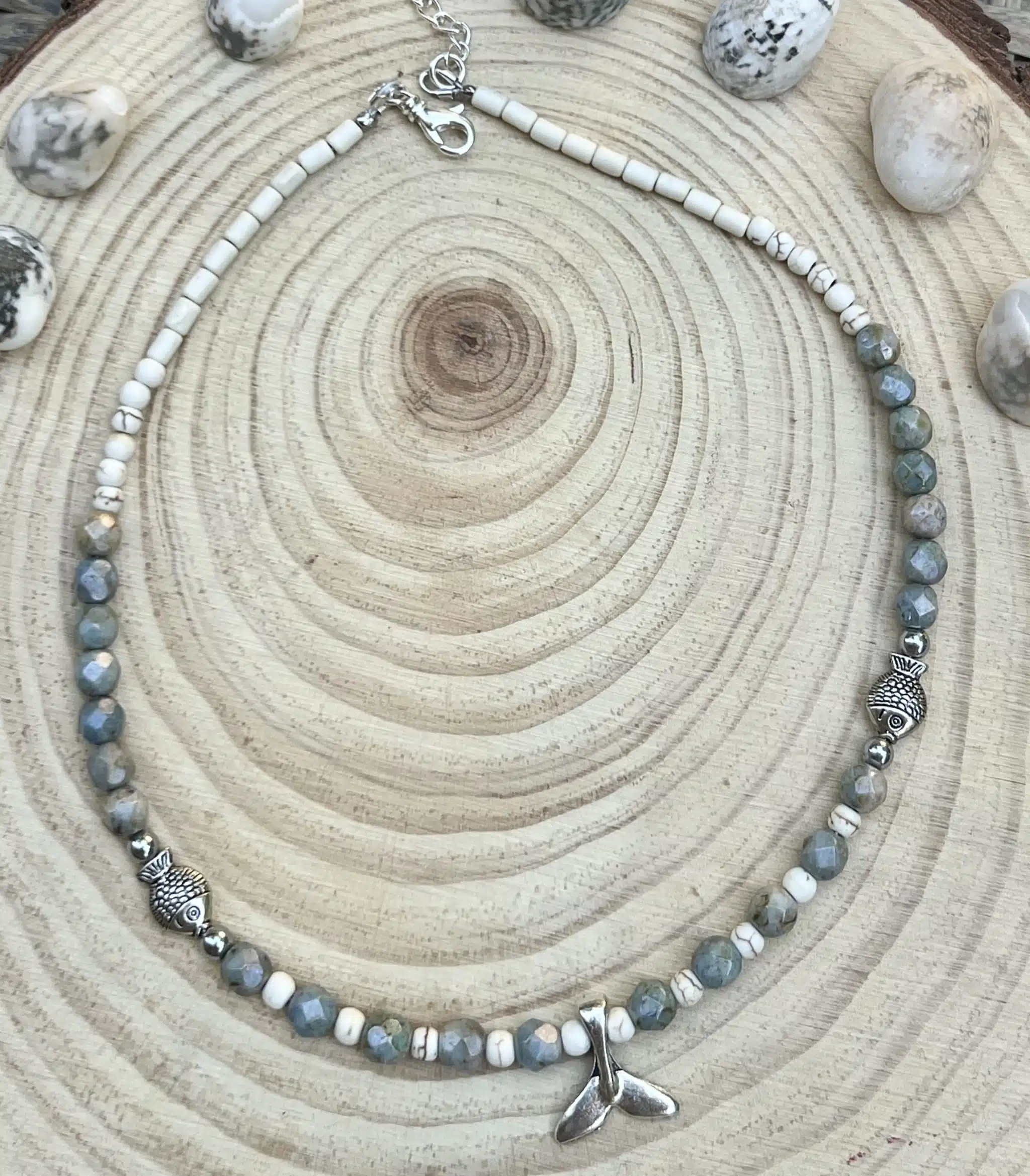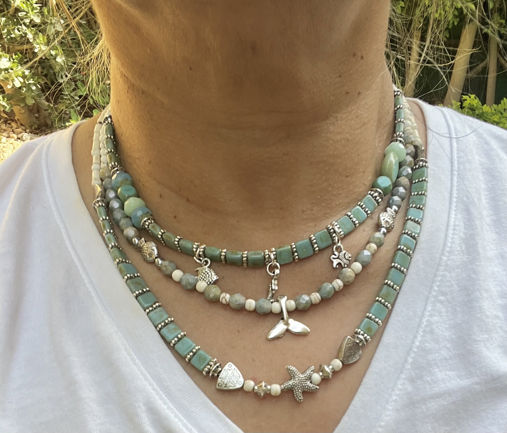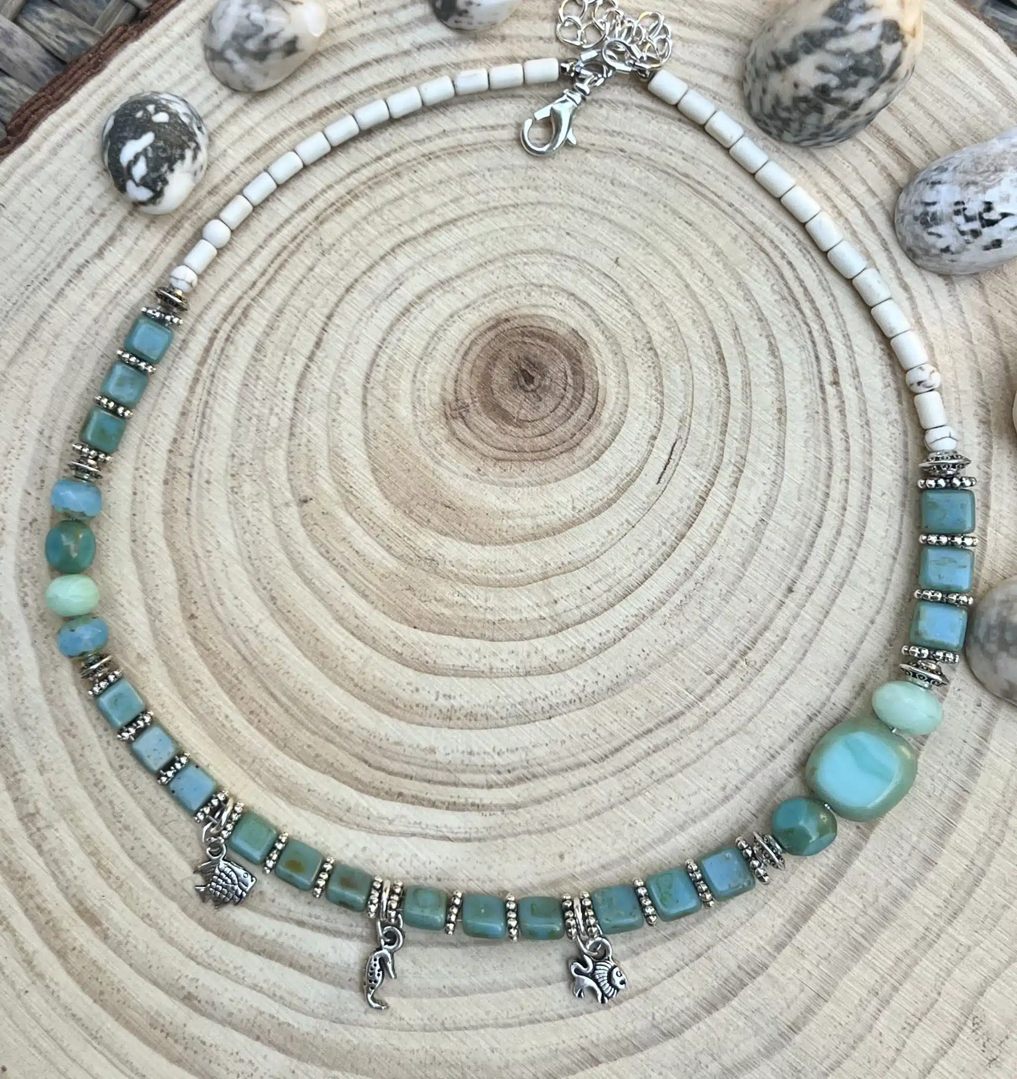 Handmade summer necklaces with beautiful iris green glass beads, white howlite beads, with silver plated spacers, fish & fish tale charms, fish, starfish beads.