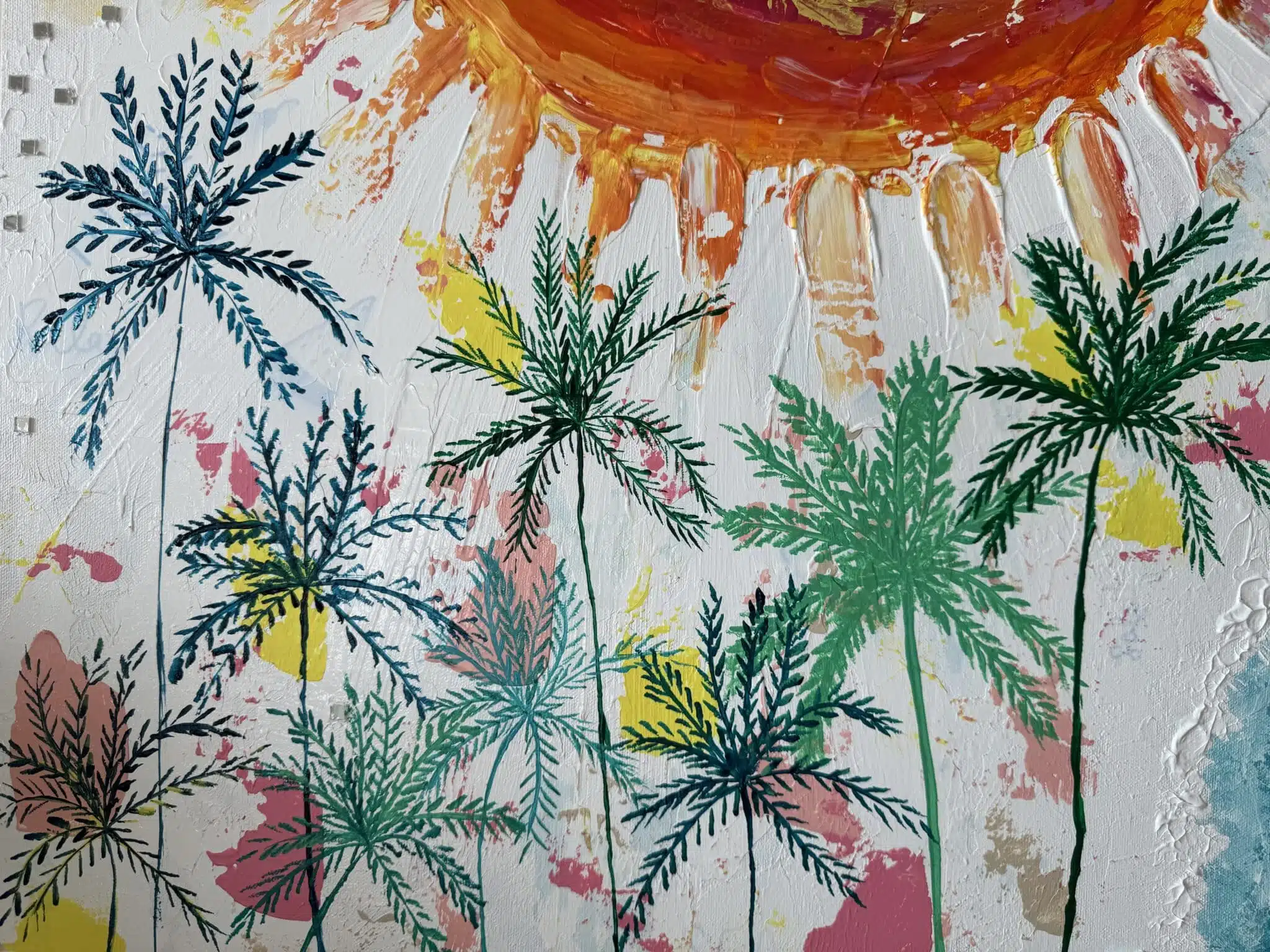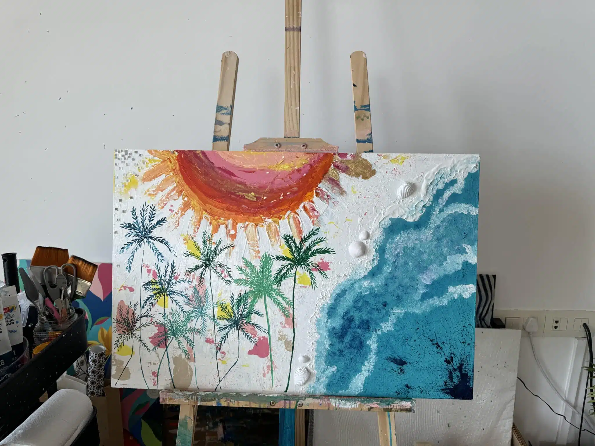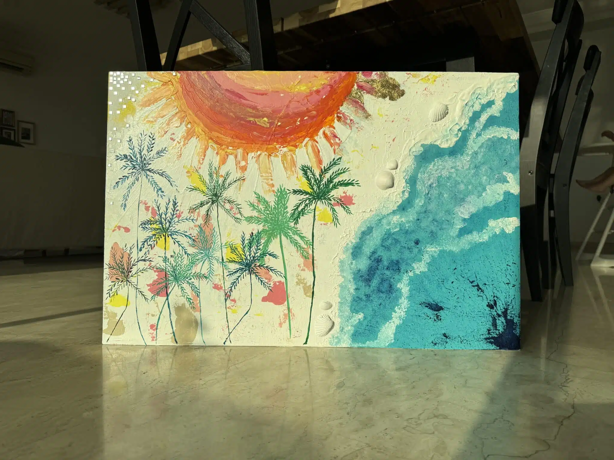 Acrylics with mosaic mirrors, gold leaf and seashells