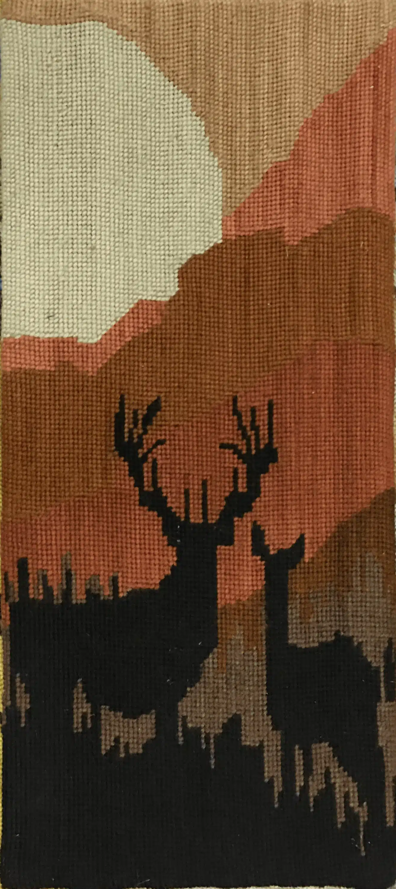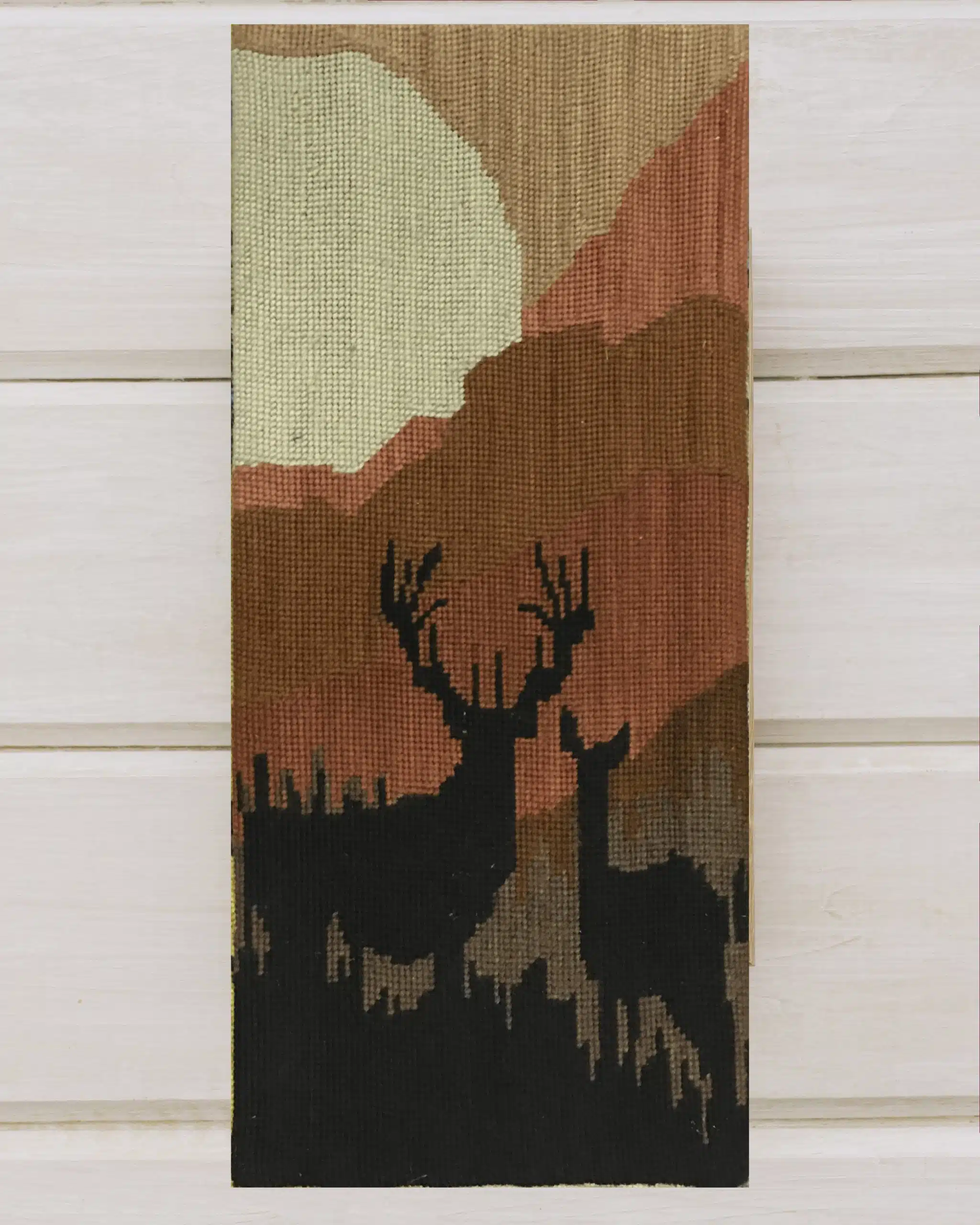 This handwoven tapestry captures the serene beauty of a sunset in the wilderness. With rich earthy tones and a contrast of shadows, the design highlights two deer standing gracefully against a backdrop of mountains and a setting sun. The intricate weaving showcases fine craftsmanship and attention to detail, making it an excellent addition to any nature-inspired décor.