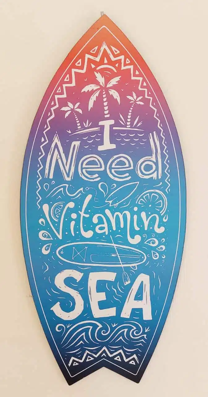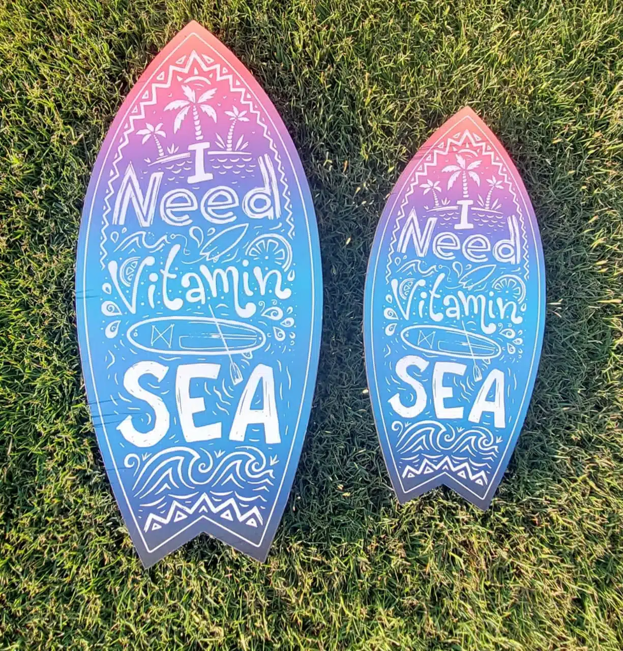 Wall Wooden Hanger Size A4, Surfing board shape with Caption I need vitamin sea