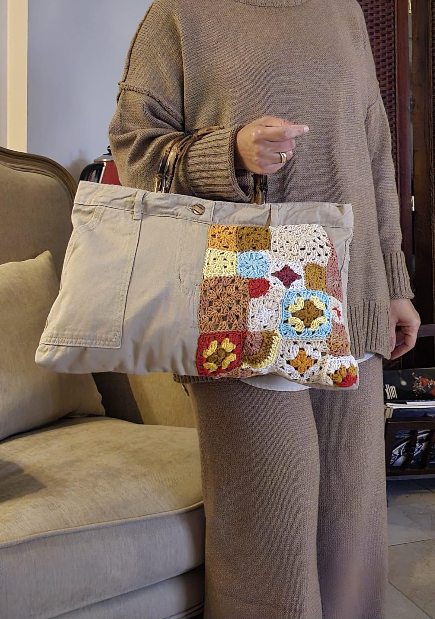 Burlap crochet tote bag