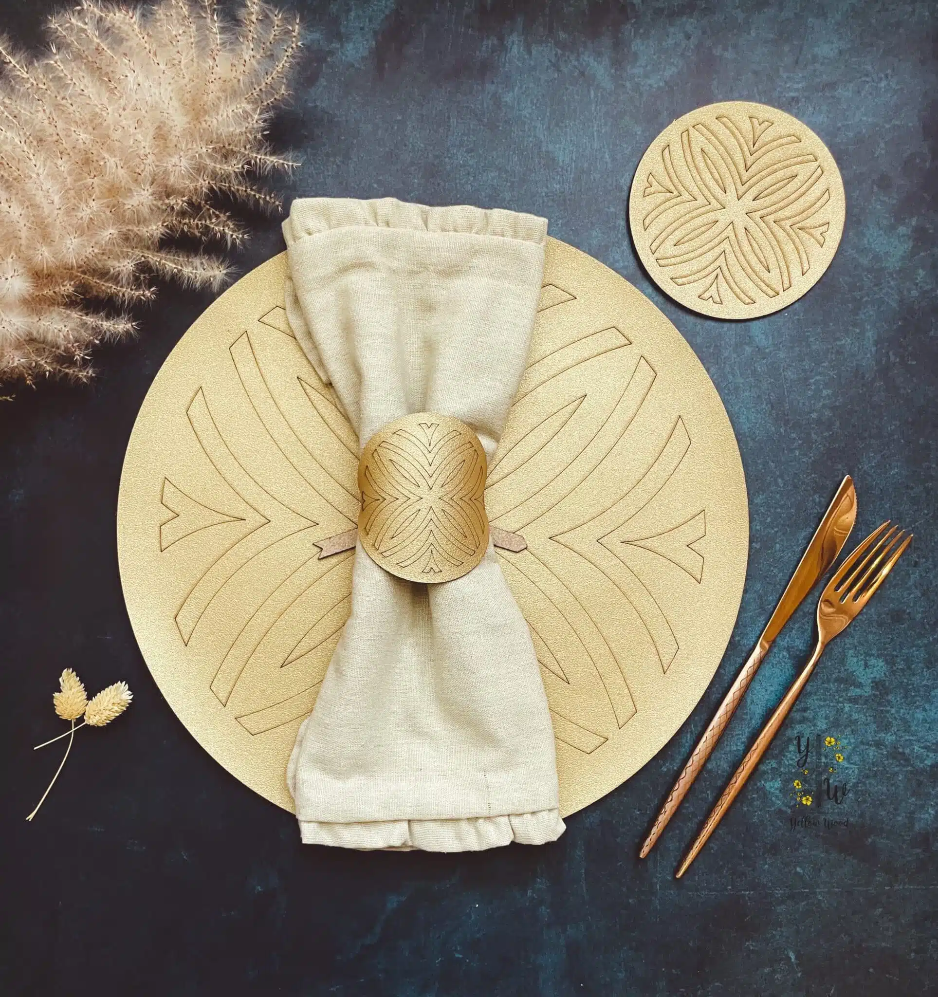 | Set | Silver Napkin Holder, Gold Napkin Holder, Rose Gold Napkin holder, Silver Placemat, Gold Placemat, Rose Gold Placemat, Silver Coaster, Gold Coaster, Rose Gold Coaster |