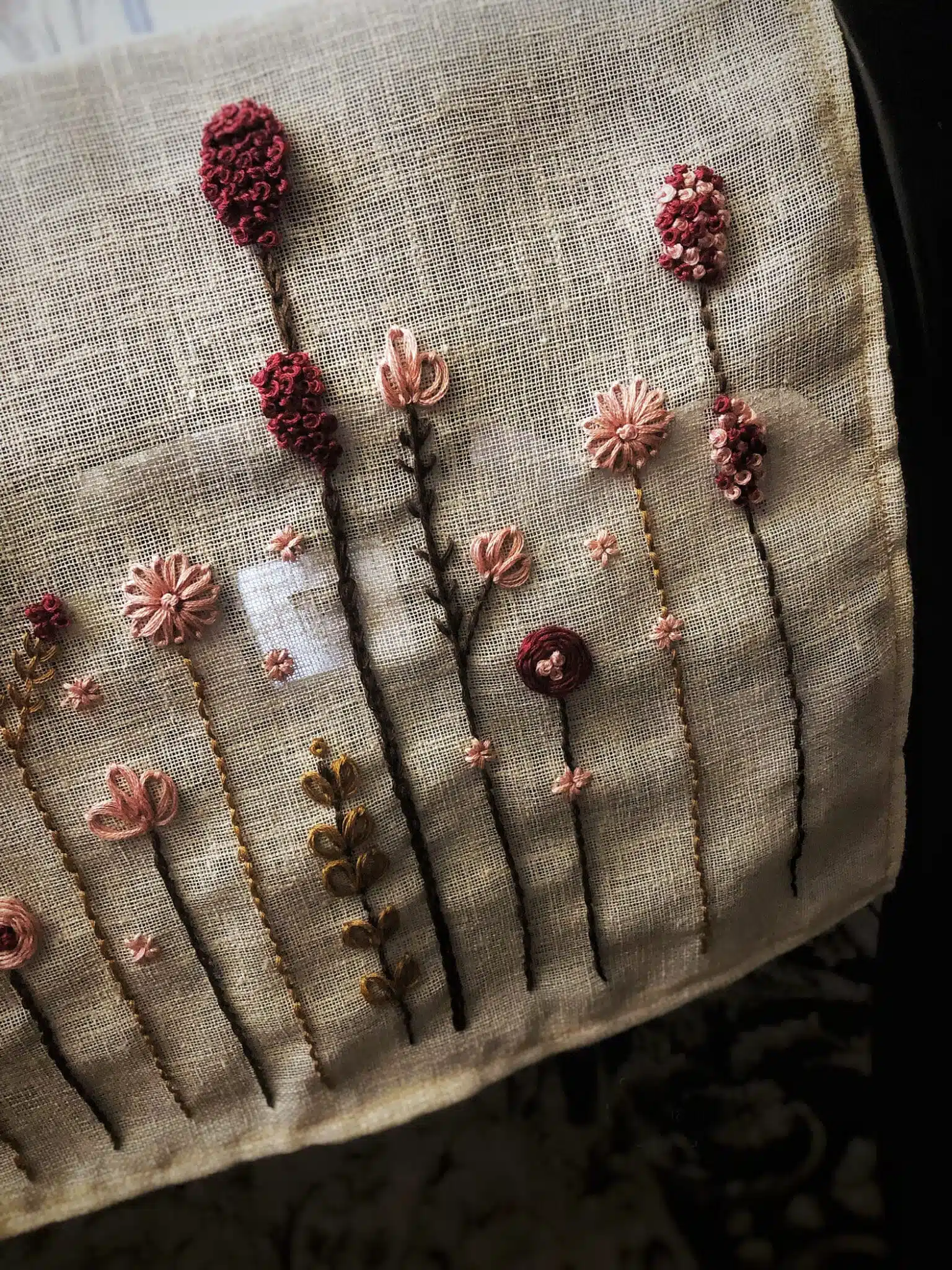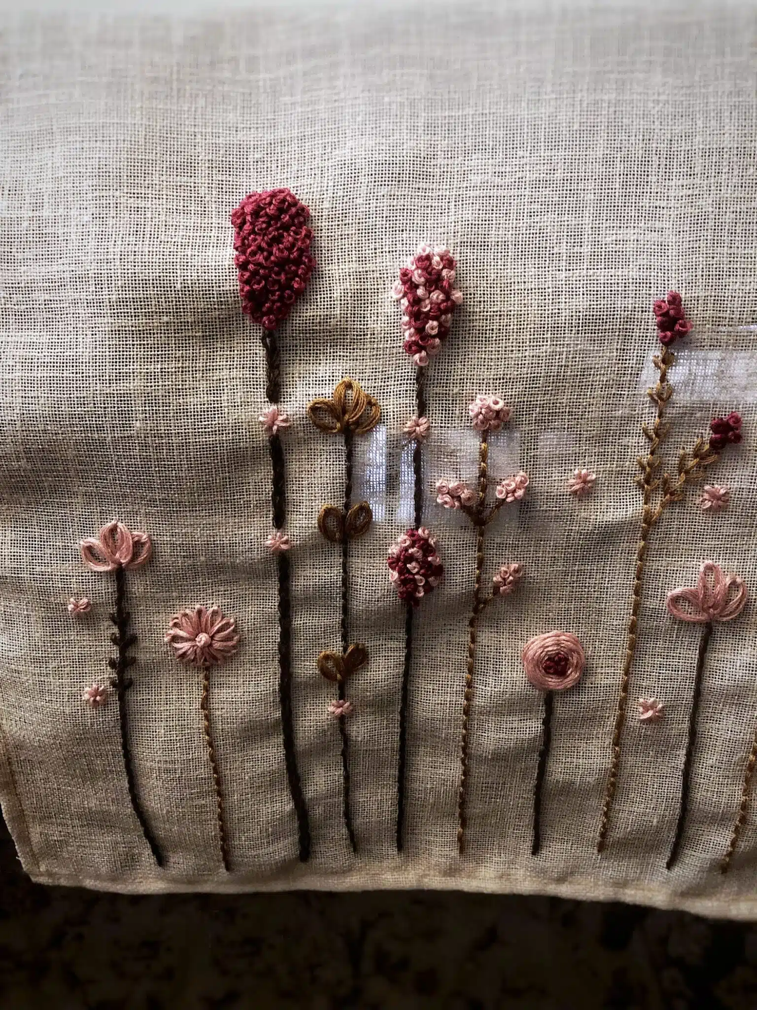 Introducing our linen table runner with exquisite hand embroidery, featuring a delightful display of flowers.
