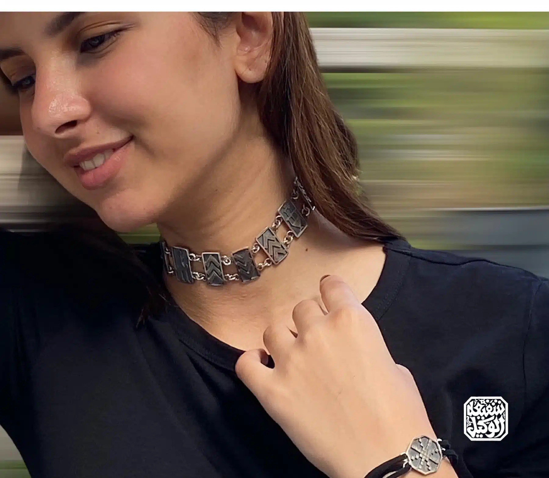 Our sterling silver Tally choker with different motifs of the famous Tally embroidery using silver threads , well known in upper Egypt .