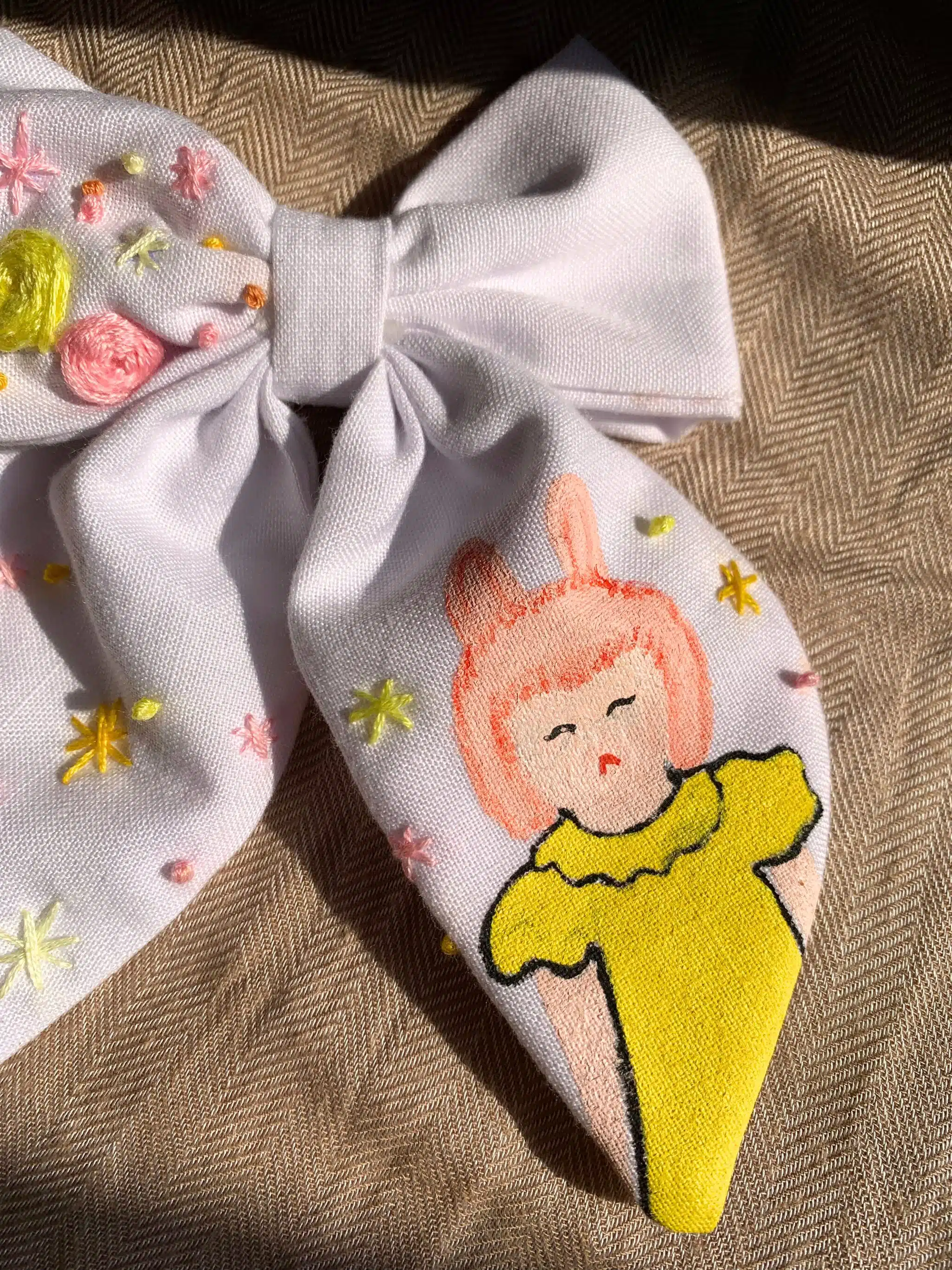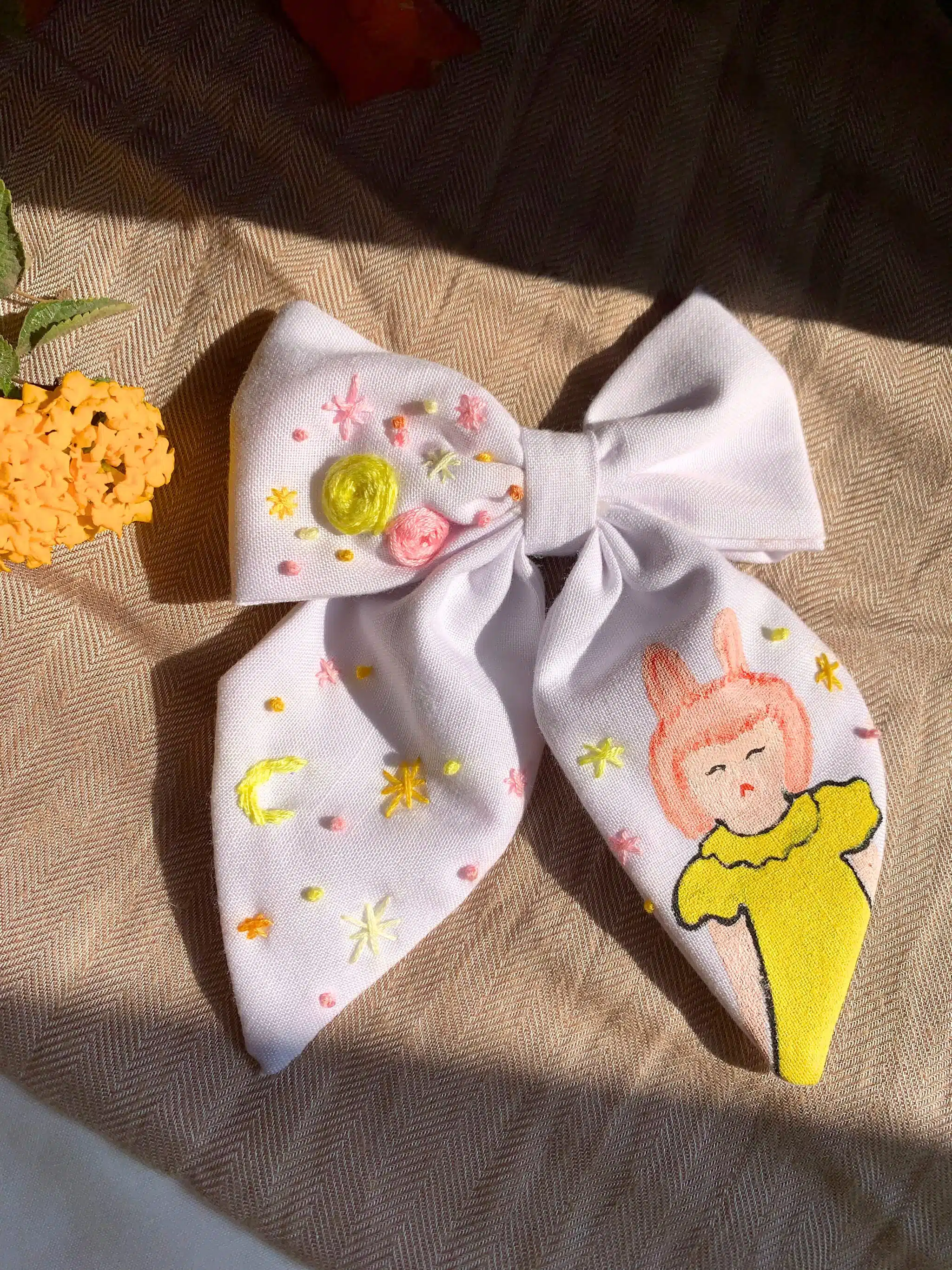 A fully handmade hair tie that captures the magic of Egyptian Ramadan and the warmth of cherished memories. Featuring intricate hand embroidery and delicate hand-painted details, it reflects the beauty of Ramadan’s glowing nights. Inspired by Tamtam, the smart and kind-hearted girl from Boogie and Tamtam, a beloved part of our childhood Ramadan traditions. Embroidered with a crescent moon and stars, Tamtam appears in her signature yellow dress, as if telling the stories of Ramadan from the past. A unique piece that carries a touch of nostalgia and authenticity.