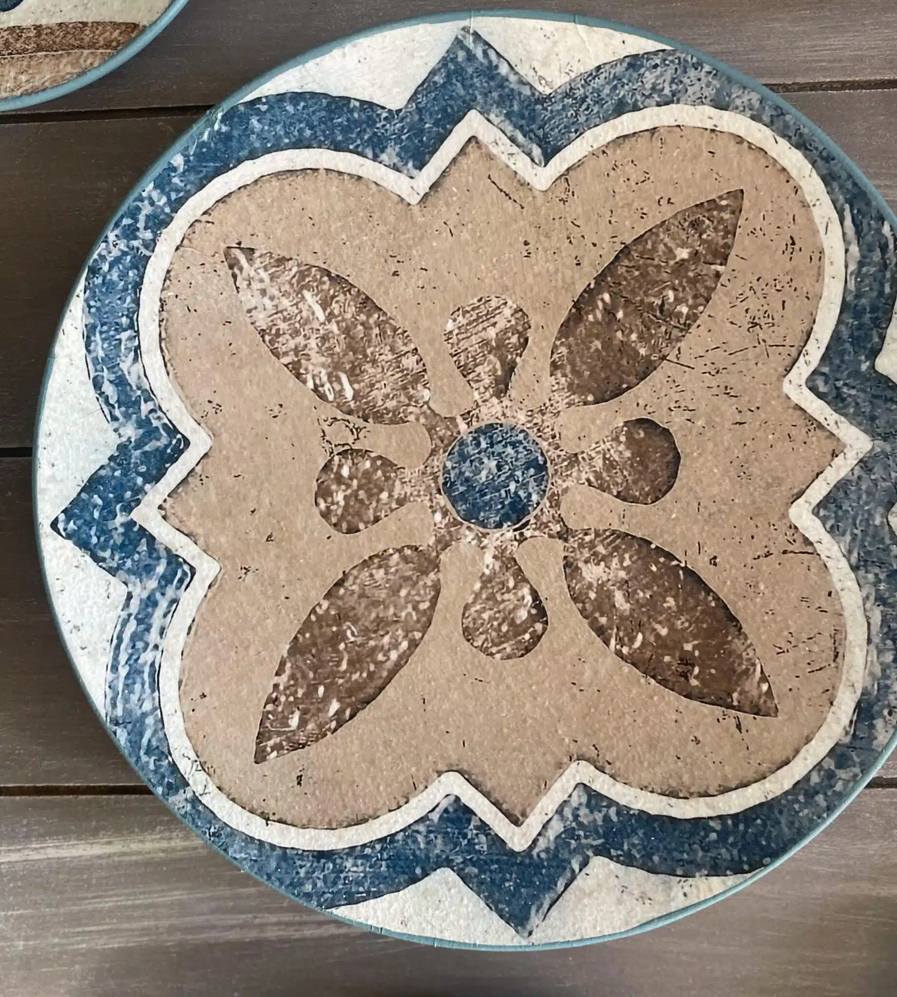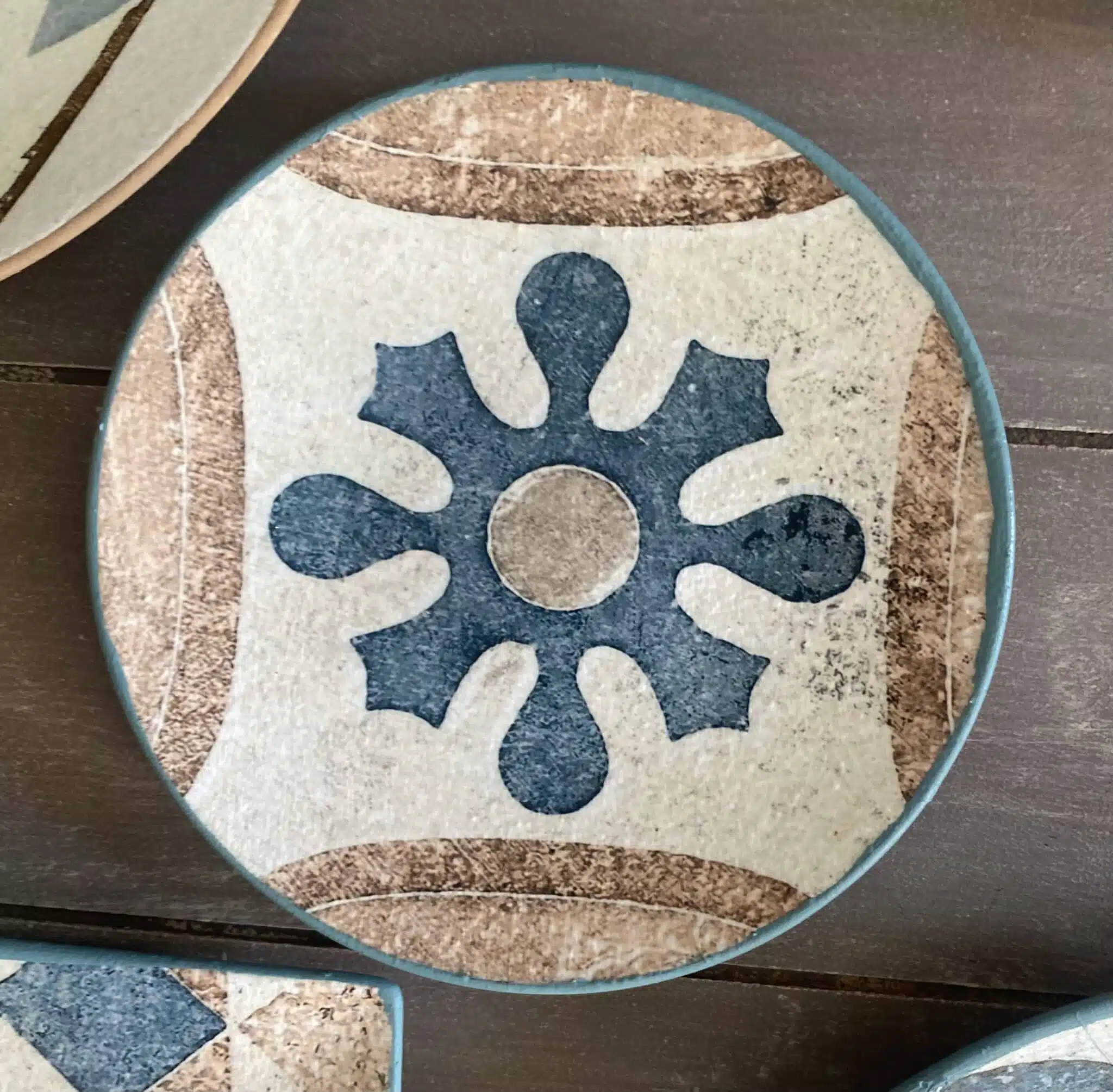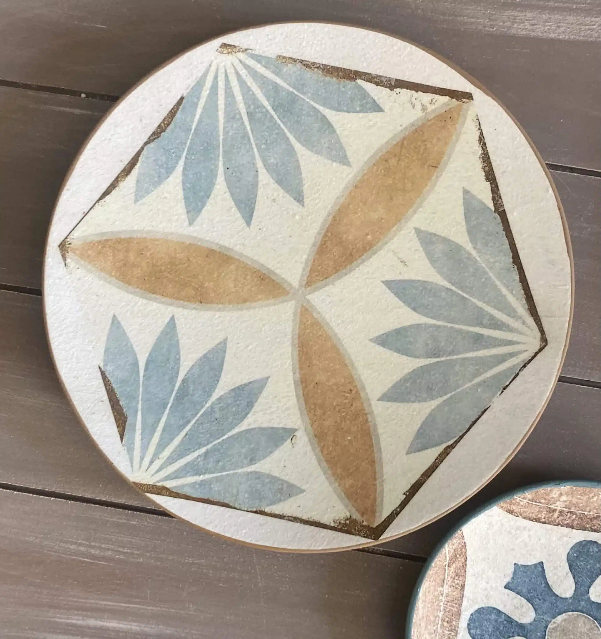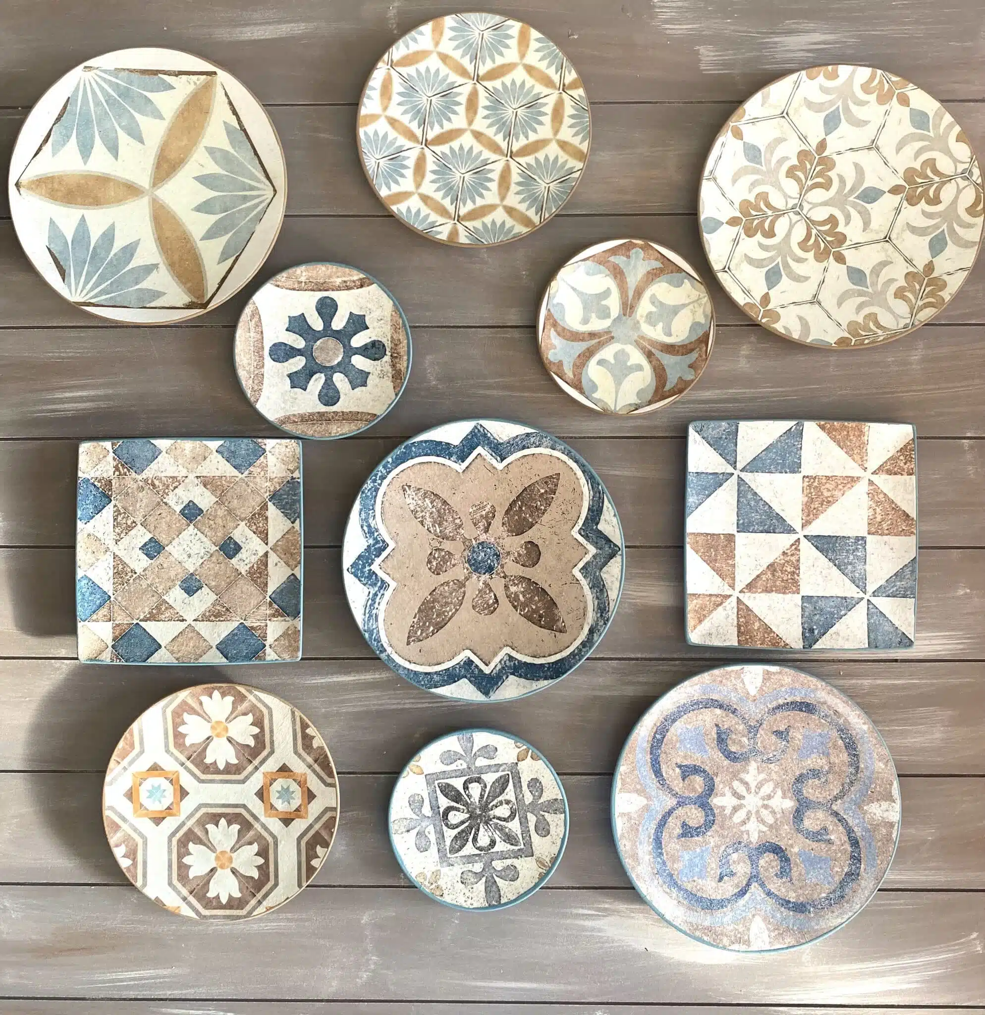 Decoupaged wall plates in Spanish tiles design and teal color