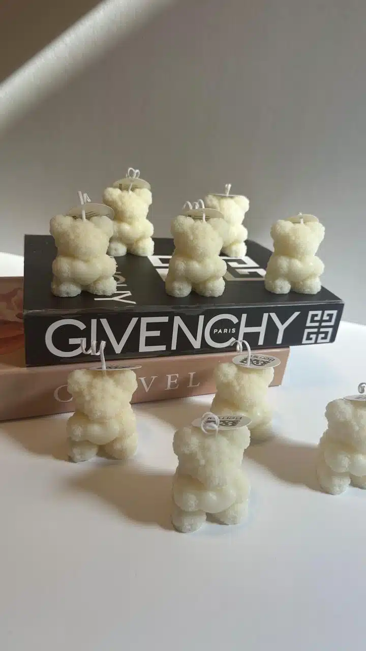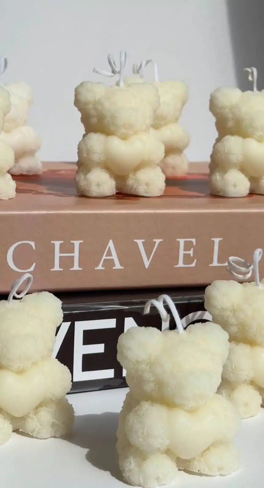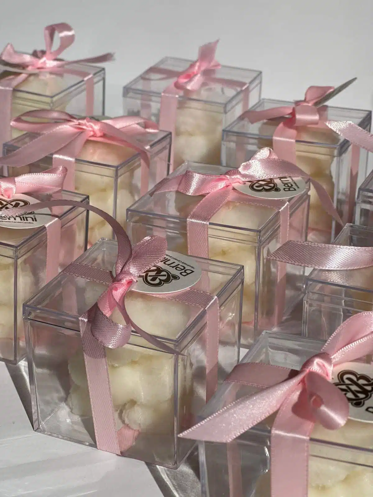 Scented Teddy bear candle enclosed in a beautiful acrylic box; wrapped with baby gender ribbons.
