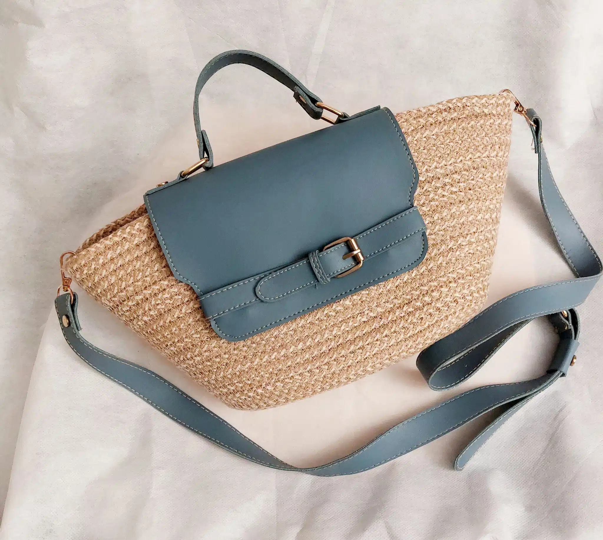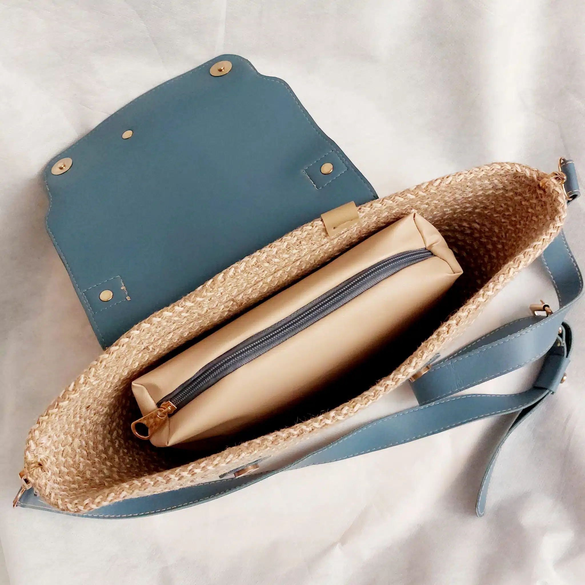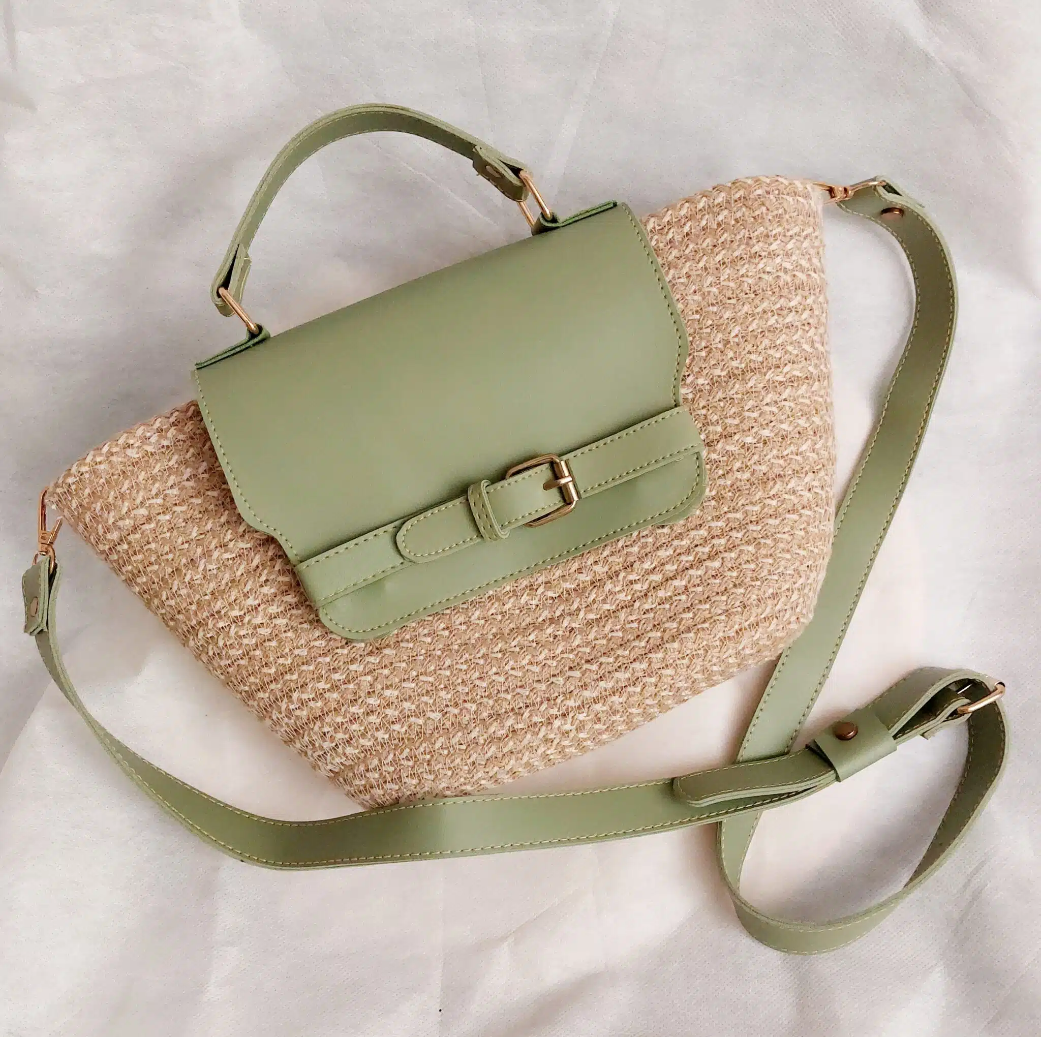 The bag features a beautifully textured and durable jute body in a warm, natural beige, evoking a sense of grounded tranquility and artisanal craftsmanship. This rustic foundation is perfectly complemented by a sleek sage green faux leather flap and sturdy top handle, creating a sophisticated color contrast that instantly elevates your look.
