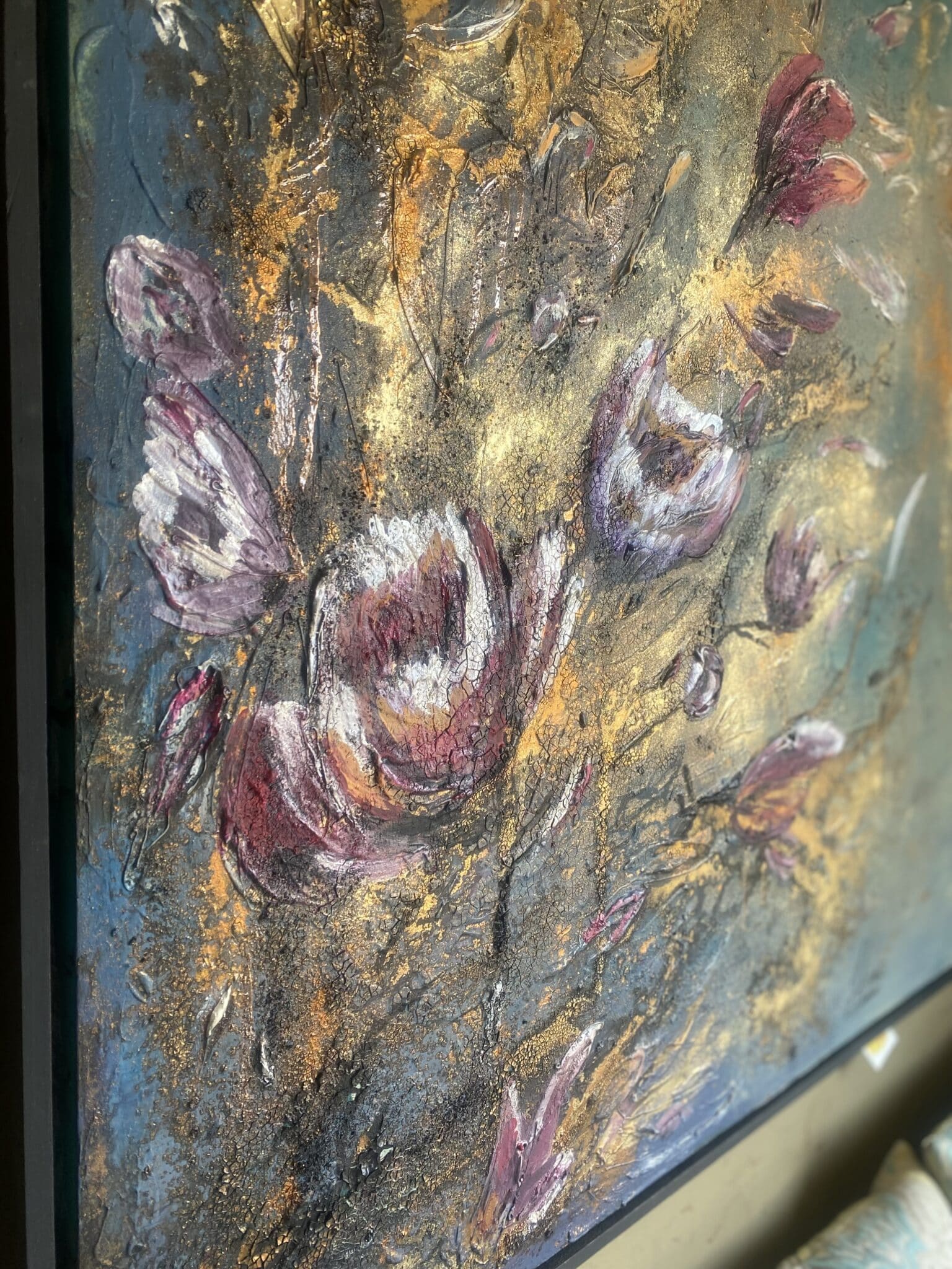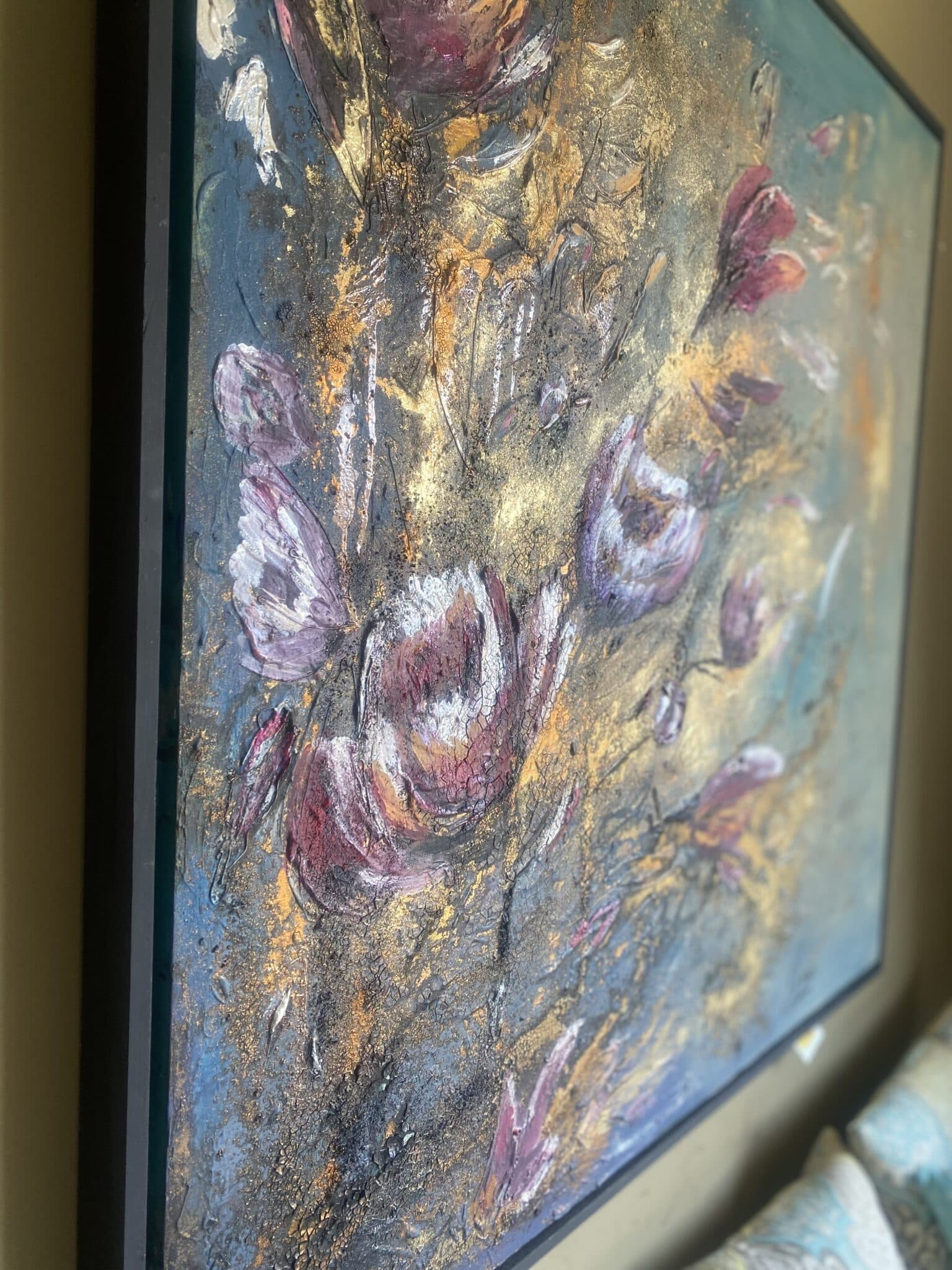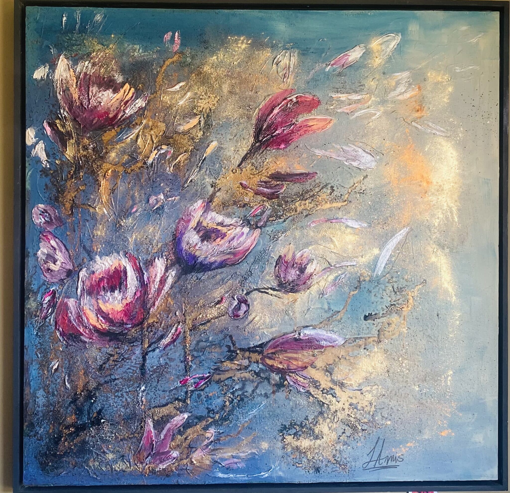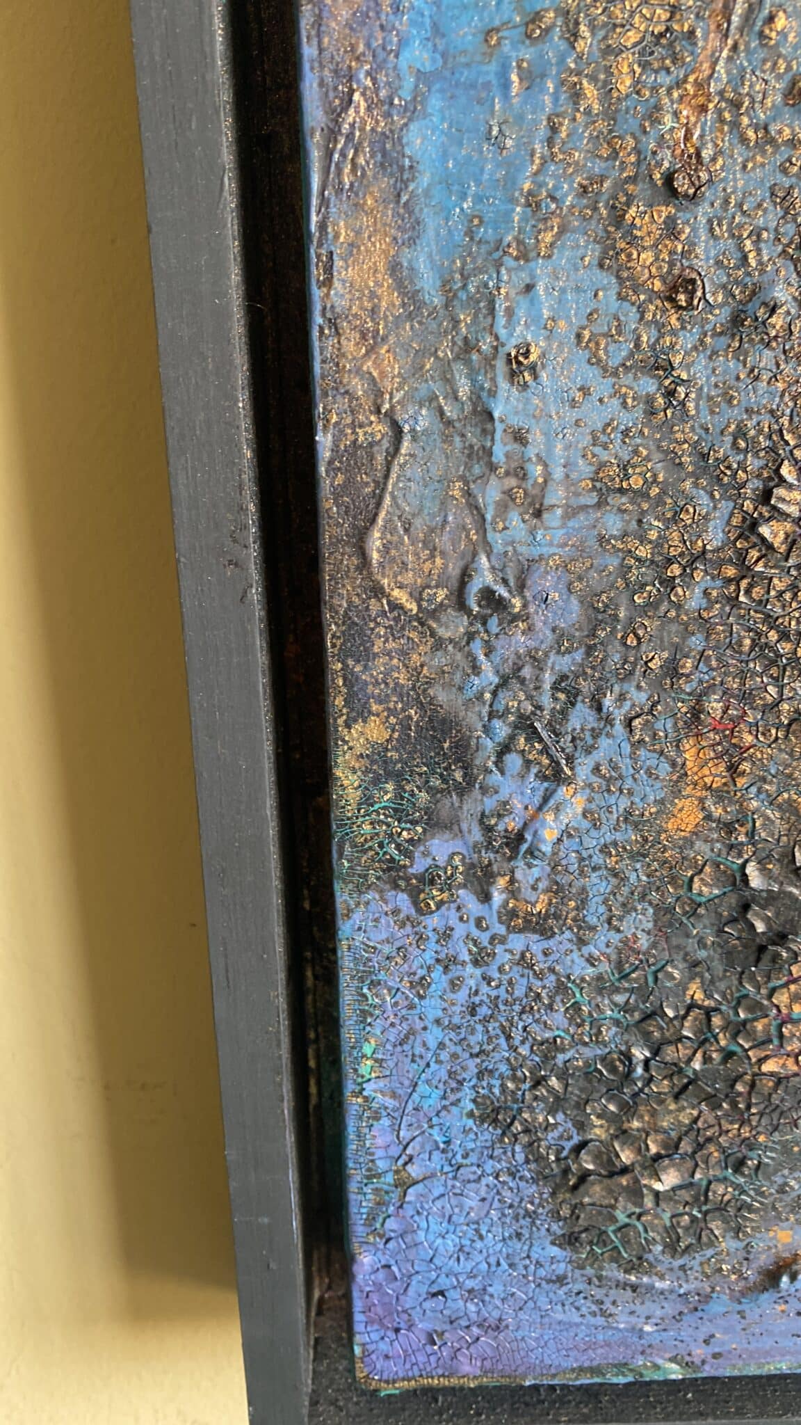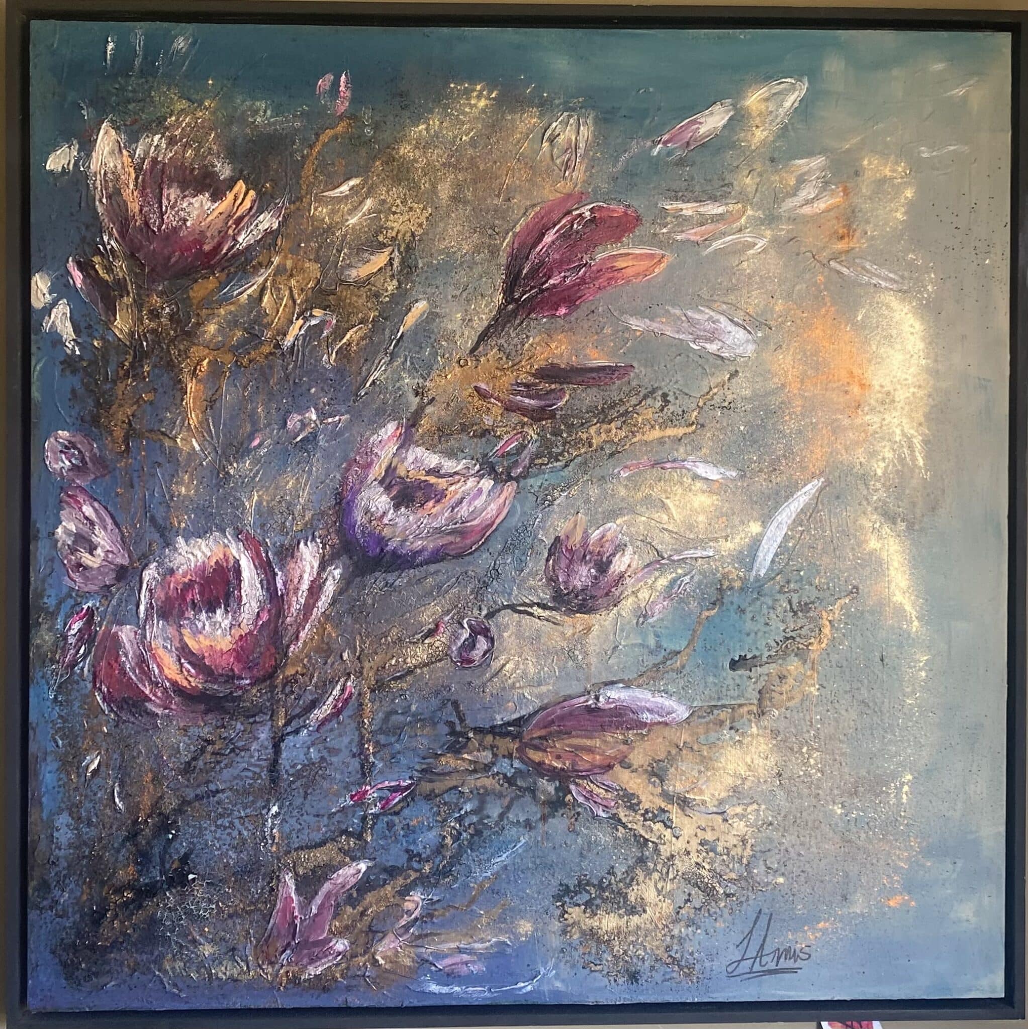 Mixed media (acrylic, paste, gold powder and another materials ) on canvas size(100×100)cm. Texture painting with black frame.