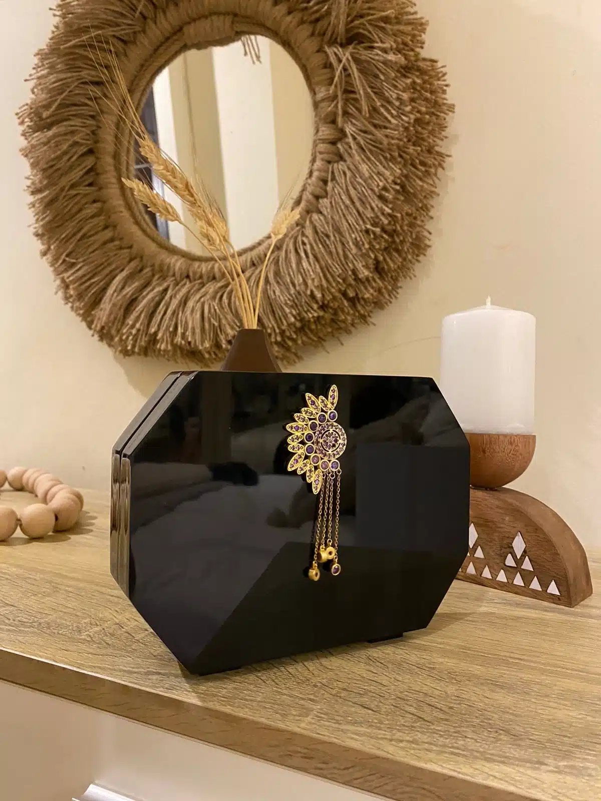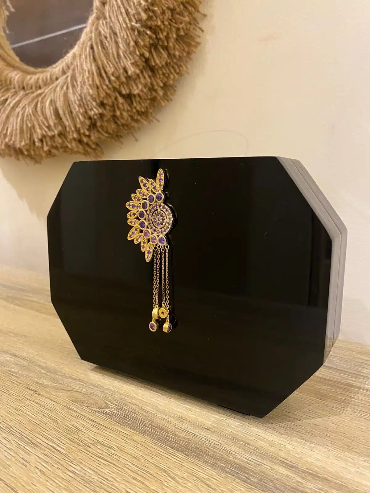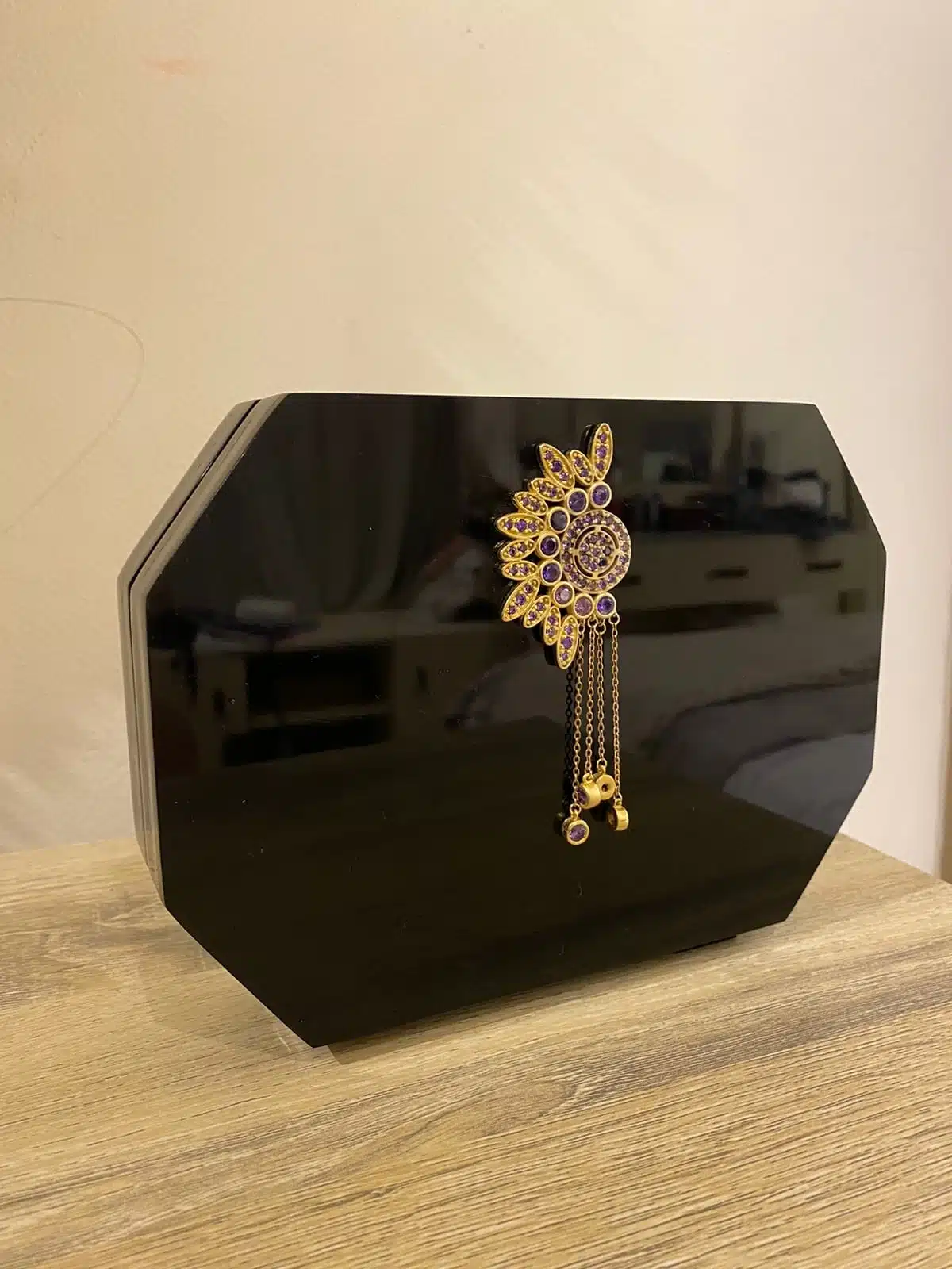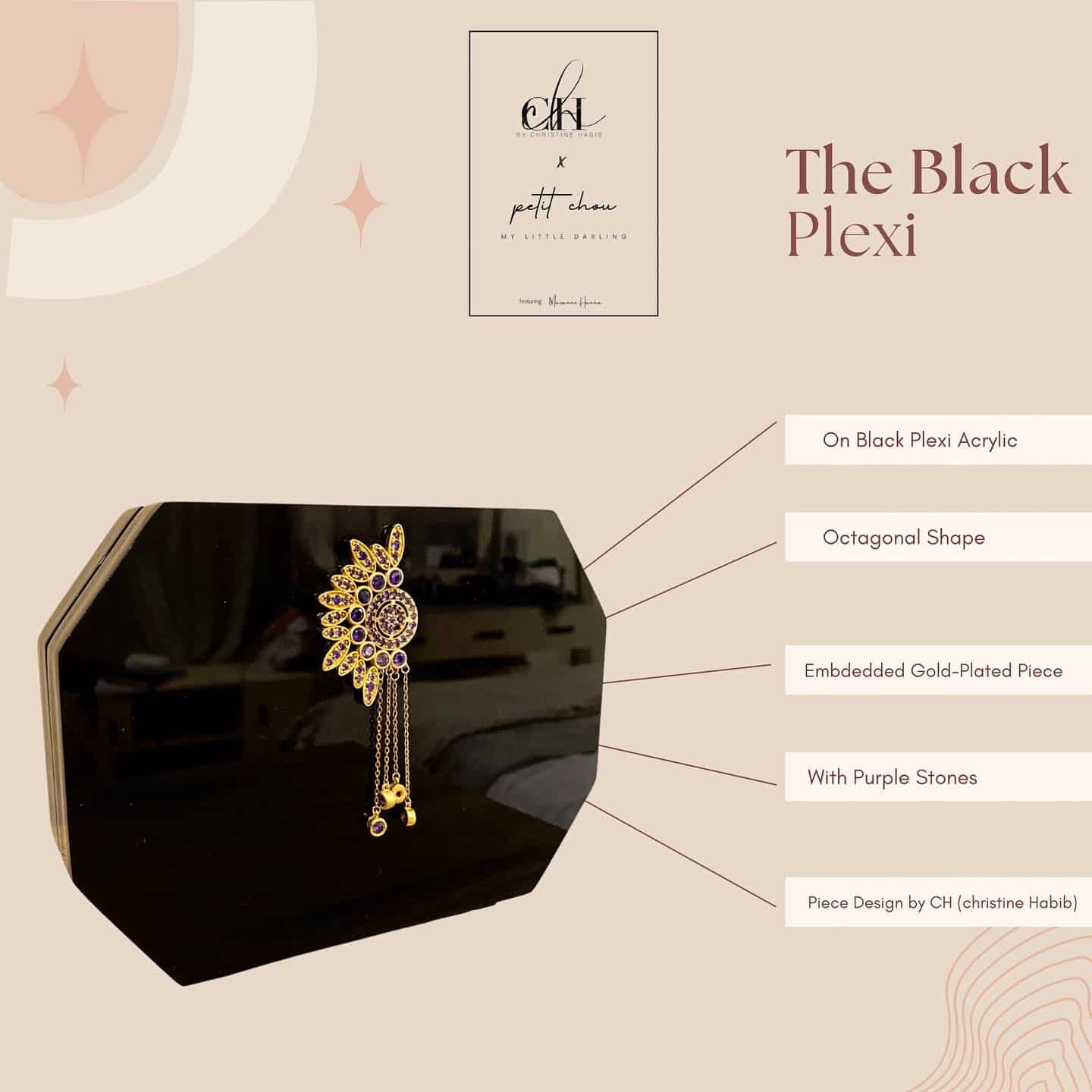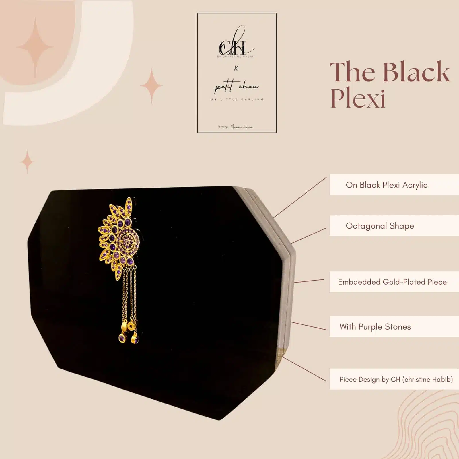 The Black Plexi Octagonal Box, made out of Black Acrylic Plexi Material, with our embedded signature yellow-gold-plated Piece by CH by Christine Habib Azer, with purple colored stones.