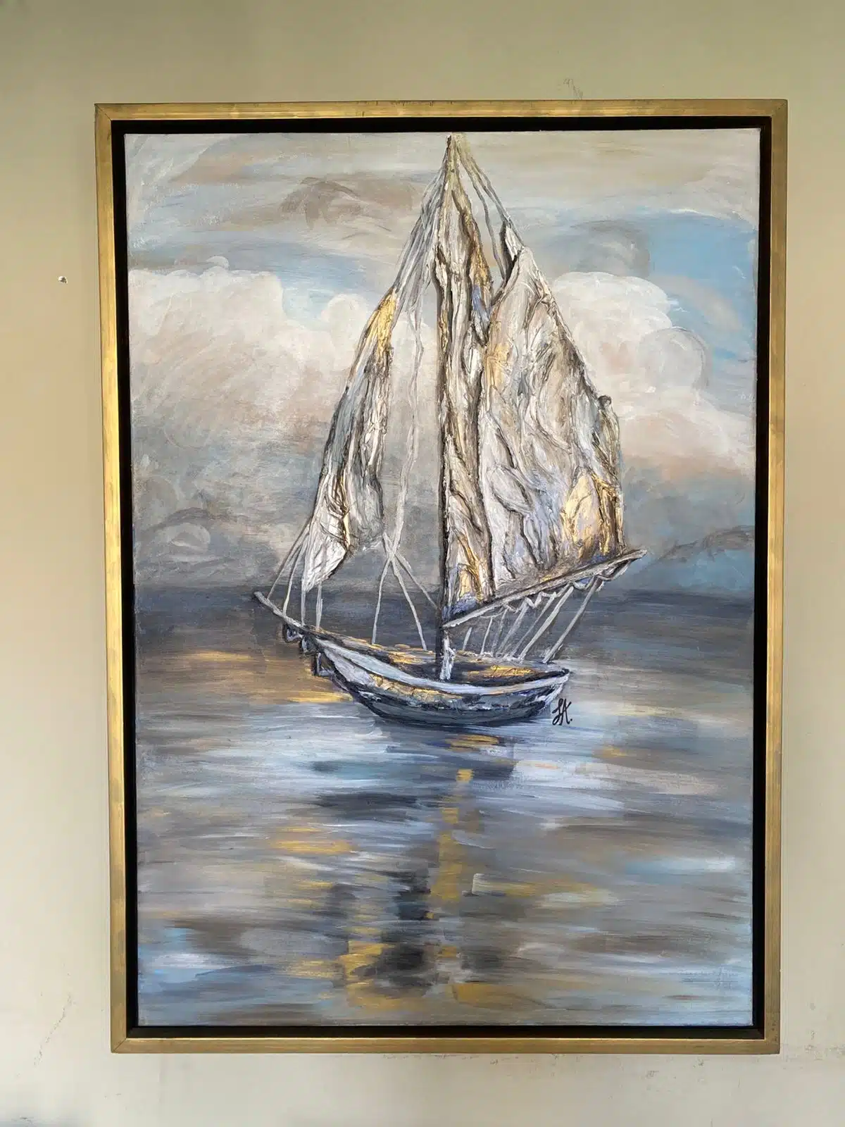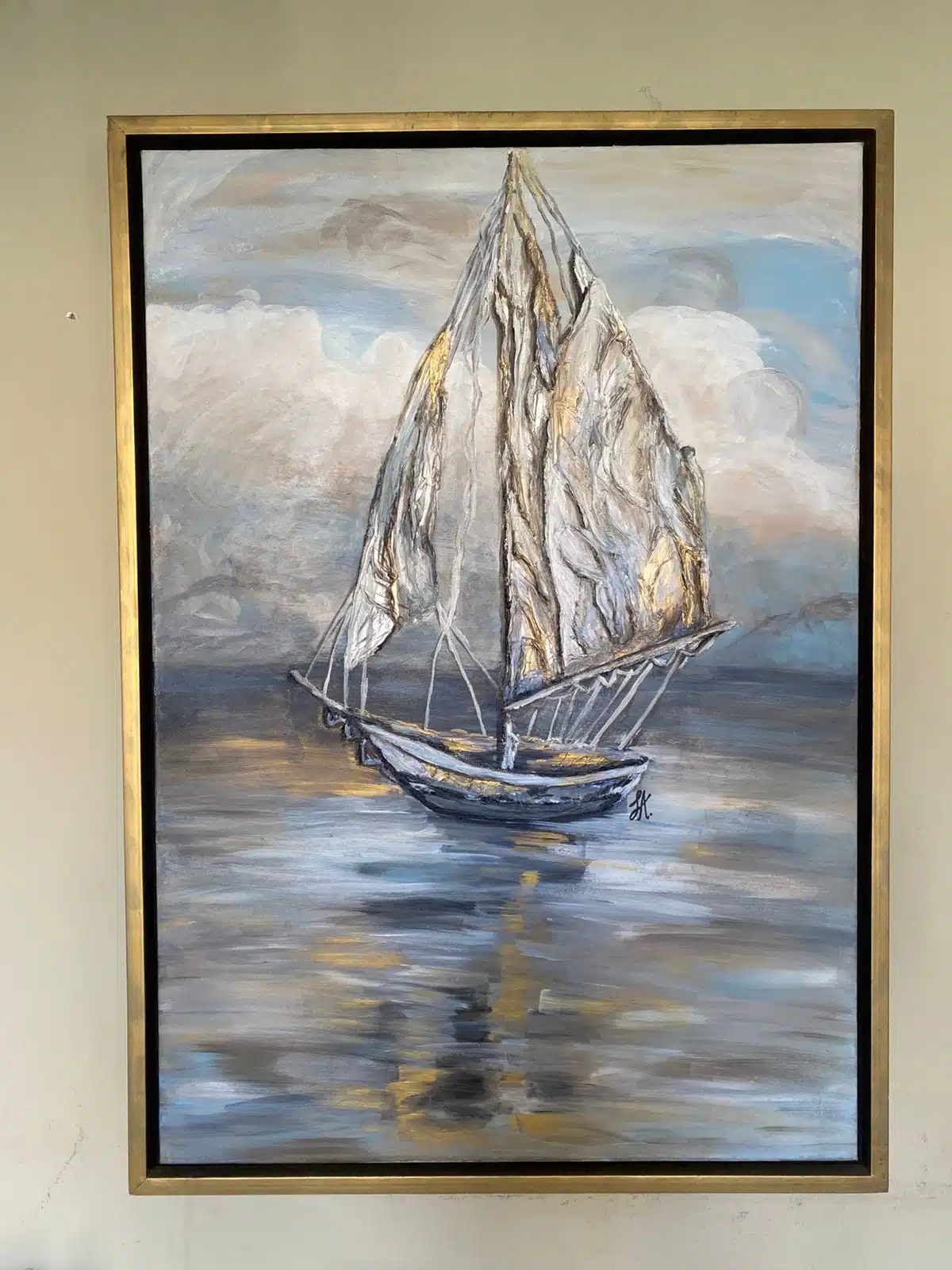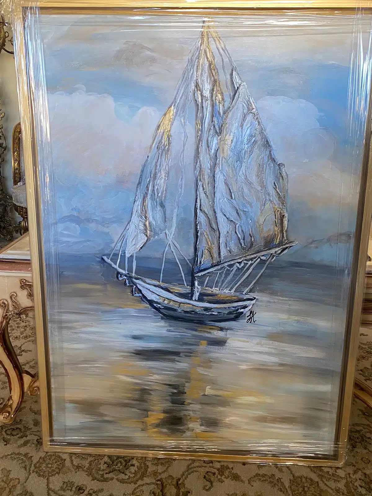 blue, white, gray and gold abstract painting with paste. With gold frame