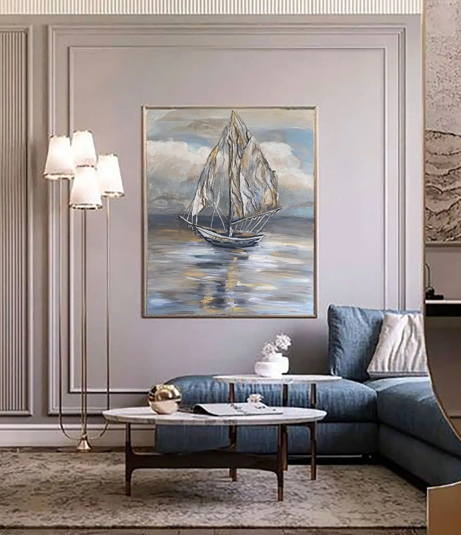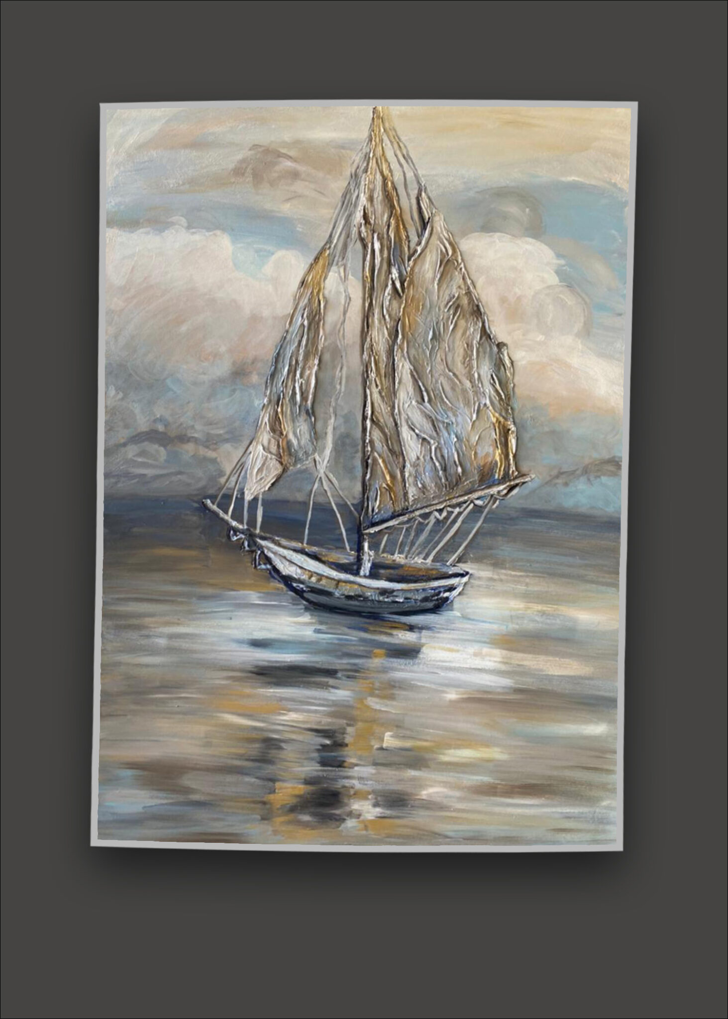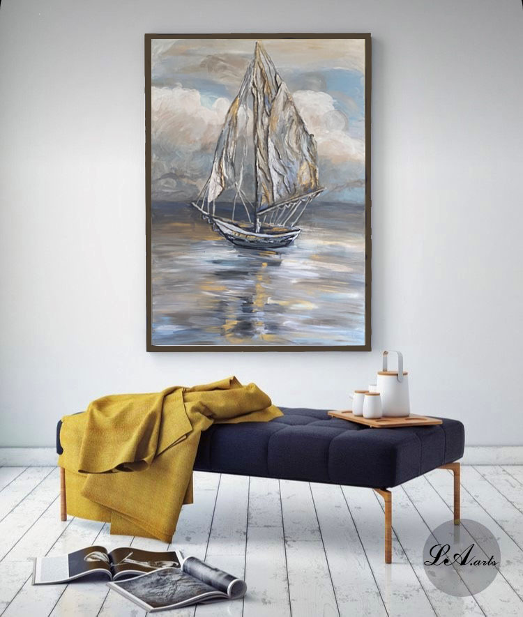 blue, white, gray and gold abstract painting with paste. With gold frame