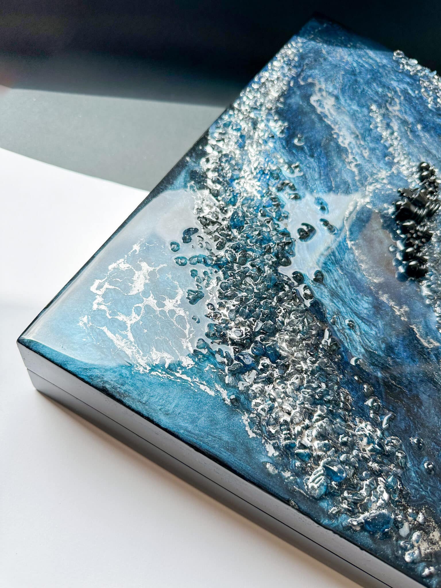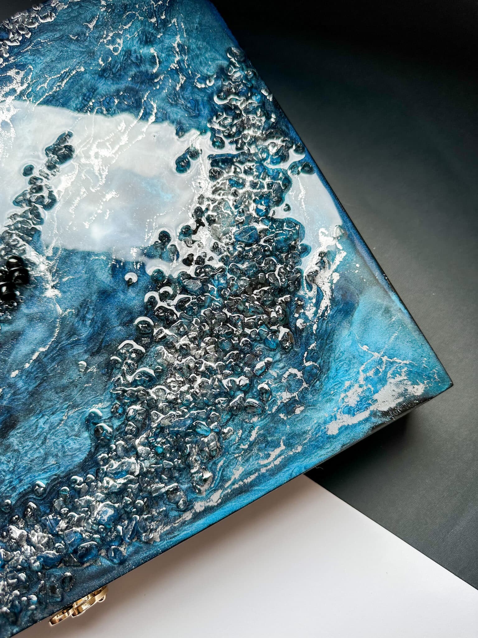 A 34×50 cm wooden case, topped with bespoke resin marble art—designed to be as stunning as a luxury canvas. It’s not just packaging, it’s a display piece. A visual anchor. A gift that says “specially made for you.”