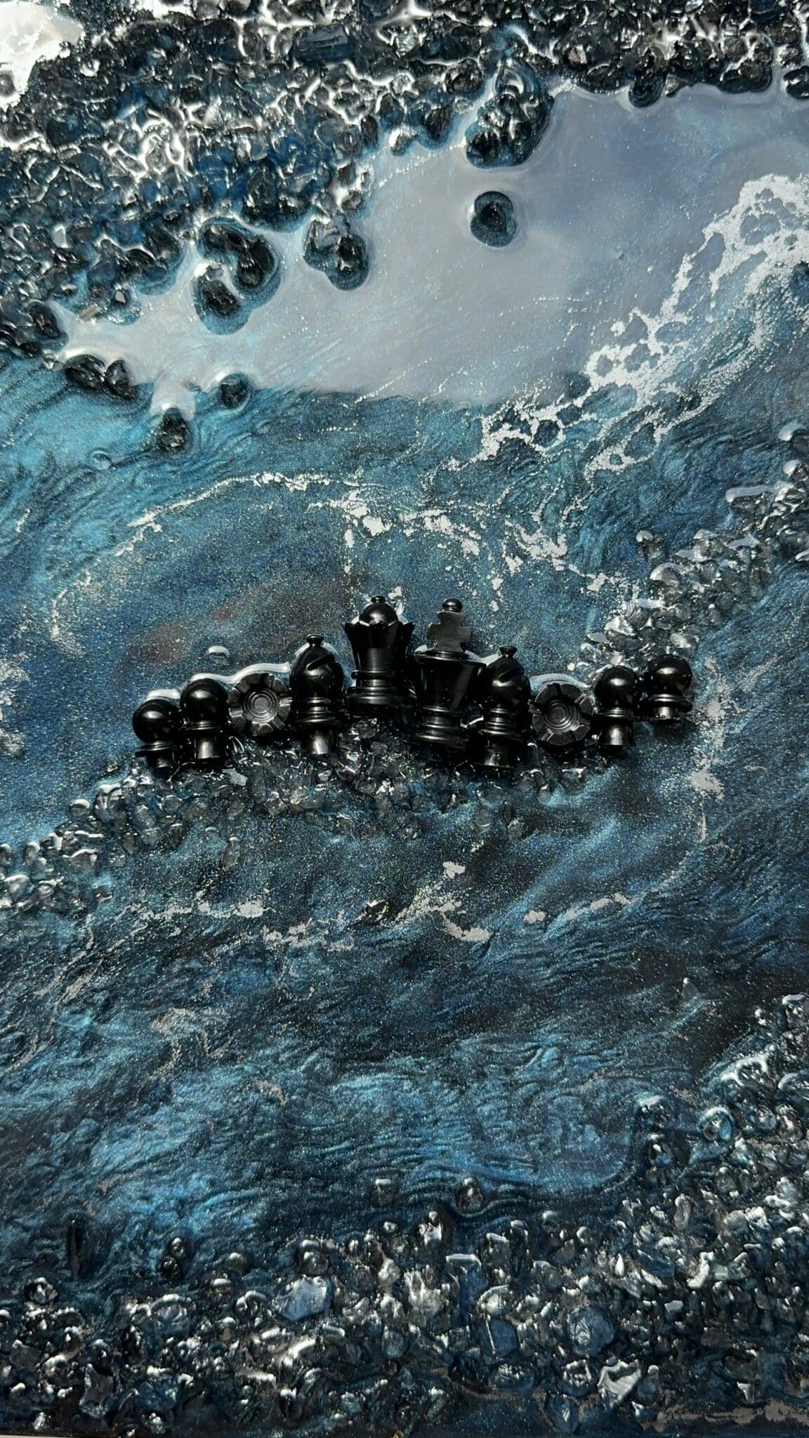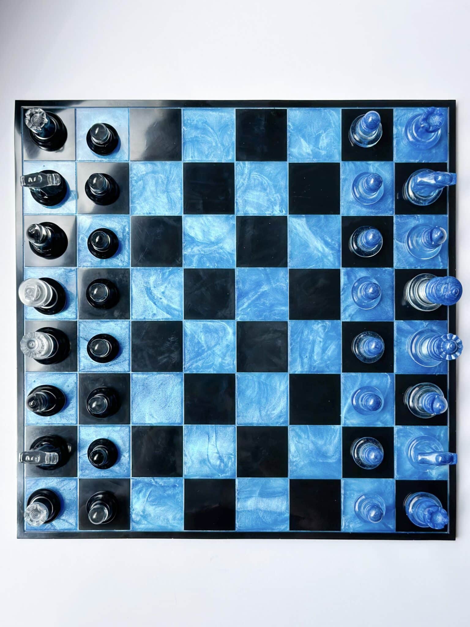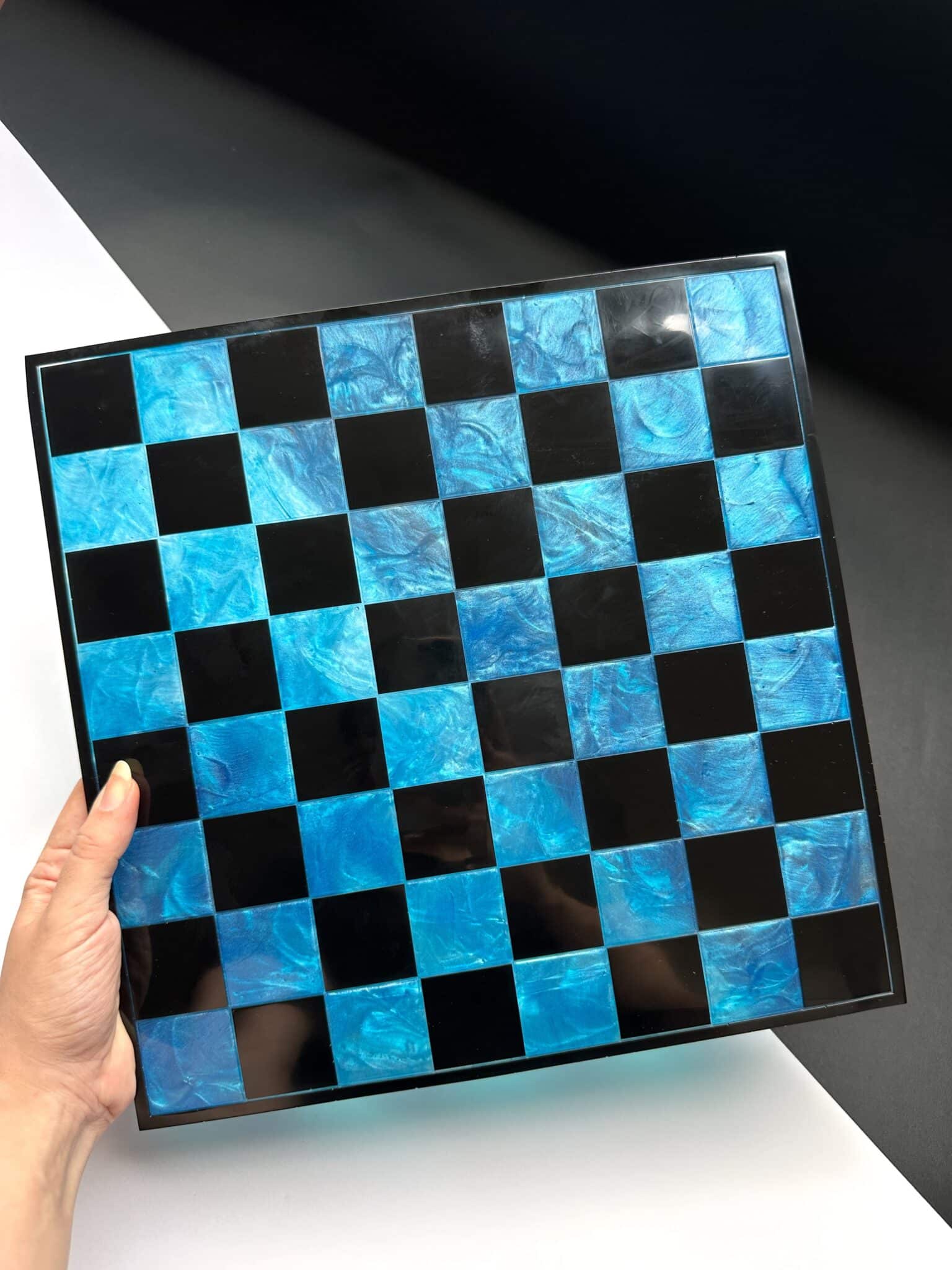 Handcrafted in layered resin, board catches light like molten glass—fluid, luminous, and alive. Swirled shades in your chosen color create a marbled, wave-like effect, with each square individually poured by hand. No two are ever alike. Every square pulses with movement. Every piece is solid, weighty, and irresistibly tactile—made to be played, cherished, and displayed.