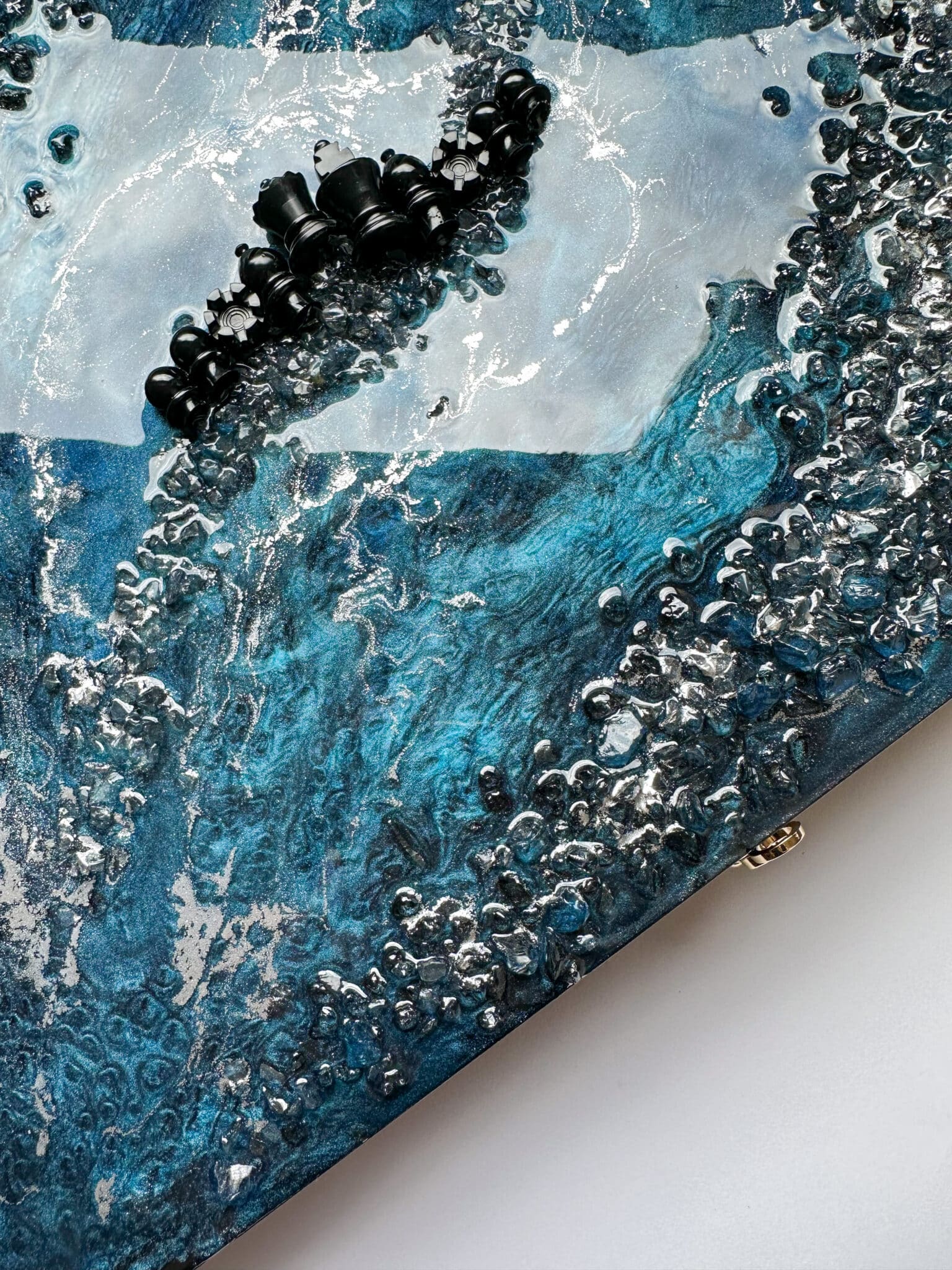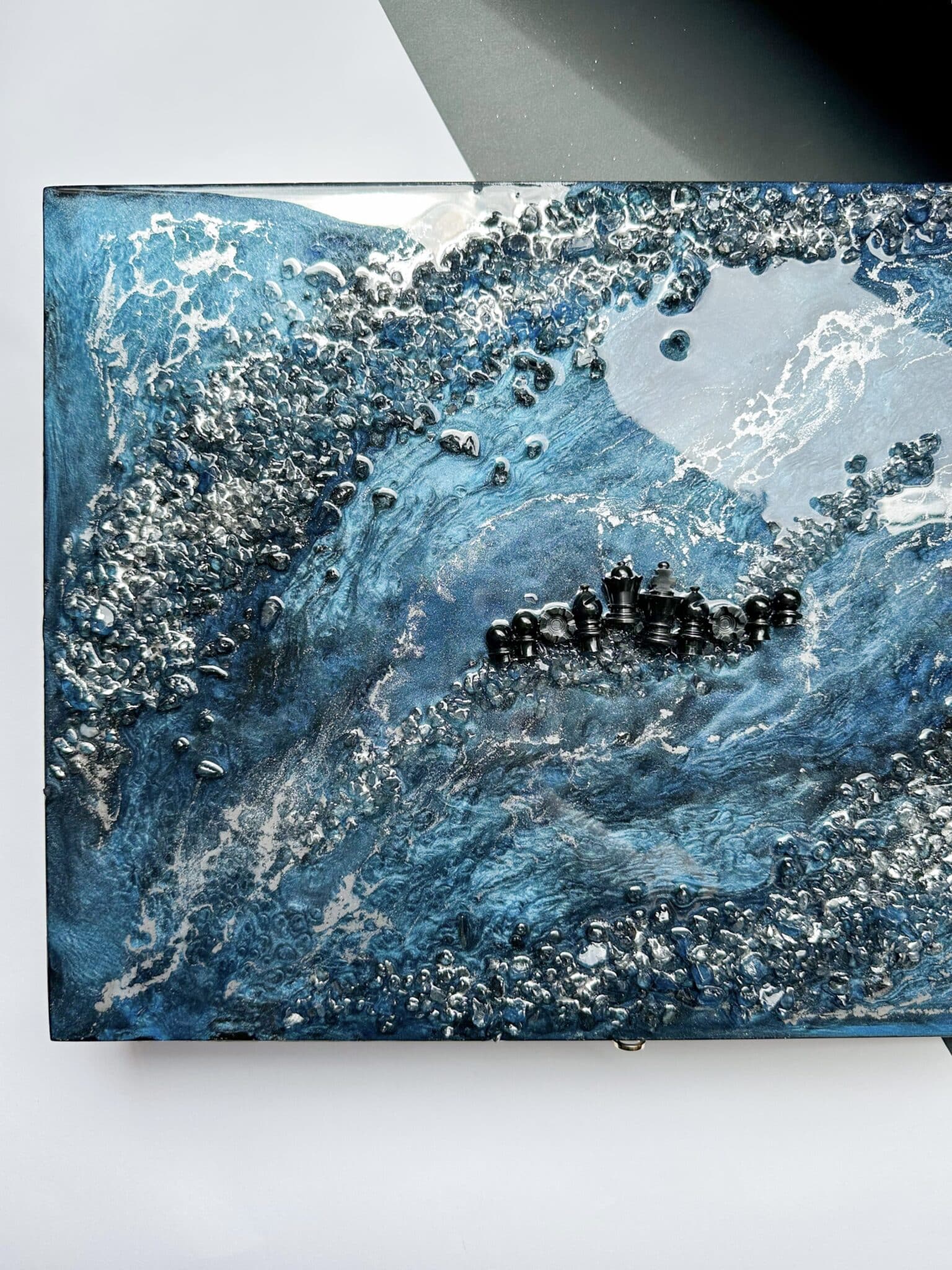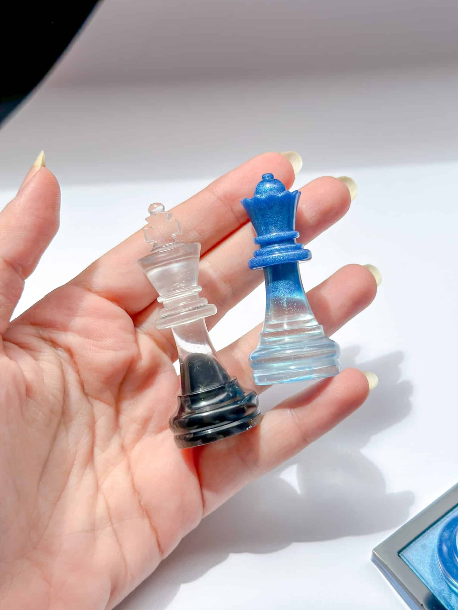 Handcrafted in layered resin, board catches light like molten glass—fluid, luminous, and alive. Swirled shades in your chosen color create a marbled, wave-like effect, with each square individually poured by hand. No two are ever alike. Every square pulses with movement. Every piece is solid, weighty, and irresistibly tactile—made to be played, cherished, and displayed.